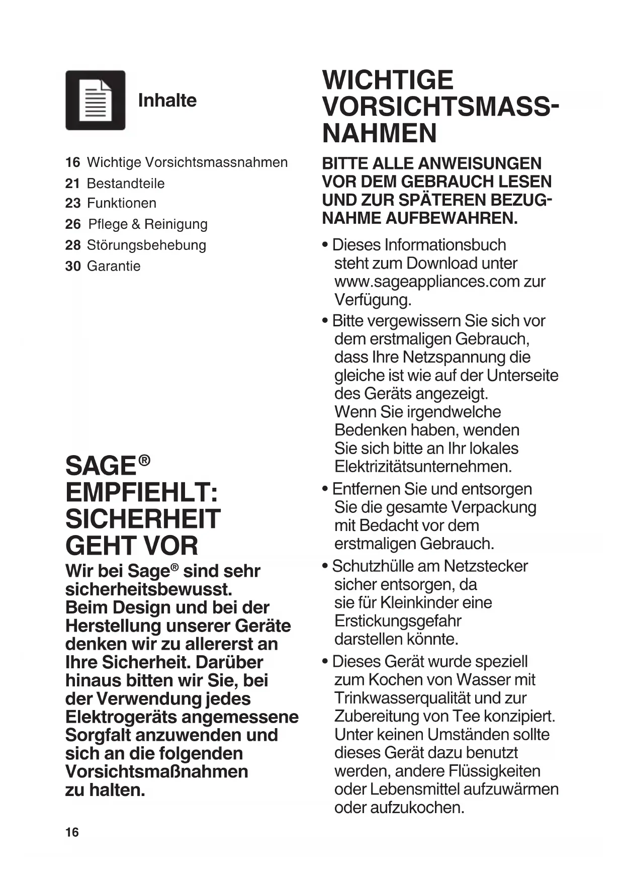 - Dieses Gerät wurde speziell zum Kochen von Wasser mit Trinkwasserqualität und zur Zubereitung von Tee konzipiert. Unter keinen Umständen sollte dieses Gerät dazu benutzt werden, andere Flüssigkeiten oder Lebensmittel aufzuwärmen oder aufzukochen. Inhalte 16 Wichtige Vorsichtsmassnahmen21 Bestandteile23 Funktionen26 Pege & Reinigung28 Störungsbehebung30 Garantie SAGE