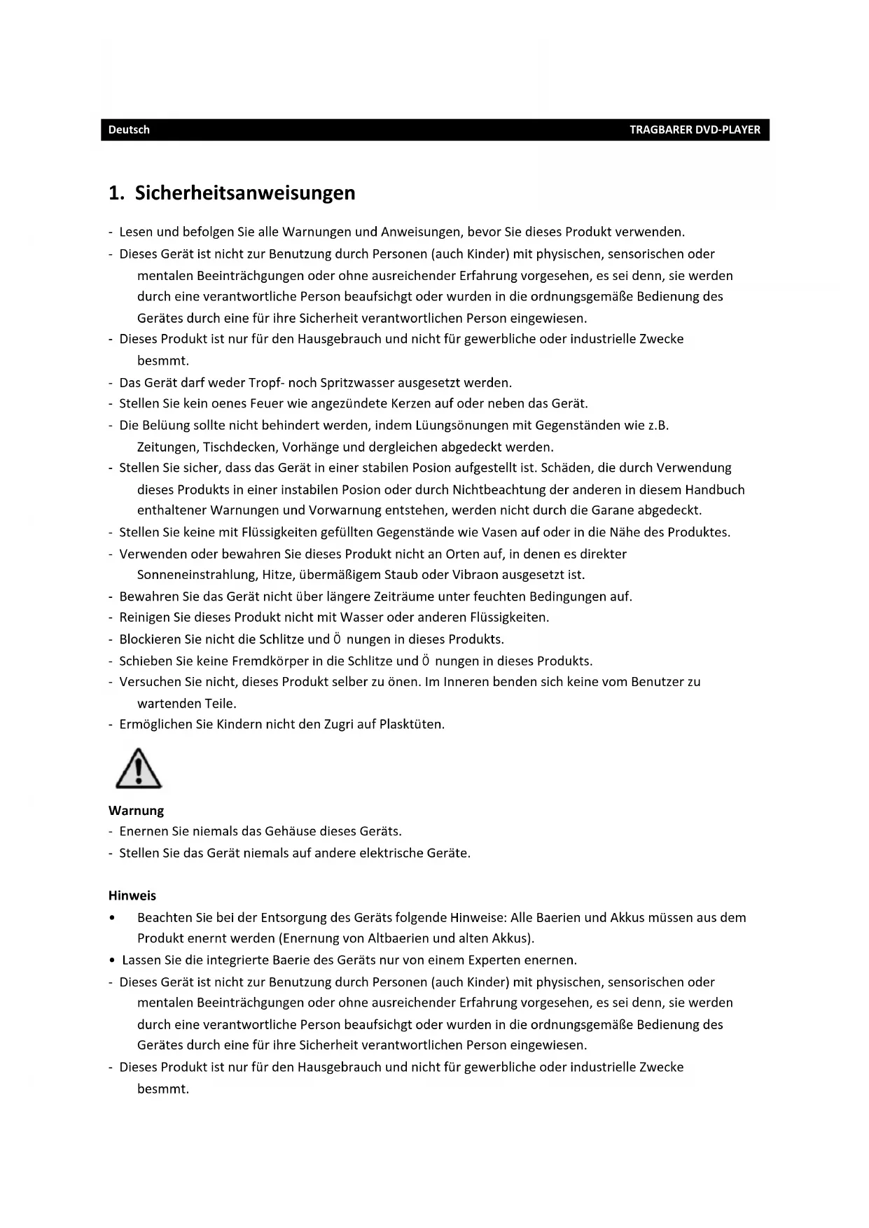 - Lesen und befolgen Sie alle Warnungen und Anweisungen, bevor Sie dieses Produkt verwenden. - Dieses Gerät ist nicht zur Benutzung durch Personen (auch Kinder) mit physischen, sensorischen oder mentalen Beeinträchtigungen oder ohne ausreichender Erfahrung vorgesehen, es sei denn, sie werden durch eine verantwortliche Person beaufsichtigt oder wurden in die ordnungsgemäße Bedienung des Gerätes durch eine für ihre Sicherheit verantwortlichen Person eingewiesen. - Dieses Produkt ist nur für den Hausgebrauch und nicht für gewerbliche oder industrielle Zwecke bestimmt. - Das Gerät darf weder Tropf- noch Spritzwasser ausgesetzt werden. - Stellen Sie kein offenes Feuer wie angezündete Kerzen auf oder neben das Gerät. - Die Belüftung sollte nicht behindert werden, indem Lüftungsöffnungen mit Gegenständen wie z.B. Zeitungen, Tischdecken, Vorhänge und dergleichen abgedeckt werden. - Stellen Sie sicher, dass das Gerät in einer stabilen Position aufgestellt ist. Schäden, die durch Verwendung dieses Produkts in einer instabilen Position oder durch Nichtbeachtung der anderen in diesem Handbuch enthaltener Warnungen und Vorwarnung entstehen, werden nicht durch die Garantie abgedeckt. - Stellen Sie keine mit Flüssigkeiten gefüllten Gegenstände wie Vasen auf oder in die Nähe des Produktes. - Verwenden oder bewahren Sie dieses Produkt nicht an Orten auf, in denen es direkter Sonneneinstrahlung, Hitze, übermäßigem Staub oder Vibration ausgesetzt ist. - Bewahren Sie das Gerät nicht über längere Zeiträume unter feuchten Bedingungen auf. - Reinigen Sie dieses Produkt nicht mit Wasser oder anderen Flüssigkeiten. - Blockieren Sie nicht die Schlitze und Ö ffnungen in dieses Produkts. - Schieben Sie keine Fremdkörper in die Schlitze und Ö ffnungen in dieses Produkts. - Versuchen Sie nicht, dieses Produkt selber zu öffnen. Im Inneren befinden sich keine vom Benutzer zu wartenden Teile. - Ermöglichen Sie Kindern nicht den Zugriff auf Plastiktüten. Warnung - Entfernen Sie niemals das Gehäuse dieses Geräts. - Stellen Sie das Gerät niemals auf andere elektrische Geräte. Hinweis