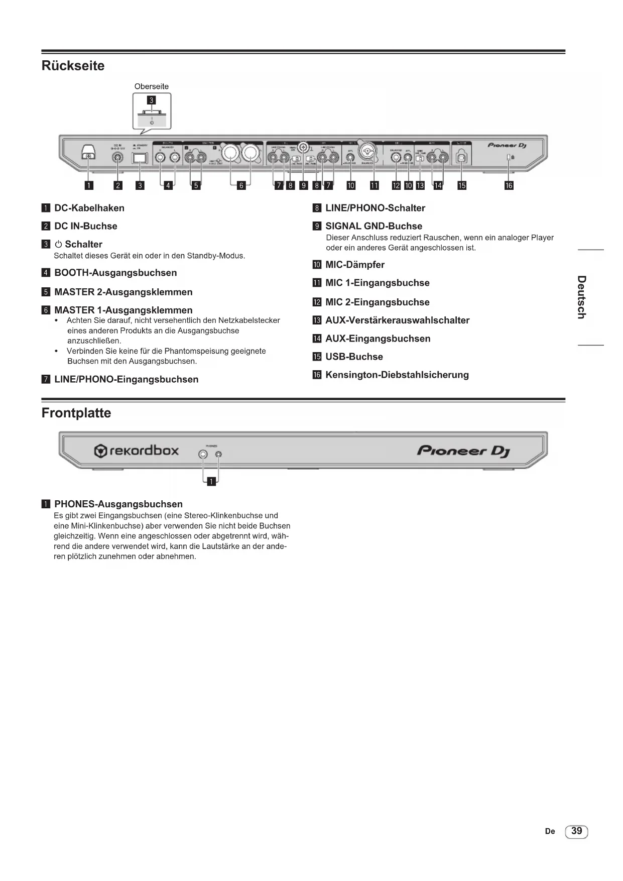 Oberseite 1 DC-Kabelhaken2 DC IN-Buchse3 u SchalterSchaltet dieses Gerät ein oder in den Standby-Modus.4 BOOTH-Ausgangsbuchsen5 MASTER 2-Ausgangsklemmen6 MASTER 1-Ausgangsklemmen ! Achten Sie darauf, nicht versehentlich den Netzkabelstecker eines anderen Produkts an die Ausgangsbuchse anzuschließen.! Verbinden Sie keine für die Phantomspeisung geeignete Buchsen mit den Ausgangsbuchsen.7 LINE/PHONO-Eingangsbuchsen8 LINE/PHONO-Schalter9 SIGNAL GND-BuchseDieser Anschluss reduziert Rauschen, wenn ein analoger Player oder ein anderes Gerät angeschlossen ist.a MIC-Dämpferb MIC 1-Eingangsbuchsec MIC 2-Eingangsbuchsed AUX-Verstärkerauswahlschaltere AUX-Eingangsbuchsenf USB-Buchseg Kensington-Diebstahlsicherung Frontplatte