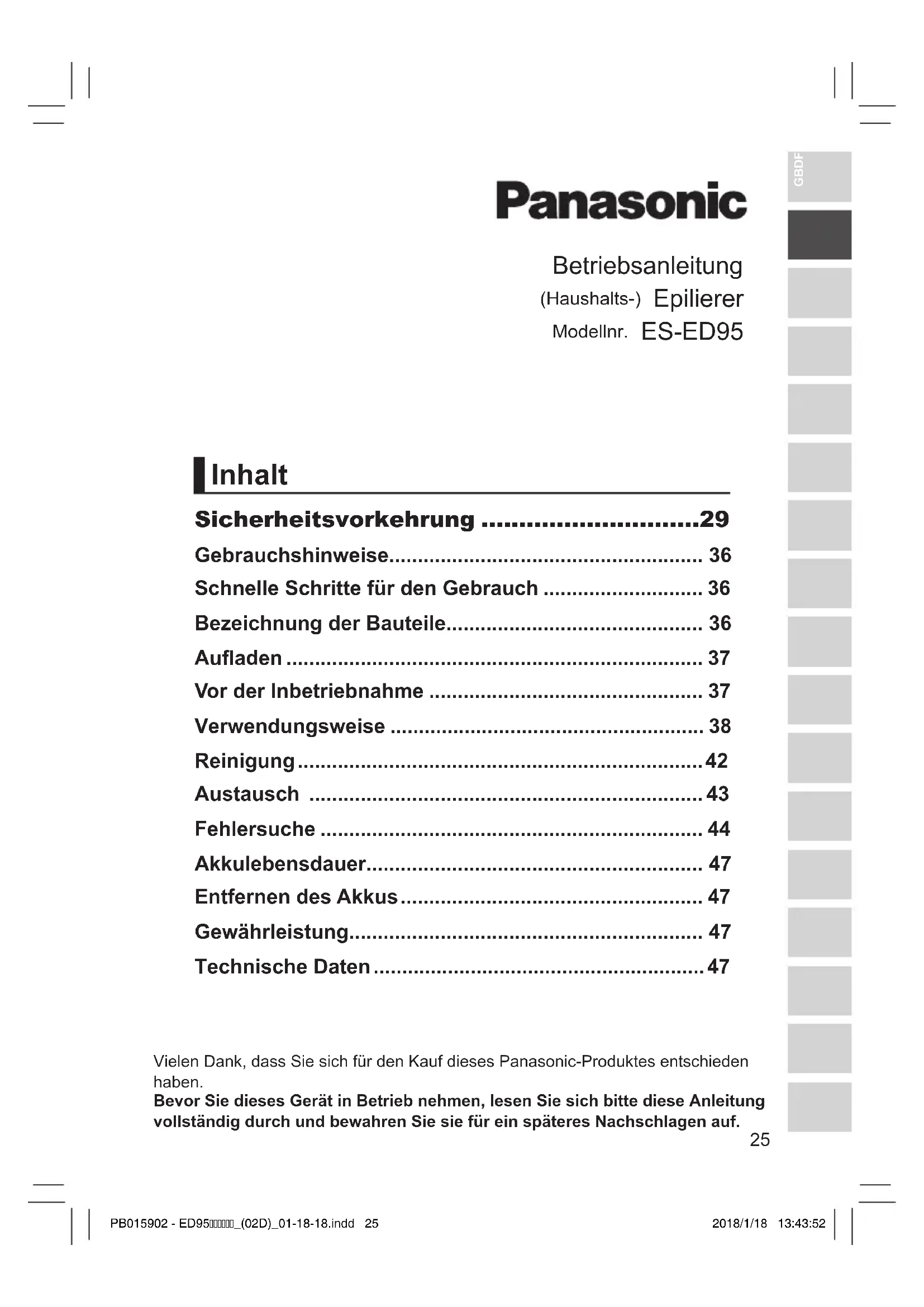 - Achten Sie darauf, die Plus- und Minuskontakte des entfernten Akkus nicht kurzzuschließen, und isolieren Sie die Kontakte, indem Sie Klebeband darüber kleben. Umweltschutz und Recycling Dieses Epiliergerät enthält einen Lithium-Ionen-Akku. Stellen Sie bitte sicher, dass Sie denAkkuaneinemofzielldafür vorgesehenen Ort entsorgen, wenn ein solcher in Ihrem Land vorhanden ist. Gewährleistung Wenn Sie Informationen benötigen oder das Kabel beschädigt wird, besuchen Sie die Webseite von Panasonic http://www.panasonic.com oder setzen Sie sich mit einem autorisierten Kundendienstbetrieb in Verbindung. (Sie ndendiejeweiligenAdressenaufdem europaweit gültigen Garantieschein.) Technische Daten Stromversorgung Siehe Etikett auf dem Netzadapter. (Automatische Spannungsanpassung) Ladedauer Etwa 1 Stunde Durch die Luft übertragener akustischer Schall Epilieraufsatz für Beine/ Arme: 69 (dB (A) bei 1 pW) Epilieraufsatz für Achseln/Bikinizone: 67 (dB (A) bei 1 pW) Rasieraufsatz: 61 (dB (A) bei 1 pW) Fußpegeaufsatz: 66 (dB (A) bei 1 pW) Bürstenaufsatz mit Sonic-Peeling-Bürste: 65 (dB (A) bei 1 pW) Dieses Gerät ist ausschließlich für die private Verwendung vorgesehen. PB015902 - ED95_(02D)_01-18-18.indd 47 2018/1/18 13:43:5648 Entsorgung von Altgeräten und Batterien Nur für die Europäische Union und Länder mit Recyclingsystemen Dieses Symbol, auf den Produkten, der Verpackung und/oder den Begleitdokumenten, bedeutet, dass gebrauchte elektrische und elektronische Produkte sowie Batterien nicht in den allgemeinen Hausmüll gegeben werden dürfen. Bitte führen Sie alte Produkte und verbrauchte Batterien zur Behandlung, Aufarbeitung bzw. zum Recycling gemäß den gesetzlichen Bestimmungen den zuständigen Sammelpunkten zu. Endnutzer sind in Deutschland gesetzlich zur Rückgabe von AltbatterienaneinergeeignetenAnnahmestelleverpichtet. Batterien können im Handelsgeschäft unentgeltlich zurückgegeben werden. Indem Sie diese Produkte und Batterien ordnungsgemäß entsorgen, helfen Sie dabei, wertvolle Ressourcen zu schützen und eventuelle negative Auswirkungen auf die menschliche Gesundheit und die Umwelt zu vermeiden. Für mehr Informationen zu Sammlung und Recycling, wenden Sie sich bitte an Ihren örtlichen Abfallentsorgungsdienstleister. Gemäß Landesvorschriften können wegen nicht ordnungsgemäßer Entsorgung dieses Abfalls Strafgelder verhängt werden. Hinweis für das Batteriesymbol (Symbol unten) Dieses Symbol kann in Kombination mit einem chemischen Symbol abgebildet sein. In diesem Fall erfolgt dieses auf Grund der Anforderungen derjenigen Richtlinien, die für die betreffende Chemikalie erlassen wurden. PB015902 - ED95_(02D)_01-18-18.indd 48 2018/1/18 13:43:5649 GBDFINLEDKPNSFINPLCZSKHROTR Merci d’avoir choisi ce produit Panasonic.Avant de faire fonctionner cet appareil, veuillez lire toutes les instructions et les conserver pour une utilisation ultérieure. Mode d’emploi Épilateur (domestique) Modèle No ES‑ED95 Table des matières Consignes de sécurité ..............................52 Usage prévu ................................................................... 58 Étapes rapides pour l’utilisation .................................. 58 Identication des pièces ............................................... 58 Charge ............................................................................ 59 Avant utilisation ............................................................. 60 Utilisation ....................................................................... 60 Nettoyage ....................................................................... 64 Remplacement .............................................................. 65 Dépannage ..................................................................... 66 Durée de vie de la batterie ............................................ 69 Extraction de la batterie rechargeable intégrée ......... 69 Garantie .......................................................................... 69 Spécications ................................................................ 69 PB015902 - ED95_(03FR)_01-18-18.indd 49 2018/1/18 14:24:3850 Avertissement