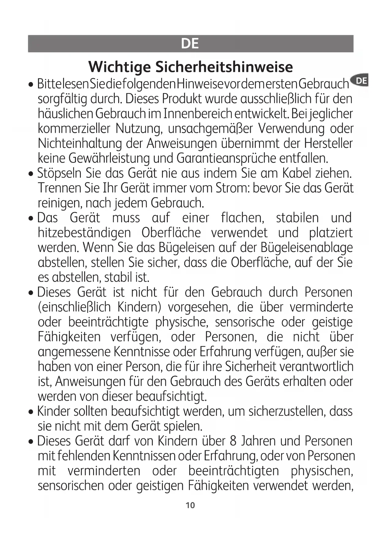 - Dieses Gerät darf von Kindern über 8 Jahren und Personen mit fehlenden Kenntnissen oder Erfahrung, oder von Personen mit verminderten oder beeinträchtigten physischen, sensorischen oder geistigen Fähigkeiten verwendet werden, DE11 sofern diese umfassend über den Gebrauch des Geräts aufgeklärt wurden, beaufsichtigt werden und die damit verbundenen Risiken verstehen. Kinder dürfen nicht mit dem Gerät spielen. Reinigung und Wartung dürfen nicht von Kindern ohne Aufsicht durchgeführt werden. Bewahren Sie das Bügeleisen und dessen Kabel außerhalb der Reichweite von Kindern unter 8 Jahren auf, wenn es angeschaltet ist oder abkühlt.