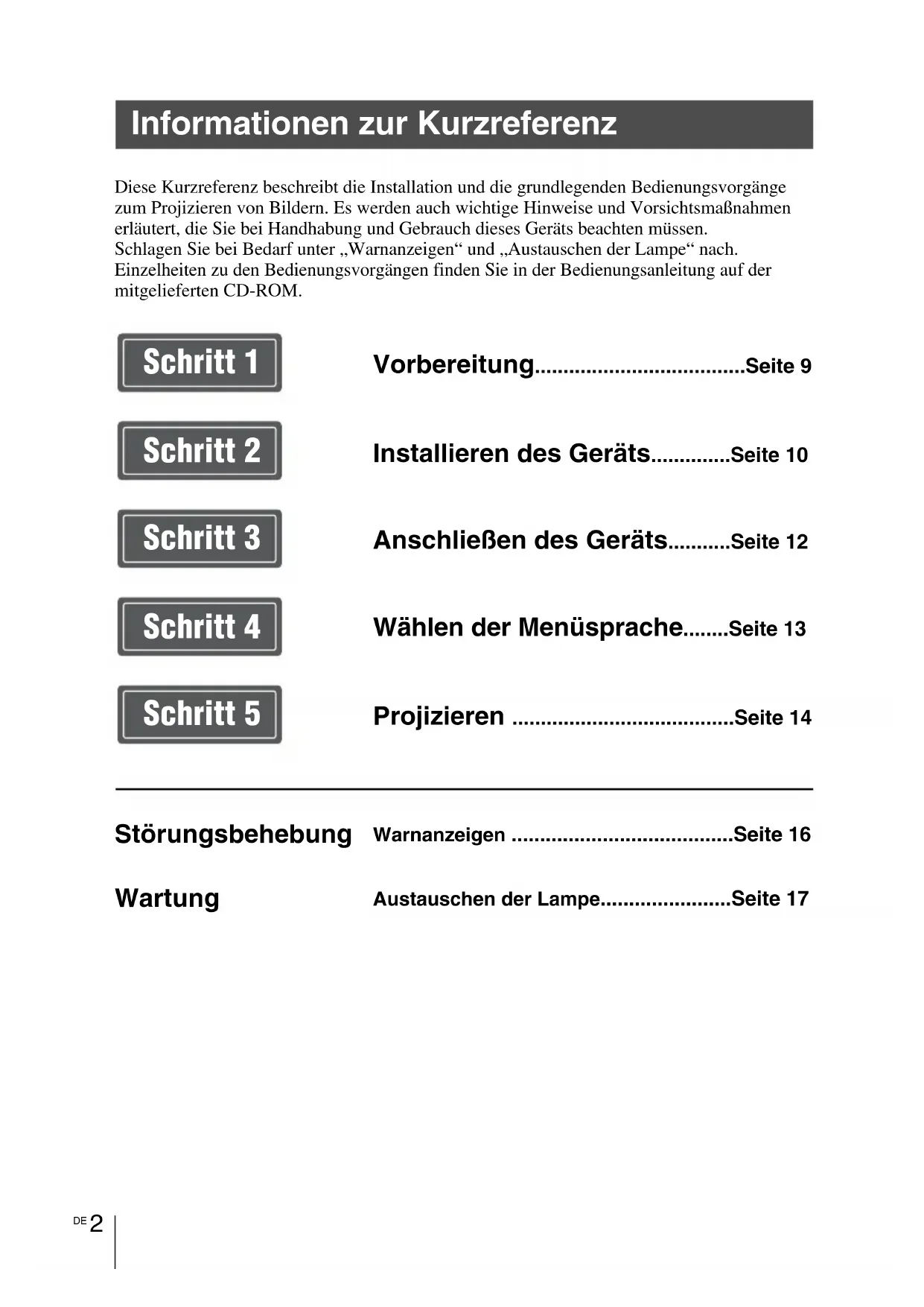 Diese Kurzreferenz beschreibt die Installation und die grundlegenden Bedienungsvorgänge zum Projizieren von Bildern. Es werden auch wichtige Hinweise und Vorsichtsmaßnahmen erläutert, die Sie bei Handhabung und Gebrauch dieses Geräts beachten müssen.Schlagen Sie bei Bedarf unter „Warnanzeigen“ und „Austauschen der Lampe“ nach.Einzelheiten zu den Bedienungsvorgängen finden Sie in der Bedienungsanleitung auf der mitgelieferten CD-ROM. Informationen zur Kurzreferenz Vorbereitung.....................................Seite 9 Installieren des Geräts..............Seite 10 Anschließen des Geräts...........Seite 12 Wählen der Menüsprache........Seite 13 Projizieren .......................................Seite 14 Störungsbehebung Warnanzeigen .......................................Seite 16 Wartung Austauschen der Lampe.......................Seite 17 Schritt 1 Schritt 2 Schritt 3 Schritt 4 Schritt 53