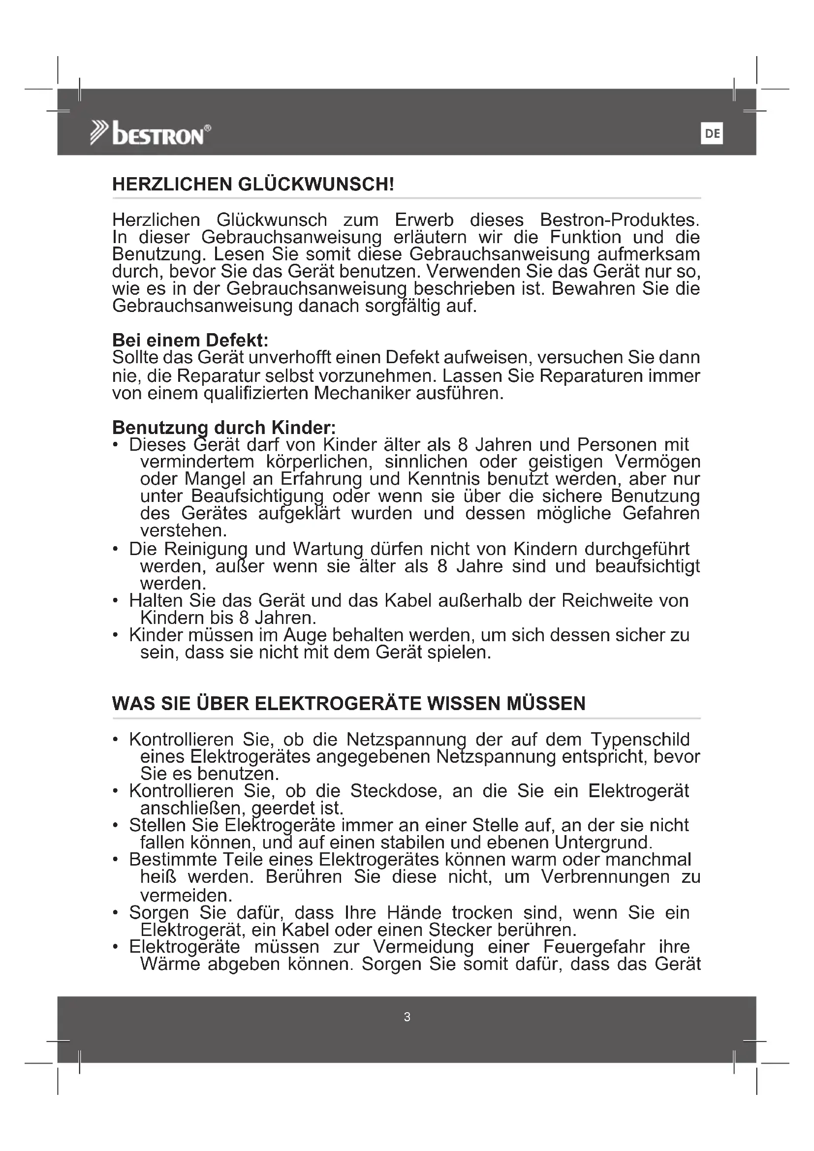 Herzlichen Glückwunsch zum Erwerb theses Bestron-Produktes. In dieser Gebrauchsanweisung erläutern wir die Funktion und die Benutzung. Lesen Sie somit diese Gebrauchsanweisung aufmerksam durch, bevor Sie das Gerät benutzen. Verwenden Sie das Gerät nur so, wie es in der Gebrauchsanweisung beschreiben ist. Bewahren Sie die Gebrauchsanweisung danach sorgfältig auf.