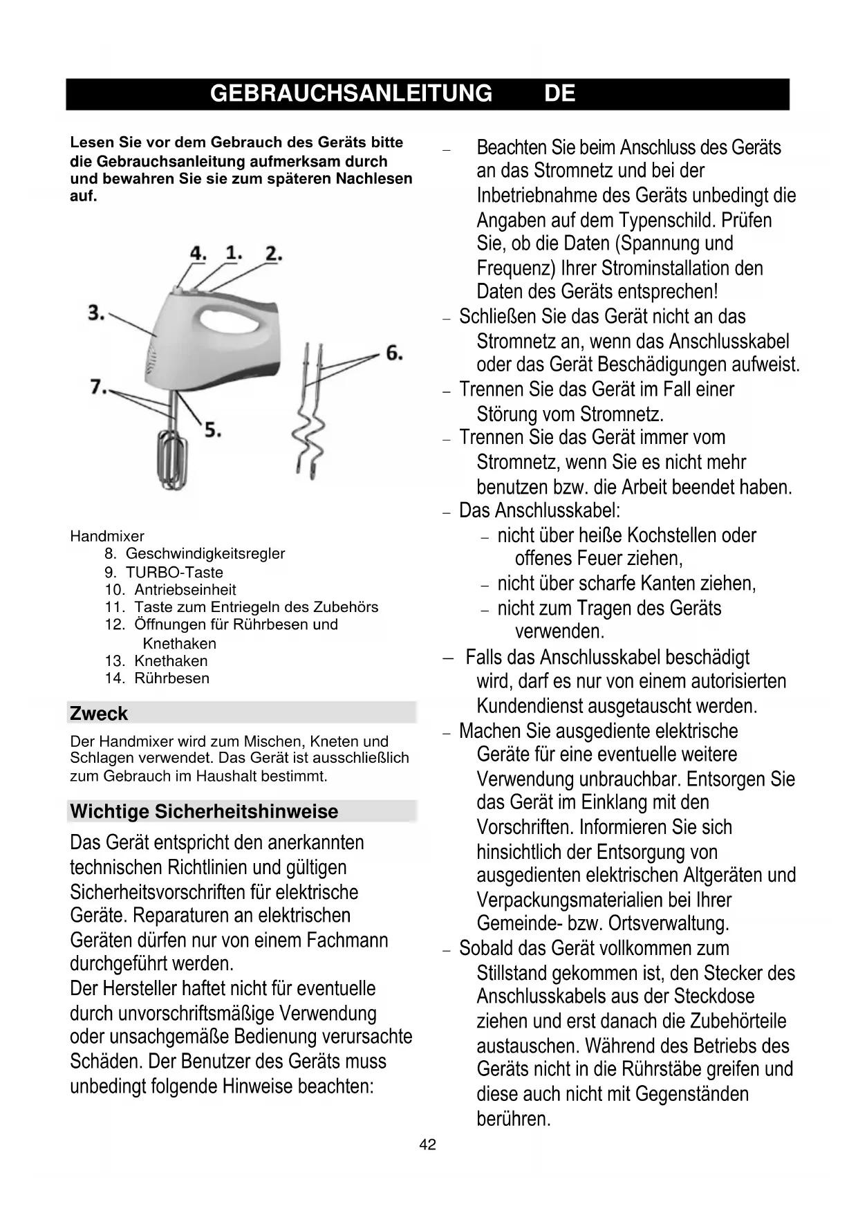 Zweck Der Handmixer wird zum Mischen, Kneten und Schlagen verwendet. Das Gerät ist ausschließlich zum Gebrauch im Haushalt bestimmt. Wichtige Sicherheitshinweise Das Gerät entspricht den anerkannten technischen Richtlinien und gültigen Sicherheitsvorschriften für elektrische Geräte. Reparaturen an elektrischen Geräten dürfen nur von einem Fachmann durchgeführt werden. Der Hersteller haftet nicht für eventuelle durch unvorschriftsmäßige Verwendung oder unsachgemäße Bedienung verursachte Schäden. Der Benutzer des Geräts muss unbedingt folgende Hinweise beachten: − Beachten Sie beim Anschluss des Geräts an das Stromnetz und bei der Inbetriebnahme des Geräts unbedingt die Angaben auf dem Typenschild. Prüfen Sie, ob die Daten (Spannung und Frequenz) Ihrer Strominstallation den Daten des Geräts entsprechen! − Schließen Sie das Gerät nicht an das Stromnetz an, wenn das Anschlusskabel oder das Gerät Beschädigungen aufweist. − Trennen Sie das Gerät im Fall einer Störung vom Stromnetz. − Trennen Sie das Gerät immer vom Stromnetz, wenn Sie es nicht mehr benutzen bzw. die Arbeit beendet haben. − Das Anschlusskabel: − nicht über heiße Kochstellen oder offenes Feuer ziehen, − nicht über scharfe Kanten ziehen, − nicht zum Tragen des Geräts verwenden. − Falls das Anschlusskabel beschädigt wird, darf es nur von einem autorisierten Kundendienst ausgetauscht werden. − Machen Sie ausgediente elektrische Geräte für eine eventuelle weitere Verwendung unbrauchbar. Entsorgen Sie das Gerät im Einklang mit den Vorschriften. Informieren Sie sich hinsichtlich der Entsorgung von ausgedienten elektrischen Altgeräten und Verpackungsmaterialien bei Ihrer Gemeinde- bzw. Ortsverwaltung. − Sobald das Gerät vollkommen zum Stillstand gekommen ist, den Stecker des Anschlusskabels aus der Steckdose ziehen und erst danach die Zubehörteile austauschen. Während des Betriebs des Geräts nicht in die Rührstäbe greifen und diese auch nicht mit Gegenständen berühren.43 − Die Rührbesen laufen ein paar Sekunden nach dem Abschalten des Geräts nach. Die Rührstäbe nicht berühren, damit Sie sich nicht verletzen. − Trennen Sie das Gerät vor dem Reinigen unbedingt vom Stromnetz. − Gebrauchen Sie das Gerät nicht im Freien. − Sorgen Sie dafür, dass Sie beim Gebrauch des Geräts trockene Hände haben. − Während des Betriebs des Geräts sollten sich Personen oder Tiere von den drehenden Teilen oder Schneiden fernhalten, da diese Verletzungen verursachen können. − Dieses Gerät darf von Kindern ab acht Jahren, wie auch von Personen mit verminderten körperlichen, sensorischen und geistigen Fähigkeiten oder mangelhaften Erfahrungen und Wissen bedient werden, jedoch nur, wenn sie das Gerät unter entsprechender Aufsicht bedienen oder entsprechende Anweisungen über den sicheren Gebrauch des Geräts erhalten haben und die mit dem Gebrauch des Geräts verbundenen Gefahren verstanden haben. − Beaufsichtigen Sie Kinder, wenn diese das Gerät gebrauchen und achten Sie darauf, dass sie nicht mit dem Gerät spielen. − Reinigung oder Benutzerwartung darf von Kindern nicht durchgeführt werden, es sei denn sie sind älter als 8 Jahre und werden dabei von einem Erwachsenen beaufsichtigt. − Schallpegel: Lc = 72 dB (A) Dieses Gerät wurde gemäß der EU- Richtlinie 2012/19/EU über elektrische und elektronische Altgeräte (Waste Electrical and Electronic Equipment - WEEE) gekennzeichnet. Diese Richtlinie legt die Anforderungen für das Sammeln und den Umgang mit ausgedienten Elektro- und Elektronikaltgeräten fest, die für die gesamte Europäische Union gültig sind. Vor dem Gebrauch Stellen Sie sicher, dass sich das Gerät in einem einwandfreien Zustand befindet, dass es nicht beschädigt oder durch Alter und übermäßigen Einsatz abgenutzt ist. Prüfen Sie, ob das Anschlusskabel beschädigt ist. Prüfen Sie den Ein-/Aus-Schalter. Prüfen Sie, ob alle Komponenten, die Sie an das Gerät anschließen möchten, Originalteile sind, die vom Hersteller empfohlen werden. Verwenden Sie mit diesem Gerät kein Zubehör von Drittherstellern! Nach dem Gebrauch Trennen Sie das Gerät immer vom Stromnetz, wenn Sie den Vorgang beendet haben und bevor Sie es ablegen. Bewahren Sie das Gerät an einem sicheren Platz auf, außerhalb der Reichweite von Kindern. Verwendung von Zubehör