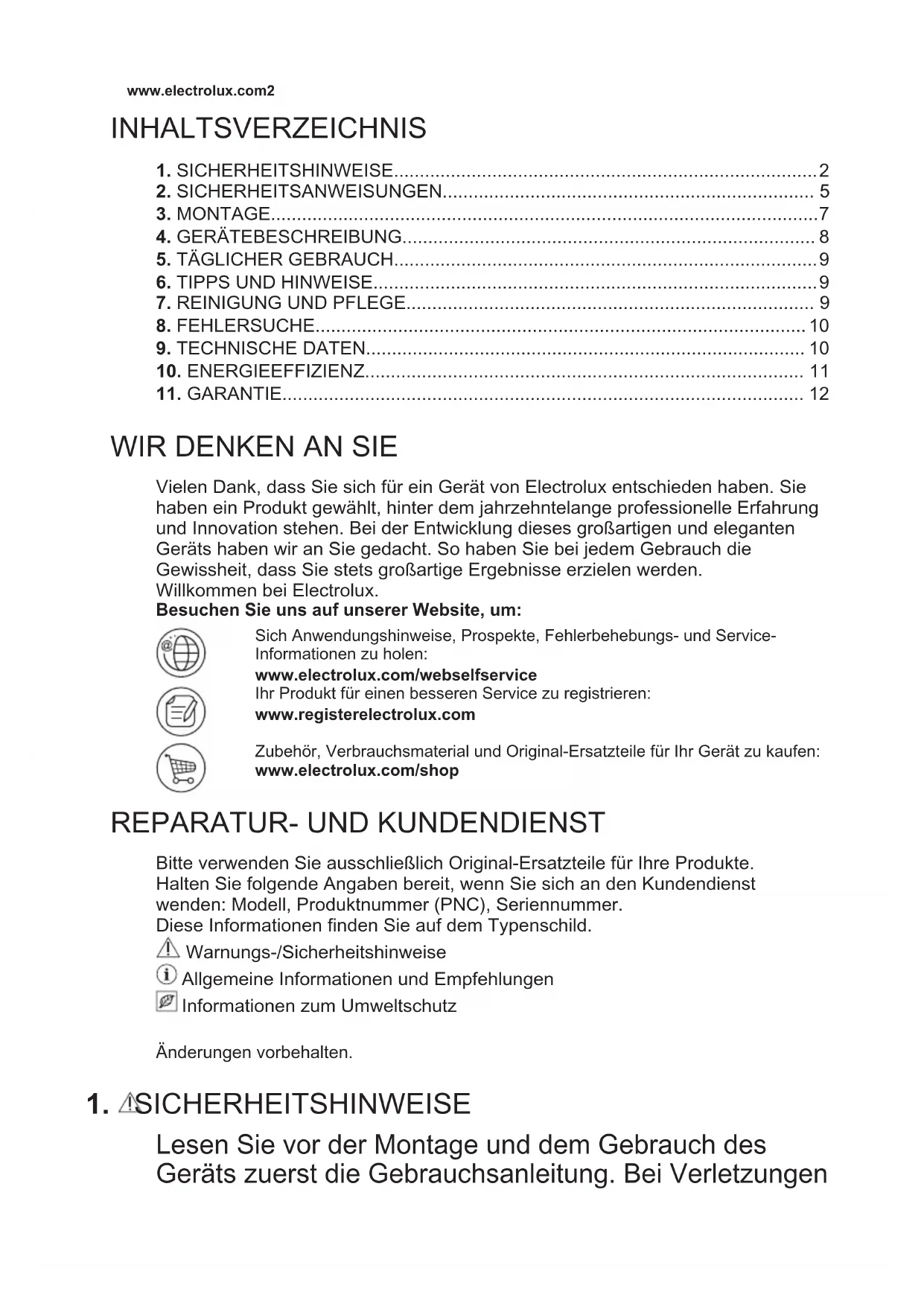 Lesen Sie vor der Montage und dem Gebrauch des Geräts zuerst die Gebrauchsanleitung. Bei Verletzungen www.electrolux.com2oder Schäden infolge nicht ordnungsgemäßer Montage oder Verwendung des Geräts übernimmt der Hersteller keine Haftung. Bewahren Sie die Anleitung immer an einem sicheren und zugänglichen Ort zum späteren Nachschlagen auf.