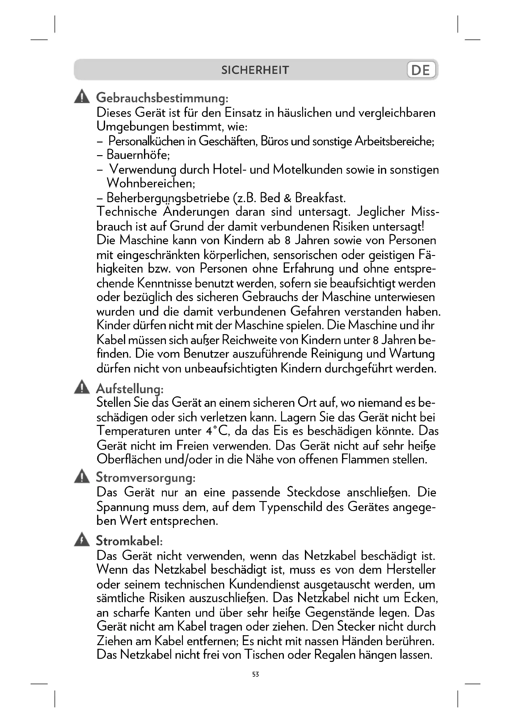 Die Maschine kann von Kindern ab 8 Jahren sowie von Personen mit eingeschrankten körperlichen, sensorischen oder geistigen Fähigkeiten bzw. von Personen ohne Erfahrung und ohne entsprechende Kenntnisse benutzt werden, sofern sie beaufsichtigt werden oder bezüglich des sicheren Gebrauchs der Maschine unterwiesen wurden und die damit verbundenen Gefahren verstanden haben.