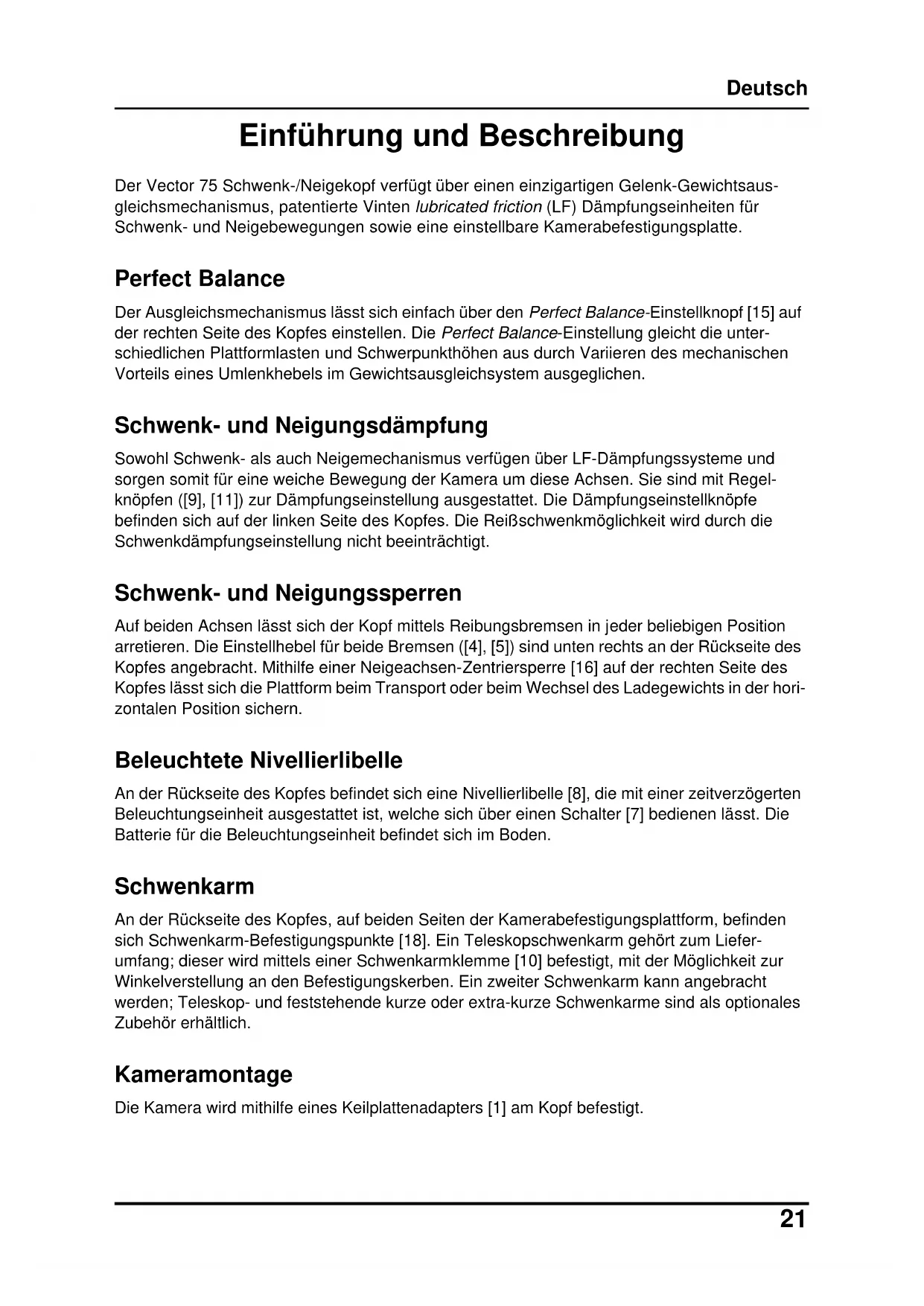 Einführung und Beschreibung Der Vector 75 Schwenk-/Neigekopf verfügt über einen einzigartigen Gelenk-Gewichtsaus- gleichsmechanismus, patentierte Vinten lubricated friction (LF) Dämpfungseinheiten für Schwenk- und Neigebewegungen sowie eine einstellbare Kamerabefestigungsplatte. Perfect Balance Der Ausgleichsmechanismus lässt sich einfach über den Perfect Balance-Einstellknopf [15] auf der rechten Seite des Kopfes einstellen. Die Perfect Balance-Einstellung gleicht die unter- schiedlichen Plattformlasten und Schwerpunkthöhen aus durch Variieren des mechanischen Vorteils eines Umlenkhebels im Gewichtsausgleichsystem ausgeglichen. Schwenk- und Neigungsdämpfung Sowohl Schwenk- als auch Neigemechanismus verfügen über LF-Dämpfungssysteme und sorgen somit für eine weiche Bewegung der Kamera um diese Achsen. Sie sind mit Regel- knöpfen ([9], [11]) zur Dämpfungseinstellung ausgestattet. Die Dämpfungseinstellknöpfe befinden sich auf der linken Seite des Kopfes. Die Reißschwenkmöglichkeit wird durch die Schwenkdämpfungseinstellung nicht beeinträchtigt. Schwenk- und Neigungssperren Auf beiden Achsen lässt sich der Kopf mittels Reibungsbremsen in jeder beliebigen Position arretieren. Die Einstellhebel für beide Bremsen ([4], [5]) sind unten rechts an der Rückseite des Kopfes angebracht. Mithilfe einer Neigeachsen-Zentriersperre [16] auf der rechten Seite des Kopfes lässt sich die Plattform beim Transport oder beim Wechsel des Ladegewichts in der hori- zontalen Position sichern. Beleuchtete Nivellierlibelle An der Rückseite des Kopfes befindet sich eine Nivellierlibelle [8], die mit einer zeitverzögerten Beleuchtungseinheit ausgestattet ist, welche sich über einen Schalter [7] bedienen lässt. Die Batterie für die Beleuchtungseinheit befindet sich im Boden. Schwenkarm An der Rückseite des Kopfes, auf beiden Seiten der Kamerabefestigungsplattform, befinden sich Schwenkarm-Befestigungspunkte [18]. Ein Teleskopschwenkarm gehört zum Liefer- umfang; dieser wird mittels einer Schwenkarmklemme [10] befestigt, mit der Möglichkeit zur Winkelverstellung an den Befestigungskerben. Ein zweiter Schwenkarm kann angebracht werden; Teleskop- und feststehende kurze oder extra-kurze Schwenkarme sind als optionales Zubehör erhältlich. Kameramontage Die Kamera wird mithilfe eines Keilplattenadapters [1] am Kopf befestigt.Deutsch