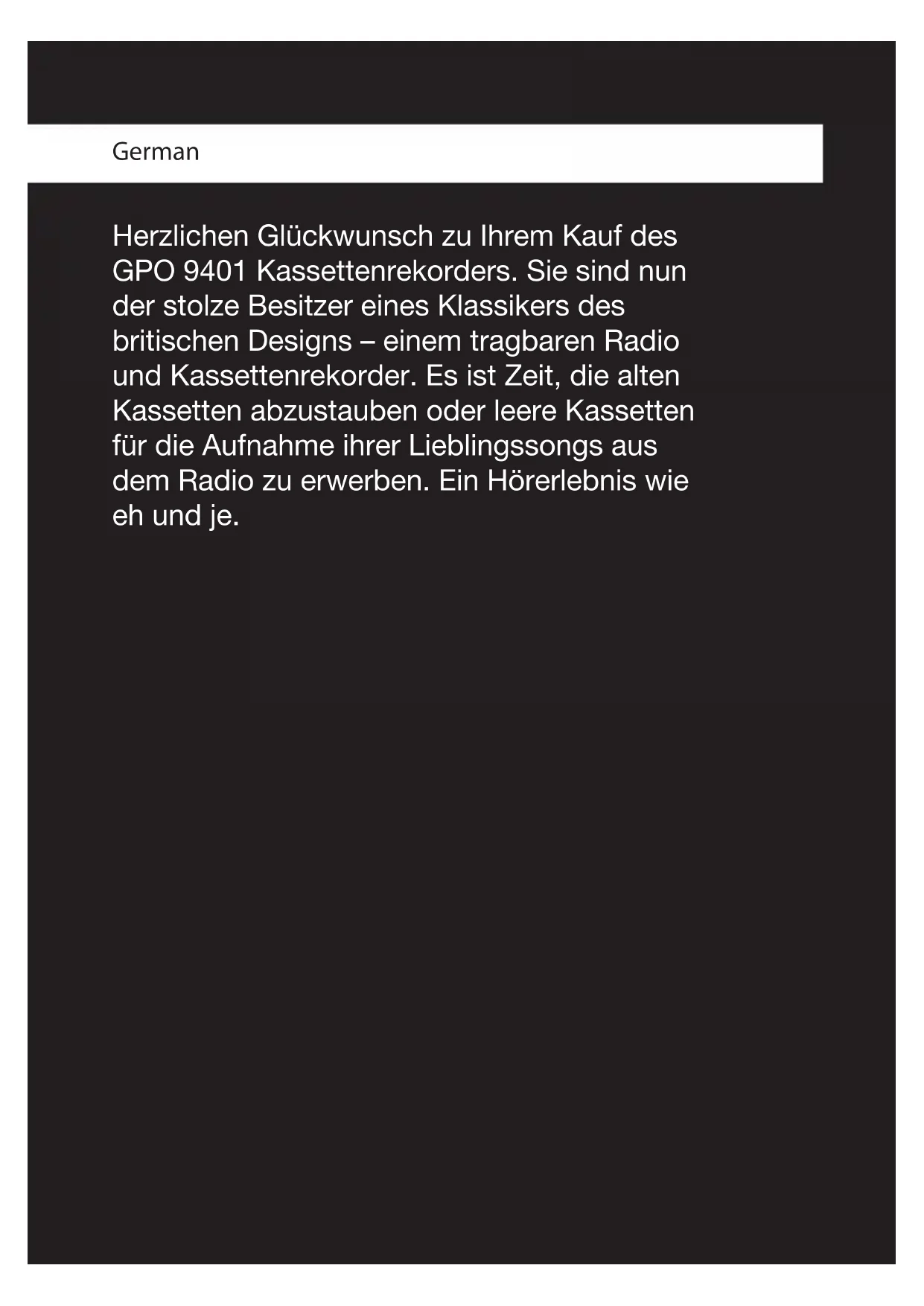 Herzlichen Glückwunsch zu ihrem Kauf des GPO 9401 Kassettenrekorders. Sie sind nun der stolze Besitzer eines Klassikers des britischen Designs – einem tragbaren Radio und Kassettenrekorder. Es ist Zeit, die alten Kassetten abzustauben oder leere Kassetten für die Aufnahme ihrer Lieblingssongs aus dem Radio zu erwerben. Ein Hörerlebnis wie eh und je.