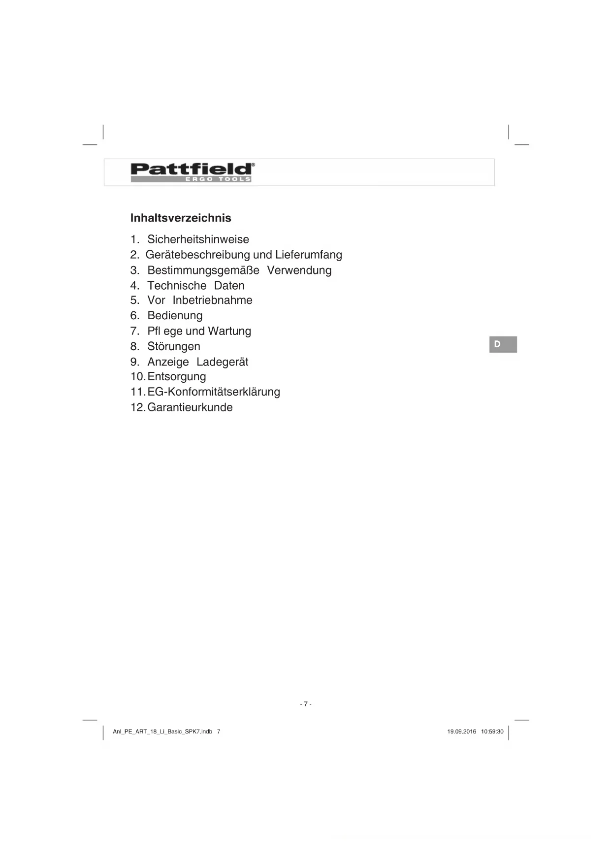 BEDIENUNGSANLEITUNG PEART 18 Li Basic Pattfield