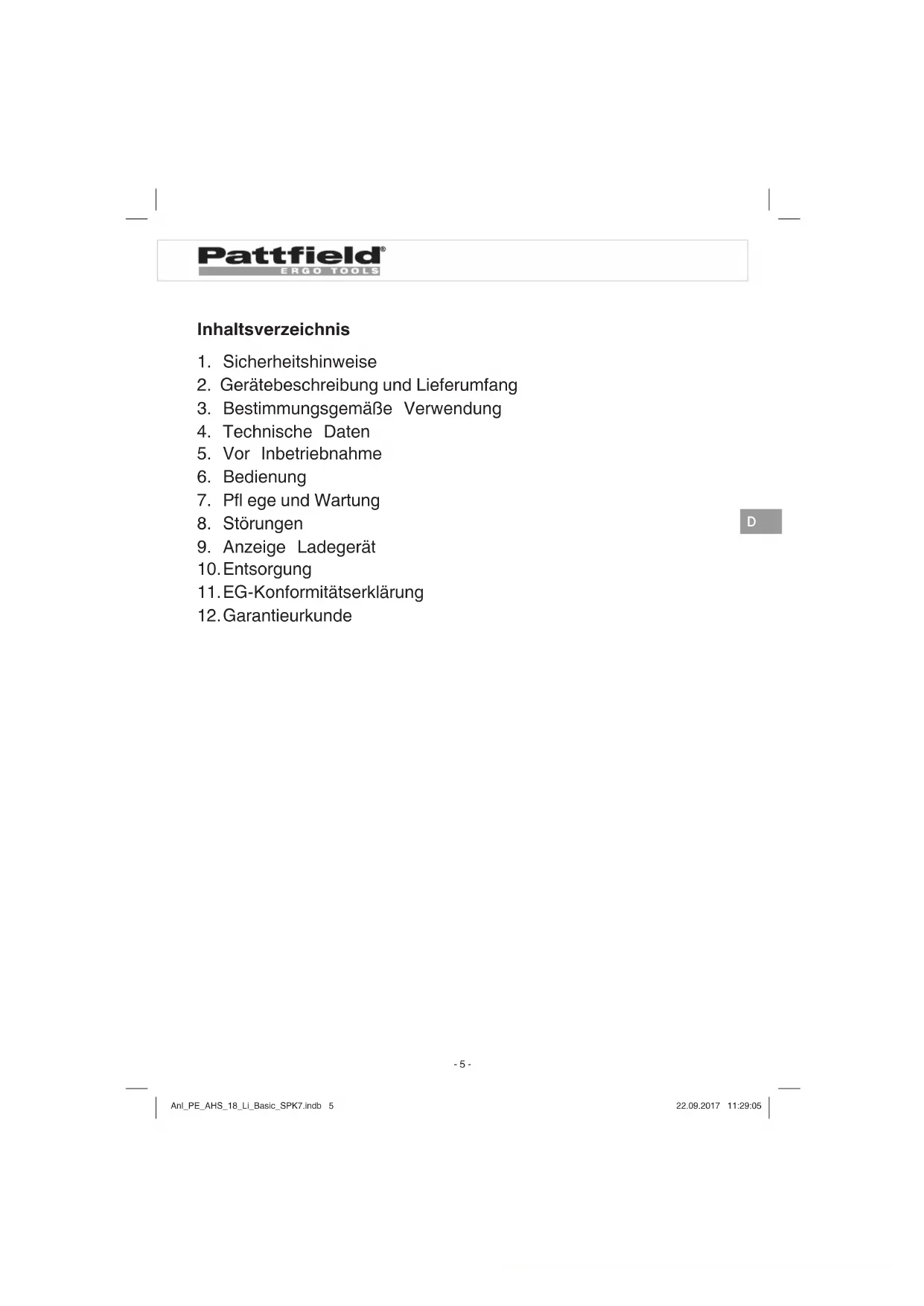 BEDIENUNGSANLEITUNG PEAHS 18 Li Basic Pattfield