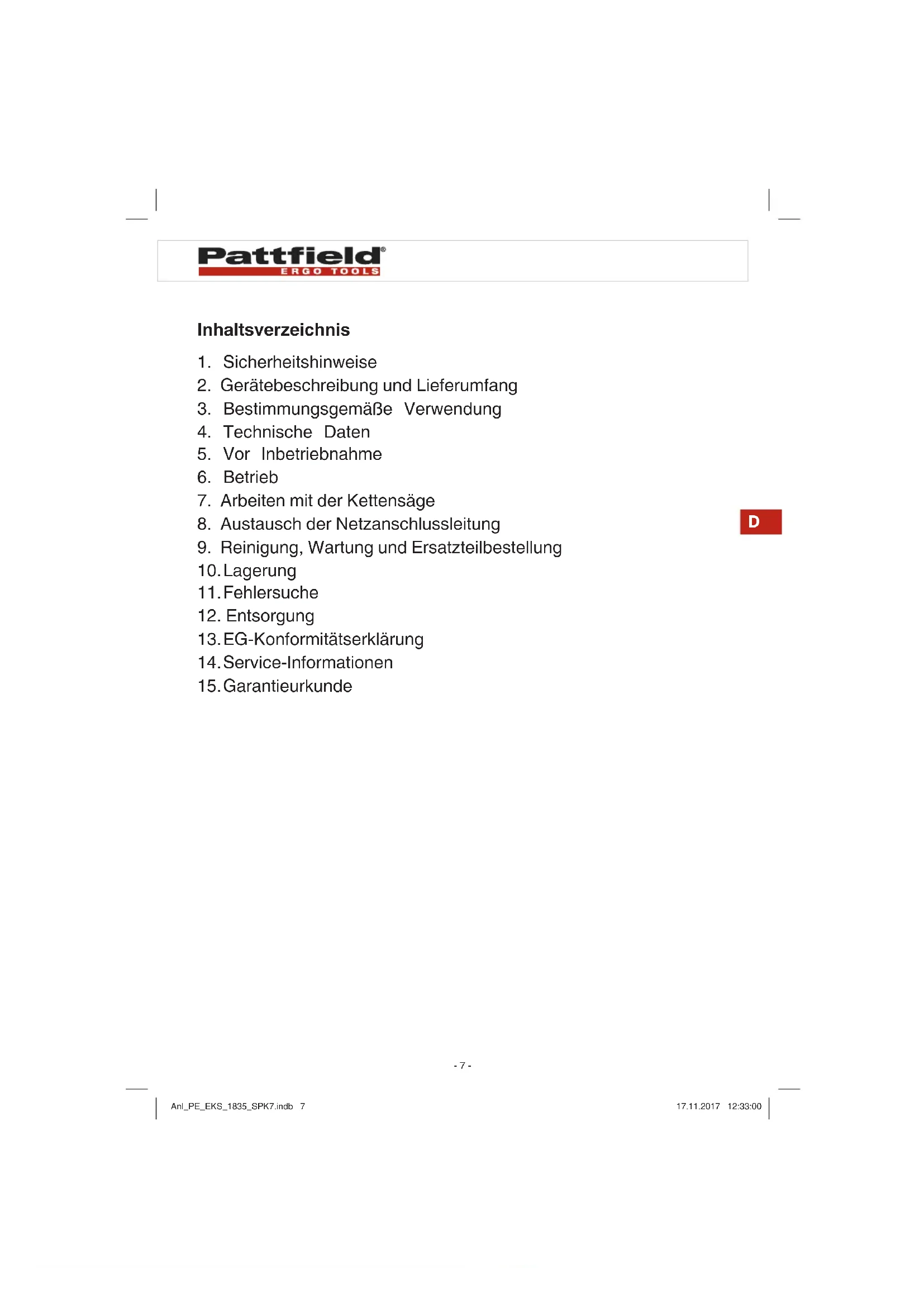 Motorbremse Der Motor bremst die Sägekette ab, sobald der Ein- / Ausschalter (Abb.1/Pos.6) losgelassen oder die Stromzufuhr unterbrochen wur- de. Dadurch wird die Gefahr einer Verletzung durch eine nachlaufen- de Kette deutlich gesenkt. Kettenbremse Die Kettenbremse ist ein Schutzmechanismus, der über den vorde- ren Handschutz (Abb.1/Pos.2) ausgelöst wird. Wenn die Kettensäge durch einen Rückschlag zurückgeschleudert wird, löst die Ketten- bremse aus und stoppt die Sägekette in weniger als 0,1 Sekunden. Prüfen Sie regelmäßig die Funktion der Kettenbremse. Klappen Sie dazu den Handschutz (Abb.1/Pos.2) nach vorne und schalten Sie die Kettensäge kurz ein. Die Sägekette darf nicht anlaufen. Ziehen Sie den vorderen Handschutz (Abb.1/Pos.2) zurück, bis die- ser einrastet, um die Kettenbremse zu lösen. Gefahr! Benutzen Sie die Säge nicht, wenn die Schutzeinrichtungen nicht einwandfrei funktionieren. Anl_PE_EKS_1835_SPK7.indb 24Anl_PE_EKS_1835_SPK7.indb 24 17.11.2017 12:33:0217.11.2017 12:33:02D