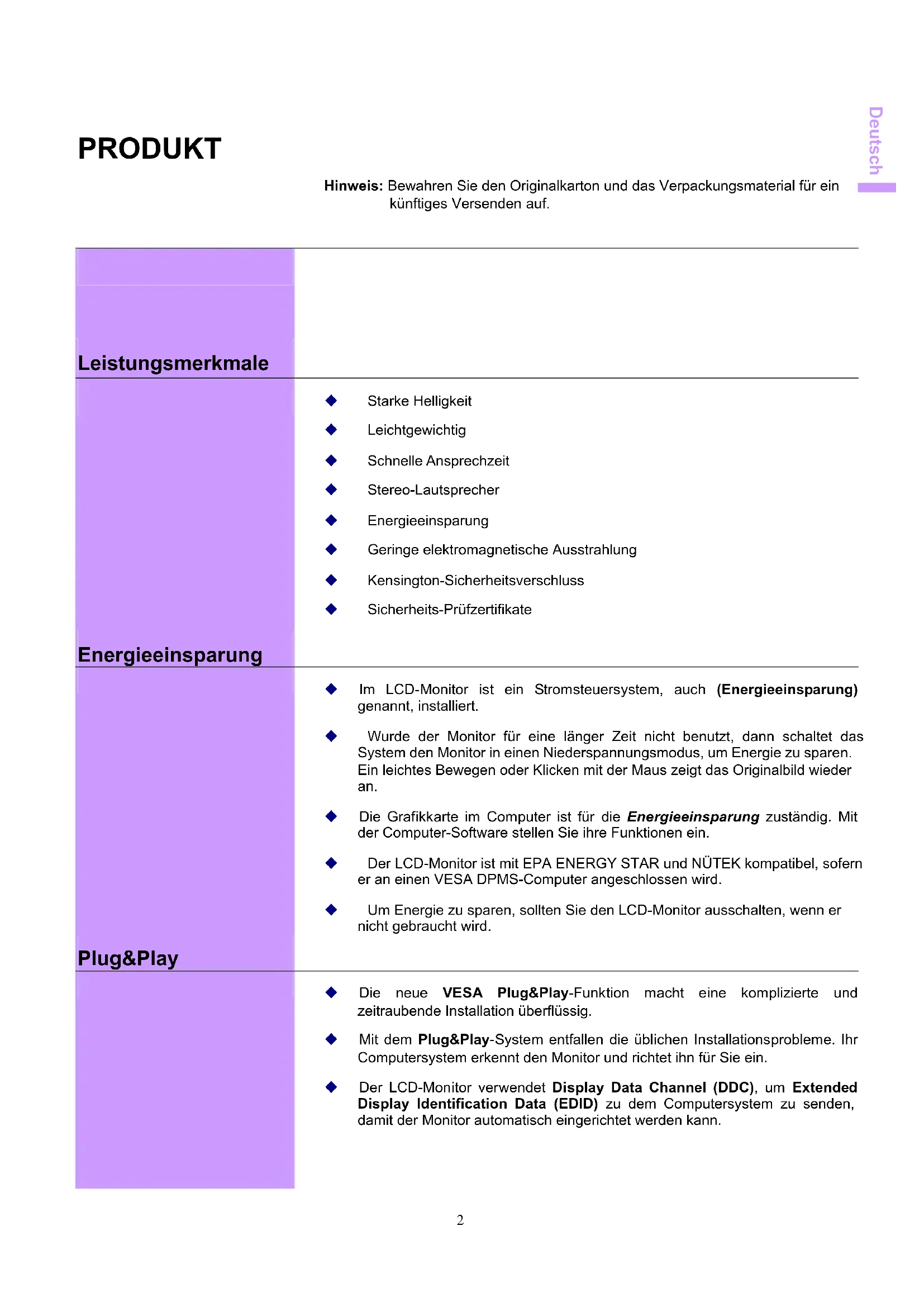 Die neue VESA Plug&Play-Funktion macht eine komplizierte und zeitraubende Installation überflüssig. Mit dem Plug&Play-System entfallen die üblichen Installationsprobleme. Ihr Computersystem erkennt den Monitor und richtet ihn für Sie ein. Der LCD-Monitor verwendet Display Data Channel (DDC), um Extended Display Identification Data (EDID) zu dem Computersystem zu senden, damit der Monitor automatisch eingerichtet werden kann.Deutsch