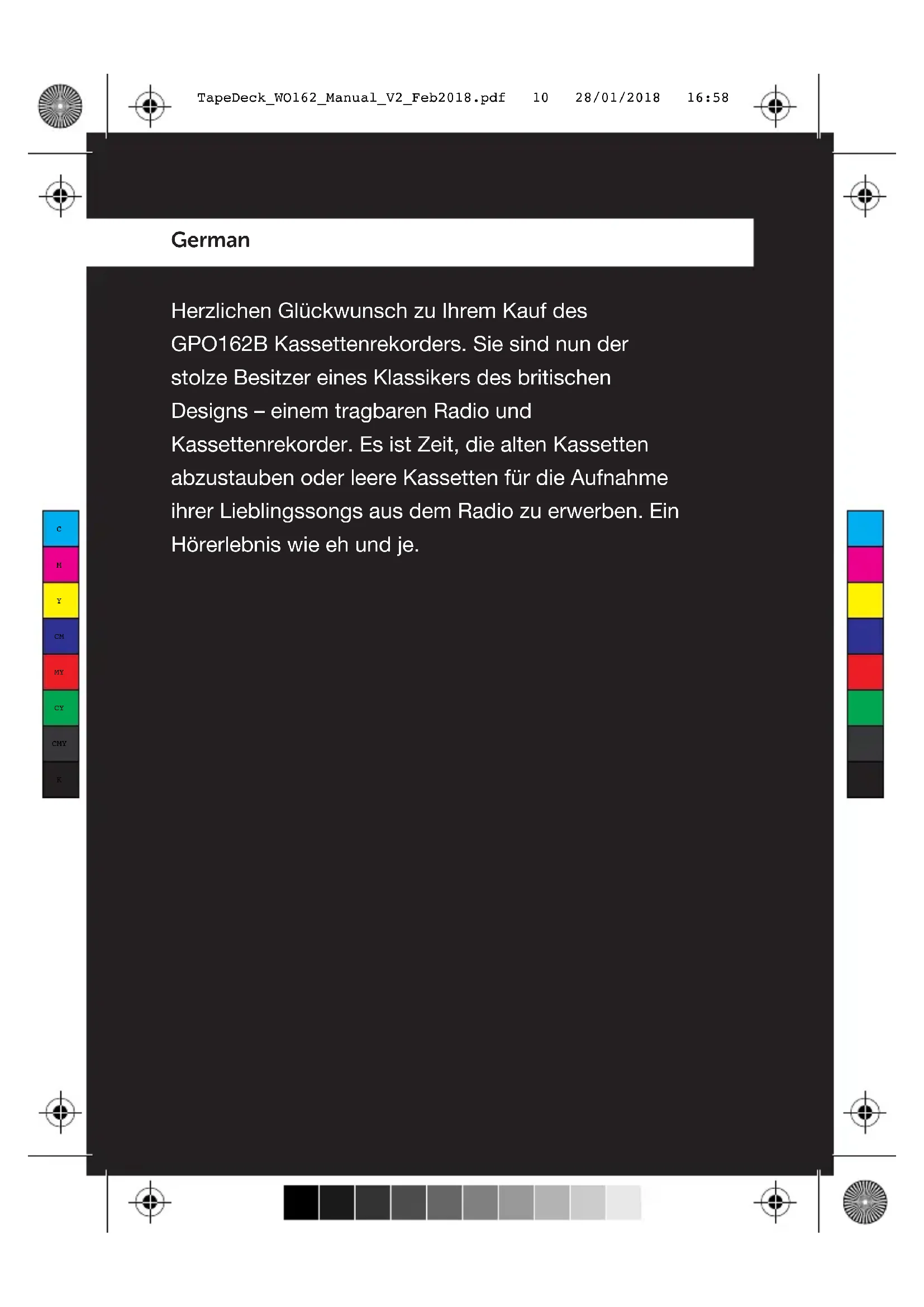 TapeDeck_WO162_Manual_V2_Feb2018.pdf 9 28/01/2018 16:58German Herzlichen Glückwunsch zu Ihrem Kauf des GPO162B Kassettenrekorders. Sie sind nun der stolze Besitzer eines Klassikers des britischen Designs – einem tragbaren Radio und Kassettenrekorder. Es ist Zeit, die alten Kassetten abzustauben oder leere Kassetten für die Aufnahme ihrer Lieblingssongs aus dem Radio zu erwerben. Ein Hörerlebnis wie eh und je.