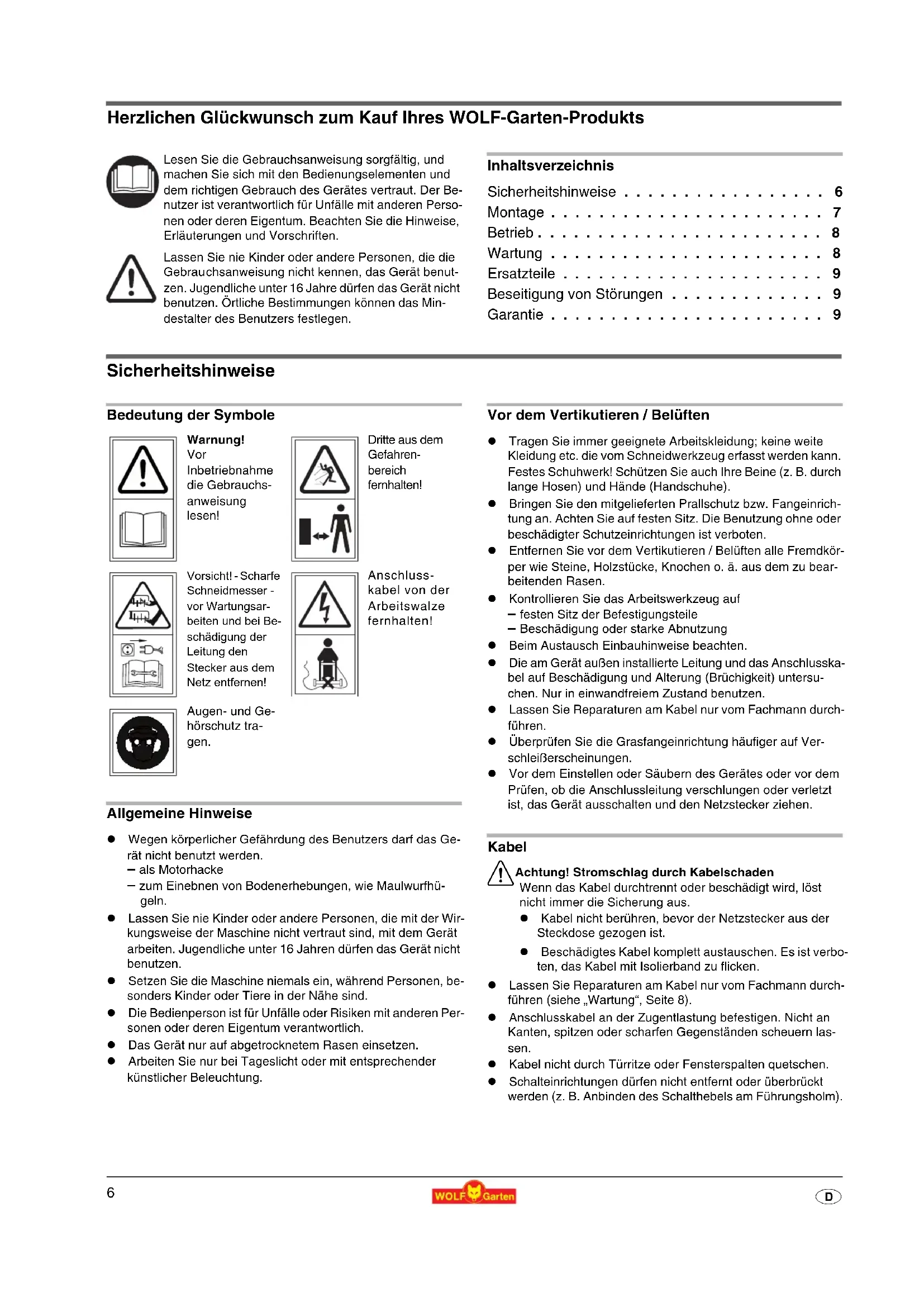 D Herzlichen Glückwunsch zum Kauf Ihres WOLF-Garten-Produkts Inhaltsverzeichnis Sicherheitshinweise ... 6 Montage