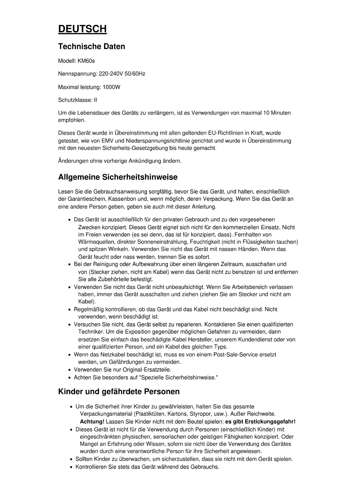 Fabriqué pour et importé par : Adeva SAS 8 rue Marc Seguin 77290 Mitry-Mory FRANCE www.hkoenig.com - contact@hkoenig.com - Tél. 01 64 67 00 01DEUTSCH Technische Daten Modell: KM60s Nennspannung: 220-240V 50/60Hz Maximal leistung: 1000W Schutzklasse: II Um die Lebensdauer des Geräts zu verlängern, ist es Verwendungen von maximal 10 Minuten empfohlen. Dieses Gerät wurde in Übereinstimmung mit allen geltenden EU-Richtlinien in Kraft, wurde getestet, wie von EMV und Niederspannungsrichtlinie gerichtet und wurde in Übereinstimmung mit den neuesten Sicherheits-Gesetzgebung bis heute gemacht. Änderungen ohne vorherige Ankündigung ändern. Allgemeine Sicherheitshinweise Lesen Sie die Gebrauchsanweisung sorgfältig, bevor Sie das Gerät, und halten, einschließlich der Garantieschein, Kassenbon und, wenn möglich, deren Verpackung. Wenn Sie das Gerät an eine andere Person geben, geben sie auch mit dieser Anleitung. Das Gerät ist ausschließlich für den privaten Gebrauch und zu den vorgesehenen Zwecken konzipiert. Dieses Gerät eignet sich nicht für den kommerziellen Einsatz. Nicht im Freien verwenden (es sei denn, das ist für konzipiert, dass). Fernhalten von Wärmequellen, direkter Sonneneinstrahlung, Feuchtigkeit (nicht in Flüssigkeiten tauchen) und spitzen Winkeln. Verwenden Sie nicht das Gerät mit nassen Händen. Wenn das Gerät feucht oder nass werden, trennen Sie es sofort. Bei der Reinigung oder Aufbewahrung über einen längeren Zeitraum, ausschalten und von (Stecker ziehen, nicht am Kabel) wenn das Gerät nicht zu benutzen ist und entfernen Sie alle Zubehörteile befestigt. Verwenden Sie nicht das Gerät nicht unbeaufsichtigt. Wenn Sie Arbeitsbereich verlassen haben, immer das Gerät ausschalten und ziehen (ziehen Sie am Stecker und nicht am Kabel). Regelmäßig kontrollieren, ob das Gerät und das Kabel nicht beschädigt sind. Nicht verwenden, wenn beschädigt ist. Versuchen Sie nicht, das Gerät selbst zu reparieren. Kontaktieren Sie einen qualifizierten Techniker. Um die Exposition gegenüber möglichen Gefahren zu vermeiden, dann ersetzen Sie einfach das beschädigte Kabel Hersteller, unserem Kundendienst oder von einer qualifizierten Person, und ein Kabel des gleichen Typs. Wenn das Netzkabel beschädigt ist, muss es von einem Post-Sale-Service ersetzt werden, um Gefährdungen zu vermeiden. Verwenden Sie nur Original-Ersatzteile. Achten Sie besonders auf "Spezielle Sicherheitshinweise." Kinder und gefährdete Personen Um die Sicherheit ihrer Kinder zu gewährleisten, halten Sie das gesamte Verpackungsmaterial (Plastiktüten, Kartons, Styropor, usw.). Außer Reichweite. Achtung! Lassen Sie Kinder nicht mit dem Beutel spielen: es gibt Erstickungsgefahr! Dieses Gerät ist nicht für die Verwendung durch Personen (einschließlich Kinder) mit eingeschränkten physischen, sensorischen oder geistigen Fähigkeiten konzipiert. Oder Mangel an Erfahrung oder Wissen, sofern sie nicht über die Verwendung des Gerätes wurden durch eine verantwortliche Person für ihre Sicherheit angewiesen. Sollten Kinder zu überwachen, um sicherzustellen, dass sie nicht mit dem Gerät spielen. Kontrollieren Sie stets das Gerät während des Gebrauchs. Nicht mit einem Sicherheitsschalter manipulieren. Stecken Sie nichts in den Zapfen, während das Gerät in Betrieb ist. Stellen Sie das Gerät auf eine ebene Arbeitsfläche, flach und stabil. Stecken Sie das Gerät ohne Installation alle notwendigen Zubehörteile. Nur die Taste sollte verwendet werden, um die Blätter zu füllen. Gefahr der Überlastung! Verwenden Sie das Gerät zum Schneiden oder Vermischung, aber nie beides gleichzeitig. Beschreibung der Komponenten