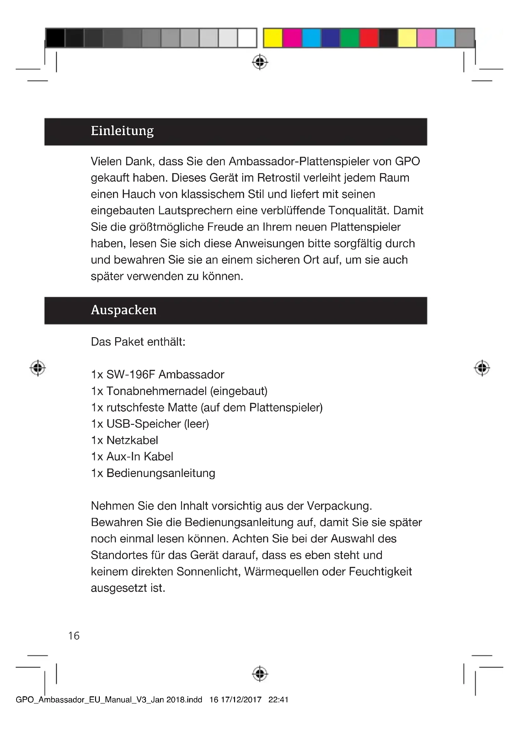 GPO_Ambassador_EU_Manual_V3_Jan 2018.indd 15 17/12/2017 22:4116 Einleitung Vielen Dank, dass Sie den Ambassador-Plattenspieler von GPO gekauft haben. Dieses Gerät im Retrostil verleiht jedem Raum einen Hauch von klassischem Stil und liefert mit seinen eingebauten Lautsprechern eine verblüffende Tonqualität. Damit Sie die größtmögliche Freude an Ihrem neuen Plattenspieler haben, lesen Sie sich diese Anweisungen bitte sorgfältig durch und bewahren Sie sie an einem sicheren Ort auf, um sie auch später verwenden zu können. Das Paket enthält: 1x SW-196F Ambassador 1x Tonabnehmernadel (eingebaut) 1x rutschfeste Matte (auf dem Plattenspieler) 1x USB-Speicher (leer) 1x Netzkabel 1x Aux-In Kabel 1x Bedienungsanleitung Nehmen Sie den Inhalt vorsichtig aus der Verpackung. Bewahren Sie die Bedienungsanleitung auf, damit Sie sie später noch einmal lesen können. Achten Sie bei der Auswahl des Standortes für das Gerät darauf, dass es eben steht und keinem direkten Sonnenlicht, Wärmequellen oder Feuchtigkeit ausgesetzt ist. Auspacken GPO_Ambassador_EU_Manual_V3_Jan 2018.indd 16 17/12/2017 22:4117 Eigenschaften Ihr Ambassador-Plattenspieler hat die folgenden Eigenschaften:
