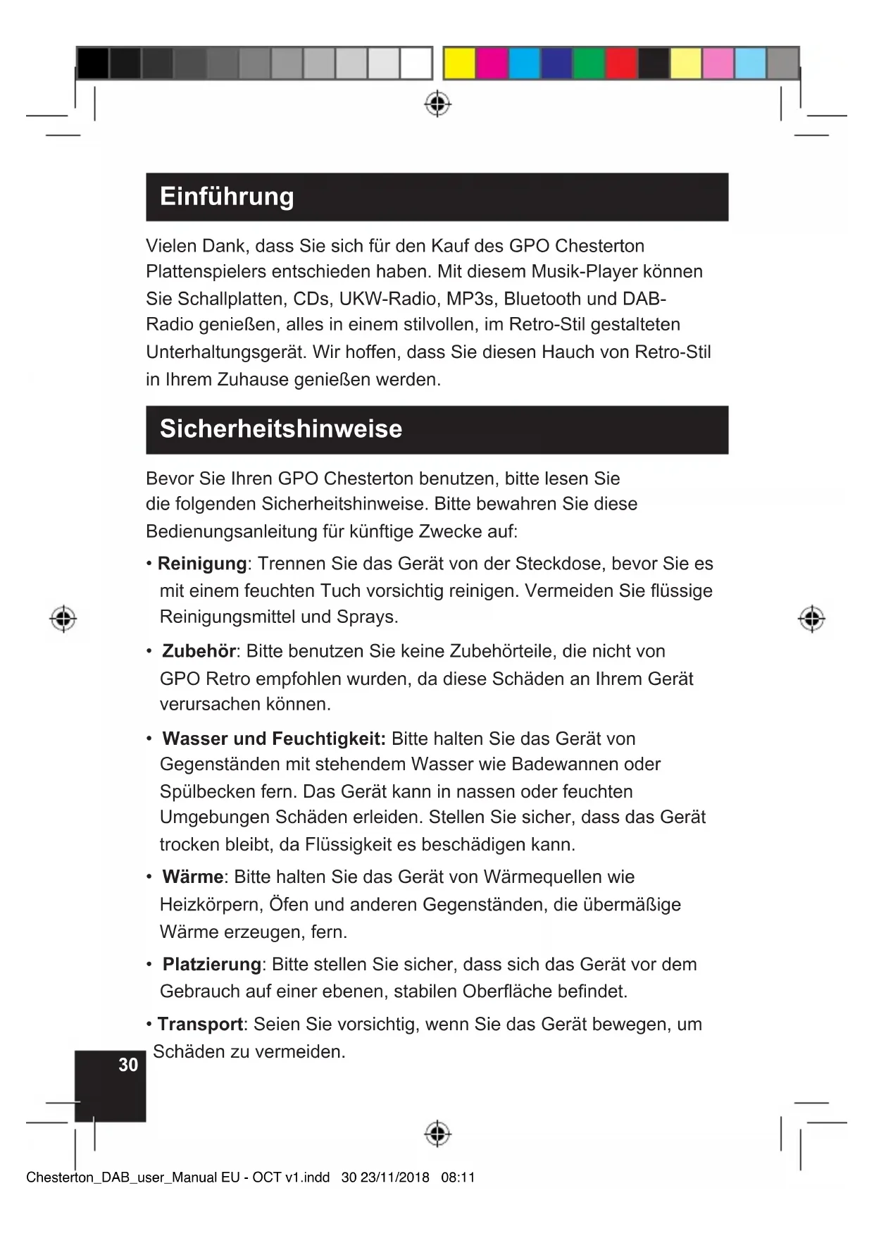 Chesterton_DAB_user_Manual EU - OCT v1.indd 49 23/11/2018 08:1150 Fehlerbehebung F) Das Gerät schaltet sich nicht ein A) Stellen Sie sicher, dass das Gerät ordnungsgemäß an die Stromversorgung angeschlossen ist F) Kein Ton kommt aus den Lautsprechern des Geräts A) Stellen Sie sicher, dass die Lautstärke richtig eingerichtet worden ist und dass die Funktionstaste auf die richtige Wiedergabequelle eingestellt ist F) Die Klangqualität ist schlecht A) Stellen Sie sicher, dass sich das Gerät nicht zu nahe an einem Fernseher oder einem anderen Gerät bendet F) Das Gerät reagiert nicht A) Trennen Sie das Gerät von der Stromversorgung und warten Sie 60 Sekunden. Schließen Sie das Gerät wieder an die Stromversorgung an und versuchen Sie es erneut F) Die Klangqualität ist während der Wiedergabe von Schallplatten schlecht A) Stellen Sie sicher, dass Ihre Tonnadel nicht beschädigt ist und dass sie sich in der richtigen Position auf der Schallplatte bendet Chesterton_DAB_user_Manual EU - OCT v1.indd 50 23/11/2018 08:11Produktunterstützung Für weitere Beratung oder Unterstützung besuchen Sie bitte www. gporetro.com. Bitte beachten Sie, dass Sie zu Ihrer eigenen Sicherheit NICHT versuchen sollten, das Gehäuse des Geräts zu öffnen. Beim Öffnen des Gehäuses erlischt Ihre Garantie und im Inneren benden sich keine vom Benutzer zu wartenden Teile Spezikationen Bluetooth : 2402-2480 MHz UKW : 87.5-108 MHz Frequenz : 2.4GHz Sendeleistung : CLASS 2 4dBm Benutzung in Mitgliedsstaaten: EUROPA, VEREINIGTES KÖNIGREICH Maximale Betriebstemperatur: -5 +45 ºC Wechselstromeingang 230-240V ~ 50Hz Chesterton_DAB_user_Manual EU - OCT v1.indd 51 23/11/2018 08:1152 Chesterton_DAB_user_Manual EU - OCT v1.indd 52 23/11/2018 08:11French