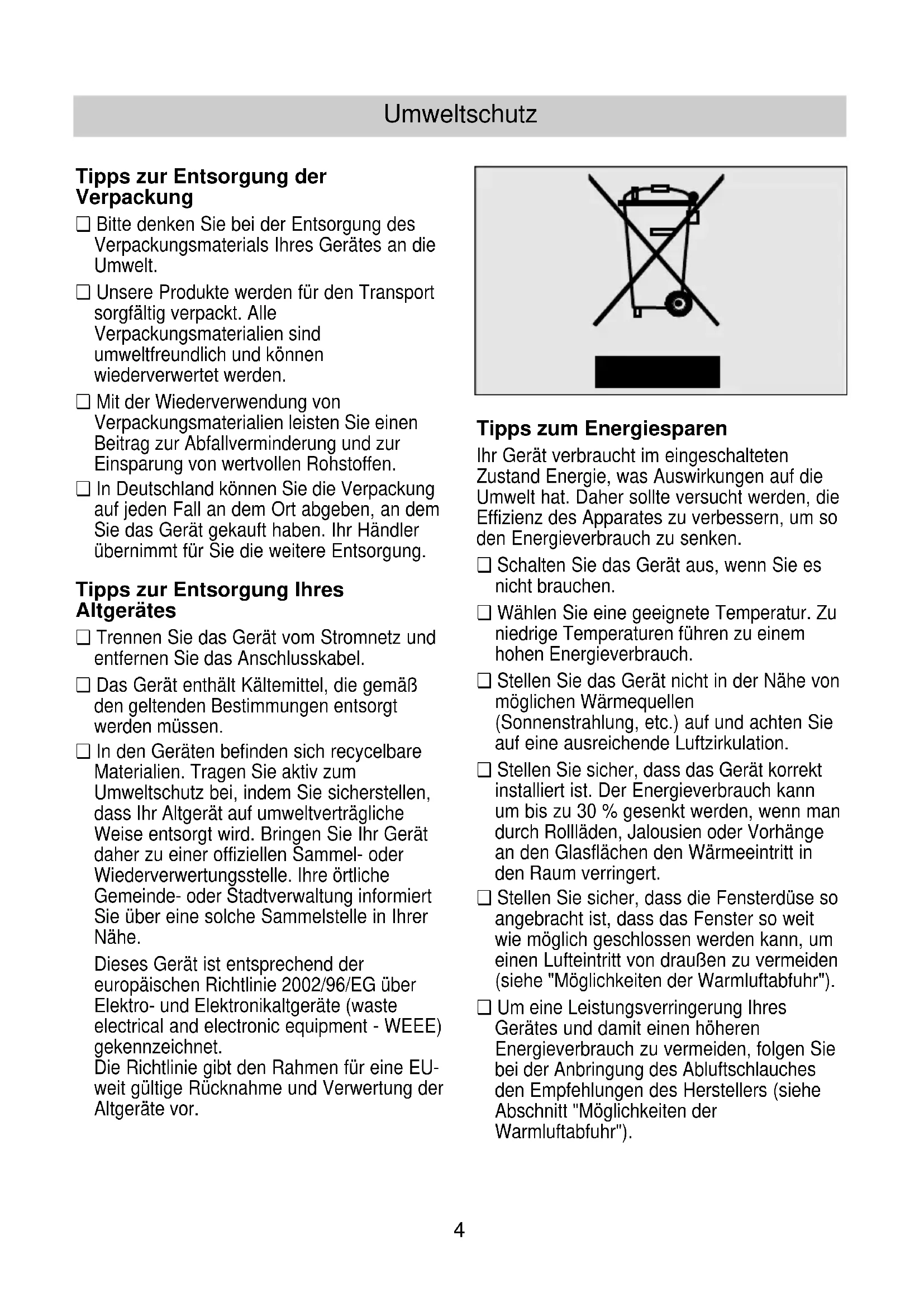 Umweltschutz Tipps zur Entsorgung der Verpackung ❏ Bitte denken Sie bei der Entsorgung des Verpackungsmaterials Ihres Gerätes an die Umwelt. ❏ Unsere Produkte werden für den Transport sorgfältig verpackt. Alle Verpackungsmaterialien sind umweltfreundlich und können wiederverwertet werden. ❏ Mit der Wiederverwendung von Verpackungsmaterialien leisten Sie einen Beitrag zur Abfallverminderung und zur Einsparung von wertvollen Rohstoffen. ❏ In Deutschland können Sie die Verpackung auf jeden Fall an dem Ort abgeben, an dem Sie das Gerät gekauft haben. Ihr Händler übernimmt für Sie die weitere Entsorgung. Tipps zur Entsorgung Ihres Altgerätes ❏ Trennen Sie das Gerät vom Stromnetz und entfernen Sie das Anschlusskabel. ❏ Das Gerät enthält Kältemittel, die gemäß den geltenden Bestimmungen entsorgt werden müssen. ❏ In den Geräten befinden sich recycelbare Materialien. Tragen Sie aktiv zum Umweltschutz bei, indem Sie sicherstellen, dass Ihr Altgerät auf umweltverträgliche Weise entsorgt wird. Bringen Sie Ihr Gerät daher zu einer offiziellen Sammel- oder Wiederverwertungsstelle. Ihre örtliche Gemeinde- oder Stadtverwaltung informiert Sie über eine solche Sammelstelle in Ihrer Nähe. Dieses Gerät ist entsprechend der europäischen Richtlinie 2002/96/EG über Elektro- und Elektronikaltgeräte (waste electrical and electronic equipment - WEEE) gekennzeichnet. Die Richtlinie gibt den Rahmen für eine EU- weit gültige Rücknahme und Verwertung der Altgeräte vor. Tipps zum Energiesparen Ihr Gerät verbraucht im eingeschalteten Zustand Energie, was Auswirkungen auf die Umwelt hat. Daher sollte versucht werden, die Effizienz des Apparates zu verbessern, um so den Energieverbrauch zu senken. ❏ Schalten Sie das Gerät aus, wenn Sie es nicht brauchen. ❏ Wählen Sie eine geeignete Temperatur. Zu niedrige Temperaturen führen zu einem hohen Energieverbrauch. ❏ Stellen Sie das Gerät nicht in der Nähe von möglichen Wärmequellen (Sonnenstrahlung, etc.) auf und achten Sie auf eine ausreichende Luftzirkulation. ❏ Stellen Sie sicher, dass das Gerät korrekt installiert ist. Der Energieverbrauch kann um bis zu 30 % gesenkt werden, wenn man durch Rollläden, Jalousien oder Vorhänge an den Glasflächen den Wärmeeintritt in den Raum verringert. ❏ Stellen Sie sicher, dass die Fensterdüse so angebracht ist, dass das Fenster so weit wie möglich geschlossen werden kann, um einen Lufteintritt von draußen zu vermeiden (siehe "Möglichkeiten der Warmluftabfuhr"). ❏ Um eine Leistungsverringerung Ihres Gerätes und damit einen höheren Energieverbrauch zu vermeiden, folgen Sie bei der Anbringung des Abluftschlauches den Empfehlungen des Herstellers (siehe Abschnitt "Möglichkeiten der Warmluftabfuhr").Wichtige Hinweise
