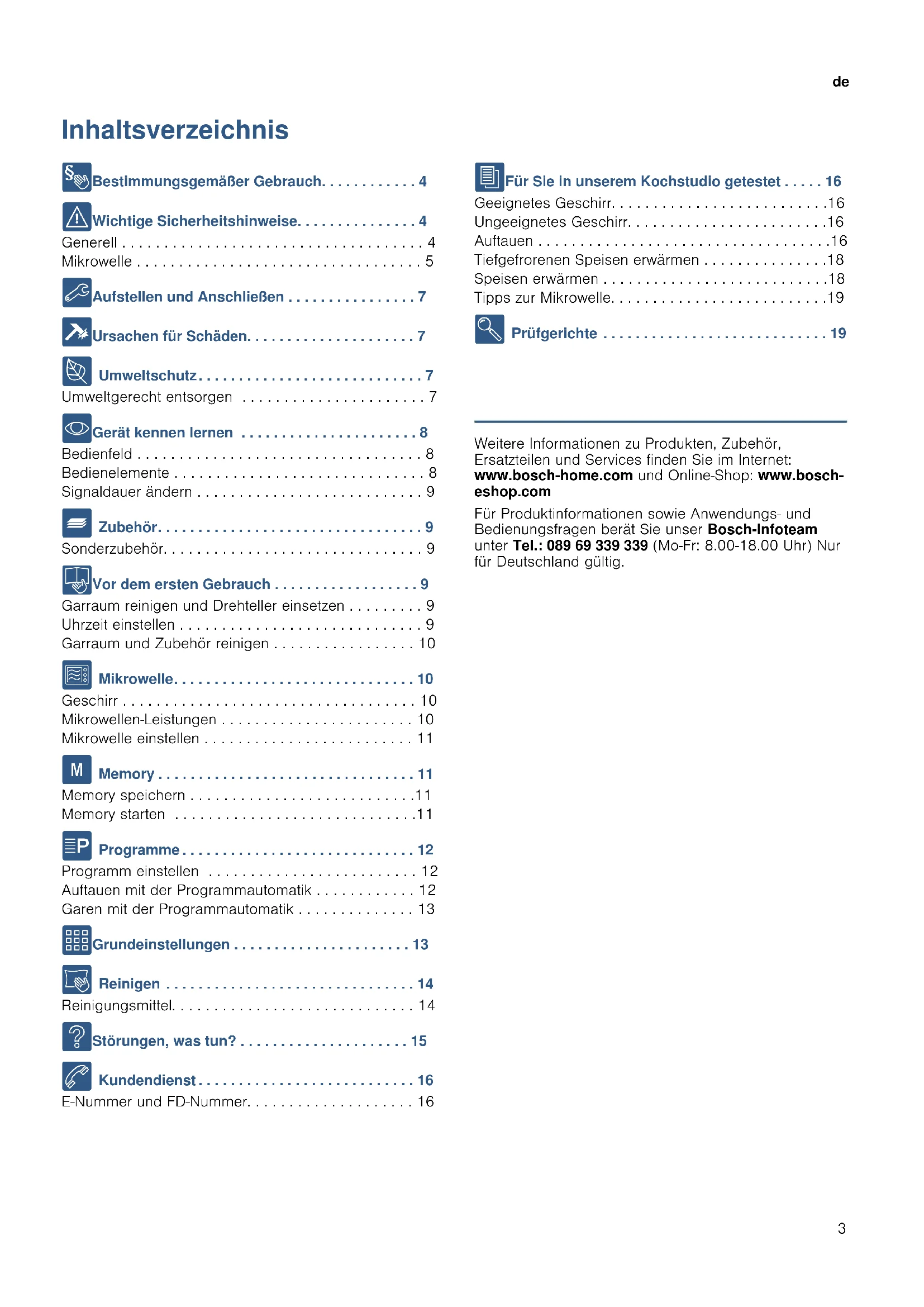 - Gerät kennen lernen . . . . . . . . . . . . . . . . . . . . . . 8 Bedienfeld . . . . . . . . . . . . . . . . . . . . . . . . . . . . . . . . . . 8 Bedienelemente . . . . . . . . . . . . . . . . . . . . . . . . . . . . . . 8 Signaldauer ändern . . . . . . . . . . . . . . . . . . . . . . . . . . . 9 _ Zubehör. . . . . . . . . . . . . . . . . . . . . . . . . . . . . . . . . 9 Sonderzubehör. . . . . . . . . . . . . . . . . . . . . . . . . . . . . . . 9 K Vor dem ersten Gebrauch . . . . . . . . . . . . . . . . . . 9 Garraum reinigen und Drehteller einsetzen . . . . . . . . . 9 Uhrzeit einstellen . . . . . . . . . . . . . . . . . . . . . . . . . . . . . 9 Garraum und Zubehör reinigen . . . . . . . . . . . . . . . . . 10 ^ Mikrowelle. . . . . . . . . . . . . . . . . . . . . . . . . . . . . . 10 Geschirr . . . . . . . . . . . . . . . . . . . . . . . . . . . . . . . . . . . 10 Mikrowellen-Leistungen . . . . . . . . . . . . . . . . . . . . . . . 10 Mikrowelle einstellen . . . . . . . . . . . . . . . . . . . . . . . . . 11 B Memory . . . . . . . . . . . . . . . . . . . . . . . . . . . . . . . . 11 Memory speichern . . . . . . . . . . . . . . . . . . . . . . . . . . .11 Memory starten . . . . . . . . . . . . . . . . . . . . . . . . . . . . .11 P Programme . . . . . . . . . . . . . . . . . . . . . . . . . . . . . 12 Programm einstellen . . . . . . . . . . . . . . . . . . . . . . . . . 12 Auftauen mit der Programmautomatik . . . . . . . . . . . . 12 Garen mit der Programmautomatik . . . . . . . . . . . . . . 13 Q Grundeinstellungen . . . . . . . . . . . . . . . . . . . . . . 13 D Reinigen . . . . . . . . . . . . . . . . . . . . . . . . . . . . . . . 14 Reinigungsmittel. . . . . . . . . . . . . . . . . . . . . . . . . . . . . 14 3 Störungen, was tun? . . . . . . . . . . . . . . . . . . . . . 15 4 Kundendienst . . . . . . . . . . . . . . . . . . . . . . . . . . . 16 E-Nummer und FD-Nummer. . . . . . . . . . . . . . . . . . . . 16 J Für Sie in unserem Kochstudio getestet . . . . . 16 Geeignetes Geschirr. . . . . . . . . . . . . . . . . . . . . . . . . .16 Ungeeignetes Geschirr. . . . . . . . . . . . . . . . . . . . . . . .16 Auftauen . . . . . . . . . . . . . . . . . . . . . . . . . . . . . . . . . . .16 Tiefgefrorenen Speisen erwärmen . . . . . . . . . . . . . . .18 Speisen erwärmen . . . . . . . . . . . . . . . . . . . . . . . . . . .18 Tipps zur Mikrowelle. . . . . . . . . . . . . . . . . . . . . . . . . .19 E Prüfgerichte . . . . . . . . . . . . . . . . . . . . . . . . . . . . 19 Produktinfo Weitere Informationen zu Produkten, Zubehör, Ersatzteilen und Services finden Sie im Internet: www.bosch-home.com und Online-Shop: www.bosch- eshop.com Für Produktinformationen sowie Anwendungs- und Bedienungsfragen berät Sie unser Bosch-Infoteam unter Tel.: 089 69 339 339 (Mo-Fr: 8.00-18.00 Uhr) Nur für Deutschland gültig.de Bestimmungsgemäßer Gebrauch