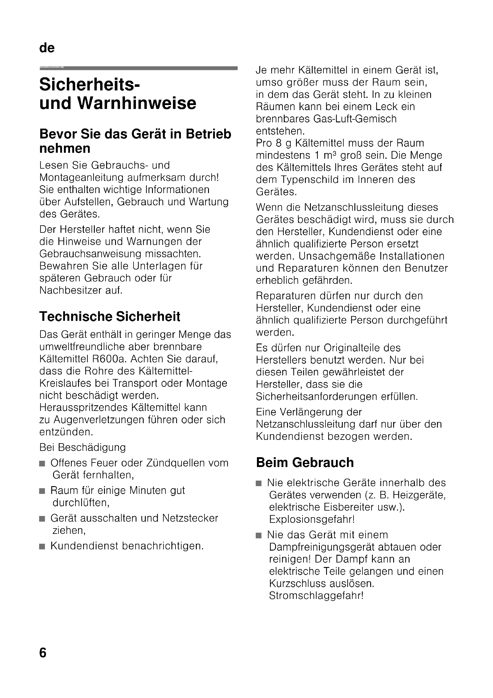 deInhaltsverzeichni s deGebrauchsanle itung Sicherheits- und Warnhinweise Bevor Sie das Gerät in Betrieb nehmen Lesen Sie Gebrauchs- und Montageanleitung aufmerksam durch! Sie enthalten wichtige Informationen über Aufstellen, Gebrauch und Wartung des Gerätes. Der Hersteller haftet nicht, wenn Sie die Hinweise und Warnungen der Gebrauchsanweisung missachten. Bewahren Sie alle Unterlagen für späteren Gebrauch oder für Nachbesitzer auf. Technische Sicherheit Das Gerät enthält in geringer Menge das umweltfreundliche aber brennbare Kältemittel R600a. Achten Sie darauf, dass die Rohre des Kältemittel- Kreislaufes bei Transport oder Montage nicht beschädigt werden. Herausspritzendes Kältemittel kann zu Augenverletzungen führen oder sich entzünden. Bei Beschädigung ■ Offenes Feuer oder Zündquellen vom Gerät fernhalten, ■ Raum für einige Minuten gut durchlüften, ■ Gerät ausschalten und Netzstecker ziehen, ■ Kundendienst benachrichtigen. Je mehr Kältemittel in einem Gerät ist, umso größer muss der Raum sein, in dem das Gerät steht. In zu kleinen Räumen kann bei einem Leck ein brennbares Gas-Luft-Gemisch entstehen. Pro 8 g Kältemittel muss der Raum mindestens 1 m³ groß sein. Die Menge des Kältemittels Ihres Gerätes steht auf dem Typenschild im Inneren des Gerätes. Wenn die Netzanschlussleitung dieses Gerätes beschädigt wird, muss sie durch den Hersteller, Kundendienst oder eine ähnlich qualifizierte Person ersetzt werden. Unsachgemäße Installationen und Reparaturen können den Benutzer erheblich gefährden. Reparaturen dürfen nur durch den Hersteller, Kundendienst oder eine ähnlich qualifizierte Person durchgeführt werden. Es dürfen nur Originalteile des Herstellers benutzt werden. Nur bei diesen Teilen gewährleistet der Hersteller, dass sie die Sicherheitsanforderungen erfüllen. Eine Verlängerung der Netzanschlussleitung darf nur über den Kundendienst bezogen werden. Beim Gebrauch ■ Nie elektrische Geräte innerhalb des Gerätes verwenden (z. B. Heizgeräte, elektrische Eisbereiter usw.). Explosionsgefahr! ■ Nie das Gerät mit einem Dampfreinigungsgerät abtauen oder reinigen! Der Dampf kann an elektrische Teile gelangen und einen Kurzschluss auslösen. Stromschlaggefahr!de