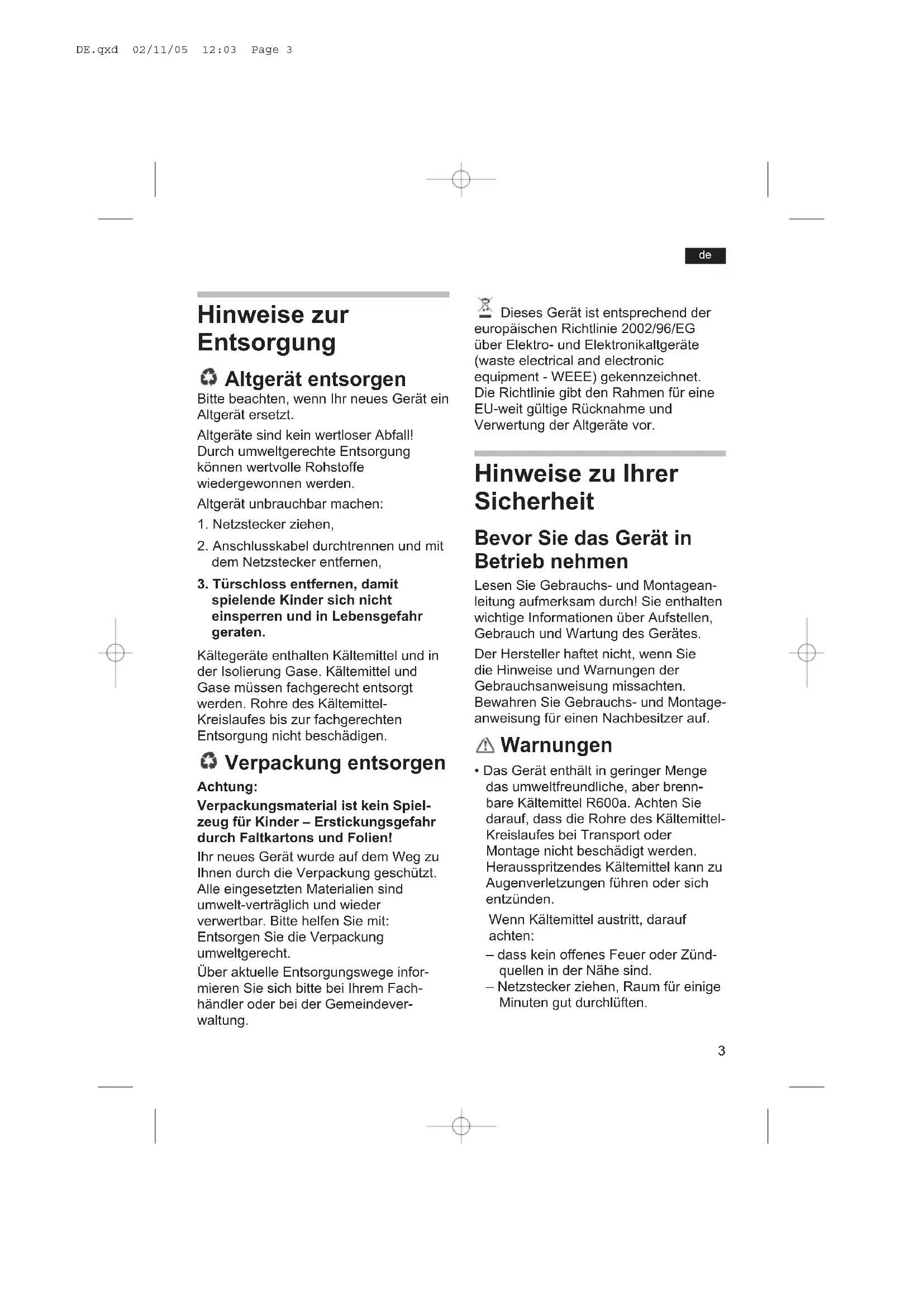 - Das Gerät enthält in geringer Menge das umweltfreundliche, aber brenn- bare Kältemittel R600a. Achten Sie darauf, dass die Rohre des Kältemittel- Kreislaufes bei Transport oder Montage nicht beschädigt werden. Herausspritzendes Kältemittel kann zu Augenverletzungen führen oder sich entzünden. Wenn Kältemittel austritt, darauf achten: – dass kein offenes Feuer oder Zünd- quellen in der Nähe sind. – Netzstecker ziehen, Raum für einige Minuten gut durchlüften. DE.qxd 02/11/05 12:03 Page 34