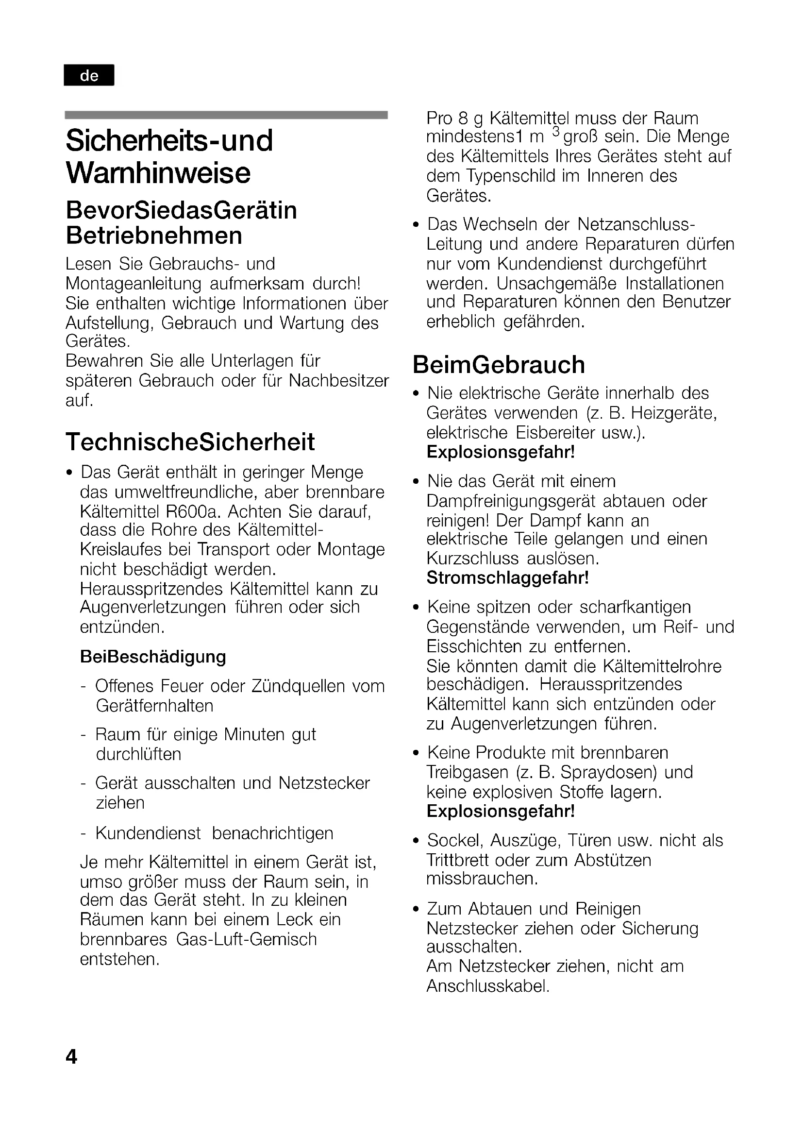 Kleine storingen zelf verhelpen 56. . . . . . . . Servicedienst 57. . . . . . . . . . . . . . . . . . . . . .4 Sicherheits und W arnhinweise Bevor Sie das Gerät in Betrieb nehmen Lesen Sie Gebrauchs und Montageanleitung aufmerksam durch! Sie enthalten wichtige Informationen über Aufstellung, Gebrauch und Wartung des Gerätes. Bewahren Sie alle Unterlagen für späteren Gebrauch oder für Nachbesitzer auf. Technische Sicherheit S Das Gerät enthält in geringer Menge das umweltfreundliche, aber brennbare Kältemittel R600a. Achten Sie darauf, dass die Rohre des Kältemittel Kreislaufes bei Transport oder Montage nicht beschädigt werden. Herausspritzendes Kältemittel kann zu Augenverletzungen führen oder sich entzünden. Bei Beschädigung − Offenes Feuer oder Zündquellen vom Gerät fernhalten − Raum für einige Minuten gut durchlüften − Gerät ausschalten und Netzstecker ziehen −Kundendienst benachrichtigen Je mehr Kältemittel in einem Gerät ist, umso größer muss der Raum sein, in dem das Gerät steht. In zu kleinen Räumen kann bei einem Leck ein brennbares GasLuftGemisch entstehen. Pro 8 g Kältemittel muss der Raum mindestens 1m