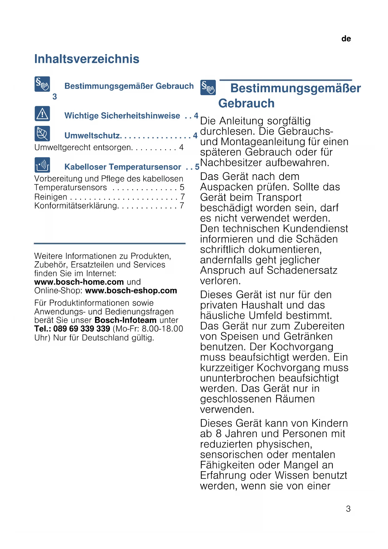 - Konformitätserklärung Produktinfo Weitere Informationen zu Produkten, Zubehör, Ersatzteilen und Services finden Sie im Internet: www.bosch-home.com und Online-Shop: www.bosch-eshop.com Für Produktinformationen sowie Anwendungs- und Bedienungsfragen berät Sie unser Bosch-Infoteam unter Tel.: 089 69 339 339 (Mo-Fr: 8.00-18.00 Uhr) Nur für Deutschland gültig. 8 Bestimmungsgemäßer Gebrauch Bestimmungsgemäßer Gebrauch Die Anleitung sorgfältig durchlesen. Die Gebrauchs- und Montageanleitung für einen späteren Gebrauch oder für Nachbesitzer aufbewahren. Das Gerät nach dem Auspacken prüfen. Sollte das Gerät beim Transport beschädigt worden sein, darf es nicht verwendet werden. Den technischen Kundendienst informieren und die Schäden schriftlich dokumentieren, andernfalls geht jeglicher Anspruch auf Schadenersatz verloren. Dieses Gerät ist nur für den privaten Haushalt und das häusliche Umfeld bestimmt. Das Gerät nur zum Zubereiten von Speisen und Getränken benutzen. Der Kochvorgang muss beaufsichtigt werden. Ein kurzzeitiger Kochvorgang muss ununterbrochen beaufsichtigt werden. Das Gerät nur in geschlossenen Räumen verwenden. Dieses Gerät kann von Kindern ab 8 Jahren und Personen mit reduzierten physischen, sensorischen oder mentalen Fähigkeiten oder Mangel an Erfahrung oder Wissen benutzt werden, wenn sie von einerde p. 7
