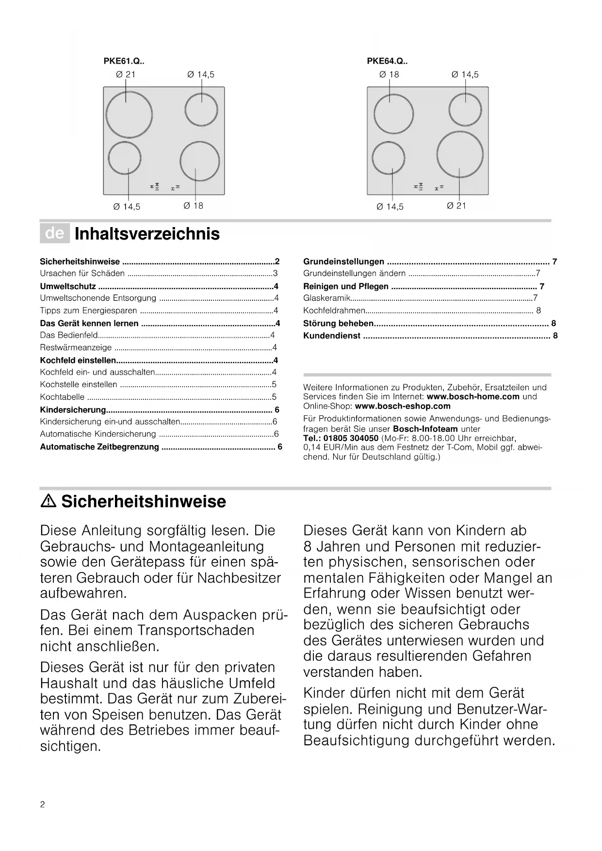 - Kundendienst Produktinfo Weitere Informationen zu Produkten, Zubehör, Ersatzteilen und Services finden Sie im Internet: www.bosch-home.com und Online-Shop: www.bosch-eshop.comFür Produktinformationen sowie Anwendungs- und Bedienungs-fragen berät Sie unser Bosch-Infoteam unter Tel.: 01805 304050 (Mo-Fr: 8.00-18.00 Uhr erreichbar, 0,14 EUR/Min aus dem Festnetz der T-Com, Mobil ggf. abwei-chend. Nur für Deutschland gültig.) ã=Sicherheitshinweise Diese Anleitung sorgfältig lesen. Die Gebrauchs- und Montageanleitung sowie den Gerätepass für einen spä- teren Gebrauch oder für Nachbesitzer aufbewahren. Das Gerät nach dem Auspacken prü- fen. Bei einem Transportschaden nicht anschließen. Dieses Gerät ist nur für den privaten Haushalt und das häusliche Umfeld bestimmt. Das Gerät nur zum Zuberei- ten von Speisen benutzen. Das Gerät während des Betriebes immer beauf- sichtigen. Dieses Gerät kann von Kindern ab 8 Jahren und Personen mit reduzier- ten physischen, sensorischen oder mentalen Fähigkeiten oder Mangel an Erfahrung oder Wissen benutzt wer- den, wenn sie beaufsichtigt oder bezüglich des sicheren Gebrauchs des Gerätes unterwiesen wurden und die daraus resultierenden Gefahren verstanden haben. Kinder dürfen nicht mit dem Gerät spielen. Reinigung und Benutzer-War- tung dürfen nicht durch Kinder ohne Beaufsichtigung durchgeführt werden. 3.(4 p. 8