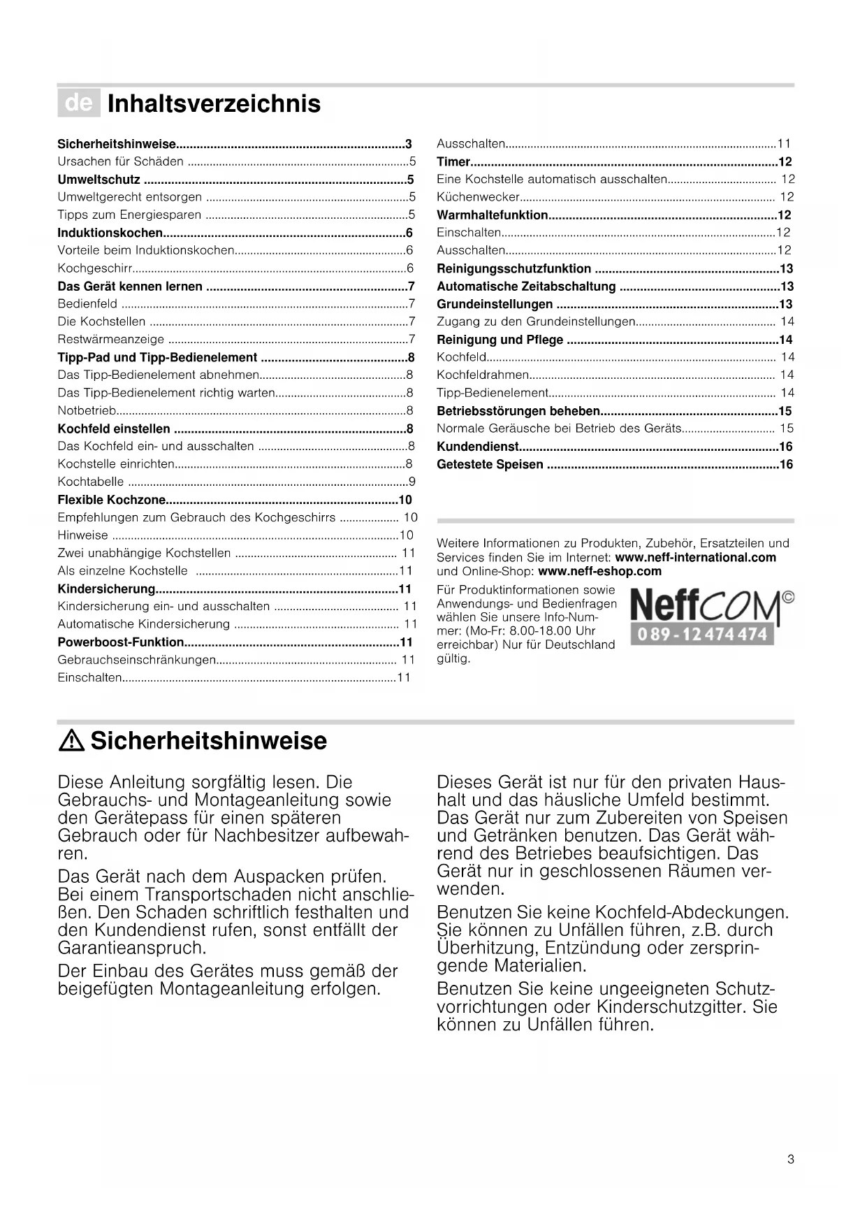 - Getestete Speisen Produktinfo Weitere Informationen zu Produkten, Zubehör, Ersatzteilen und Services finden Sie im Internet: www.neff-international.com und Online-Shop: www.neff-eshop.com Für Produktinformationen sowie Anwendungs- und Bedienfragen wählen Sie unsere Info-Num- mer: (Mo-Fr: 8.00-18.00 Uhr erreichbar) Nur für Deutschland gültig. : Sicherheitshinweise Diese Anleitung sorgfältig lesen. Die Gebrauchs- und Montageanleitung sowie den Gerätepass für einen späteren Gebrauch oder für Nachbesitzer aufbewah- ren. Das Gerät nach dem Auspacken prüfen. Bei einem Transportschaden nicht anschlie- ßen. Den Schaden schriftlich festhalten und den Kundendienst rufen, sonst entfällt der Garantieanspruch. Der Einbau des Gerätes muss gemäß der beigefügten Montageanleitung erfolgen. Dieses Gerät ist nur für den privaten Haus- halt und das häusliche Umfeld bestimmt. Das Gerät nur zum Zubereiten von Speisen und Getränken benutzen. Das Gerät wäh- rend des Betriebes beaufsichtigen. Das Gerät nur in geschlossenen Räumen ver- wenden. Benutzen Sie keine Kochfeld-Abdeckungen. Sie können zu Unfällen führen, z.B. durch Überhitzung, Entzündung oder zersprin- gende Materialien. Benutzen Sie keine ungeeigneten Schutz- vorrichtungen oder Kinderschutzgitter. Sie können zu Unfällen führen.4 Dieses Gerät ist nicht für den Betrieb mit einer externen Zeitschaltuhr oder einer Fernsteuerung bestimmt. Dieses Gerät kann von Kindern ab 8 Jahren und Personen mit reduzierten physischen, sensorischen oder mentalen Fähigkeiten oder Mangel an Erfahrung oder Wissen benutzt werden, wenn sie von einer Person, die für ihre Sicherheit verantwortlich ist, beaufsichtigt oder von ihr bezüglich des sicheren Gebrauchs des Gerätes unterwie- sen wurden und sie die daraus resultieren- den Gefahren verstanden haben. Kinder dürfen nicht mit dem Gerät spielen. Reinigung und Benutzer-Wartung dürfen nicht durch Kinder durchgeführt werden, es sei denn, sie sind 8 Jahre und älter und werden beaufsichtigt. Kinder jünger als 8 Jahre vom Gerät und der Anschlussleitung fernhalten. Falls Sie einen Herzschrittmacher oder eine andere elektronische Körperhilfe tragen, seien Sie vorsichtig wenn Sie sich vor einem eingeschalteten Induktionskochfeld befinden. Informieren Sie sich bei Ihrem Arzt oder dem Hersteller des medizinischen Gerätes hinsichtlich Konformität oder einer möglichen Unverträglichkeit. Brandgefahr! p. 16