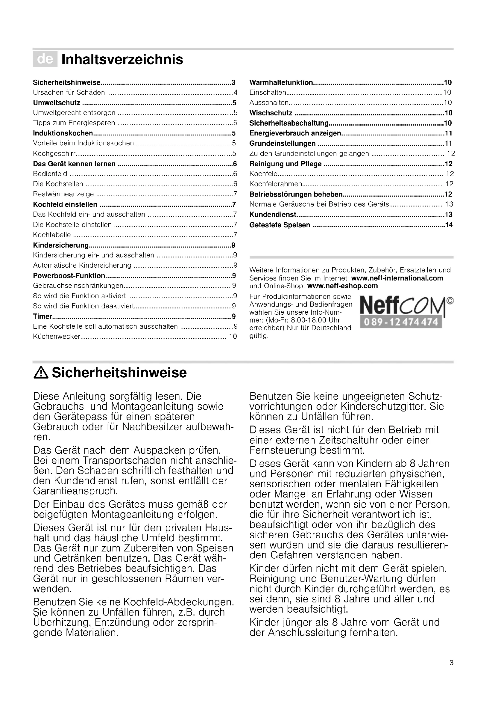 - Getestete Speisen Produktinfo Weitere Informationen zu Produkten, Zubehör, Ersatzteilen und Services finden Sie im Internet: www.neff-international.com und Online-Shop: www.neff-eshop.com Für Produktinformationen sowie Anwendungs- und Bedienfragen wählen Sie unsere Info-Num- mer: (Mo-Fr: 8.00-18.00 Uhr erreichbar) Nur für Deutschland gültig. : Sicherheitshinweise Diese Anleitung sorgfältig lesen. Die Gebrauchs- und Montageanleitung sowie den Gerätepass für einen späteren Gebrauch oder für Nachbesitzer aufbewah- ren. Das Gerät nach dem Auspacken prüfen. Bei einem Transportschaden nicht anschlie- ßen. Den Schaden schriftlich festhalten und den Kundendienst rufen, sonst entfällt der Garantieanspruch. Der Einbau des Gerätes muss gemäß der beigefügten Montageanleitung erfolgen. Dieses Gerät ist nur für den privaten Haus- halt und das häusliche Umfeld bestimmt. Das Gerät nur zum Zubereiten von Speisen und Getränken benutzen. Das Gerät wäh- rend des Betriebes beaufsichtigen. Das Gerät nur in geschlossenen Räumen ver- wenden. Benutzen Sie keine Kochfeld-Abdeckungen. Sie können zu Unfällen führen, z.B. durch Überhitzung, Entzündung oder zersprin- gende Materialien. Benutzen Sie keine ungeeigneten Schutz- vorrichtungen oder Kinderschutzgitter. Sie können zu Unfällen führen. Dieses Gerät ist nicht für den Betrieb mit einer externen Zeitschaltuhr oder einer Fernsteuerung bestimmt. Dieses Gerät kann von Kindern ab 8 Jahren und Personen mit reduzierten physischen, sensorischen oder mentalen Fähigkeiten oder Mangel an Erfahrung oder Wissen benutzt werden, wenn sie von einer Person, die für ihre Sicherheit verantwortlich ist, beaufsichtigt oder von ihr bezüglich des sicheren Gebrauchs des Gerätes unterwie- sen wurden und sie die daraus resultieren- den Gefahren verstanden haben. Kinder dürfen nicht mit dem Gerät spielen. Reinigung und Benutzer-Wartung dürfen nicht durch Kinder durchgeführt werden, es sei denn, sie sind 8 Jahre und älter und werden beaufsichtigt. Kinder jünger als 8 Jahre vom Gerät und der Anschlussleitung fernhalten.4 Falls Sie einen Herzschrittmacher oder eine andere elektronische Körperhilfe tragen, seien Sie vorsichtig wenn Sie sich vor einem eingeschalteten Induktionskochfeld befinden. Informieren Sie sich bei Ihrem Arzt oder dem Hersteller des medizinischen Gerätes hinsichtlich Konformität oder einer möglichen Unverträglichkeit. Brandgefahr! p. 14