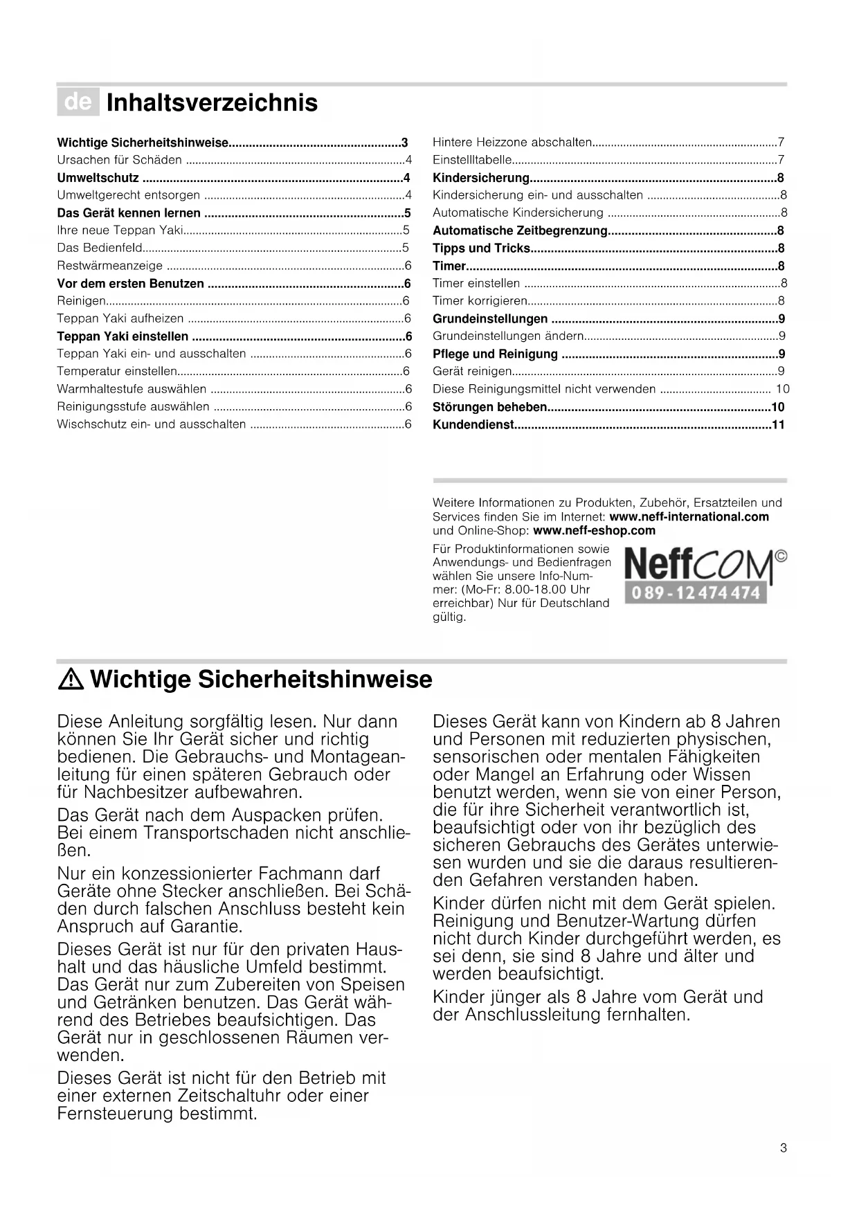 - Kundendienst Produktinfo Weitere Informationen zu Produkten, Zubehör, Ersatzteilen und Services finden Sie im Internet: www.neff-international.com und Online-Shop: www.neff-eshop.com Für Produktinformationen sowie Anwendungs- und Bedienfragen wählen Sie unsere Info-Num- mer: (Mo-Fr: 8.00-18.00 Uhr erreichbar) Nur für Deutschland gültig. : Wichtige Sicherheitshinweise Diese Anleitung sorgfältig lesen. Nur dann können Sie Ihr Gerät sicher und richtig bedienen. Die Gebrauchs- und Montagean- leitung für einen späteren Gebrauch oder für Nachbesitzer aufbewahren. Das Gerät nach dem Auspacken prüfen. Bei einem Transportschaden nicht anschlie- ßen. Nur ein konzessionierter Fachmann darf Geräte ohne Stecker anschließen. Bei Schä- den durch falschen Anschluss besteht kein Anspruch auf Garantie. Dieses Gerät ist nur für den privaten Haus- halt und das häusliche Umfeld bestimmt. Das Gerät nur zum Zubereiten von Speisen und Getränken benutzen. Das Gerät wäh- rend des Betriebes beaufsichtigen. Das Gerät nur in geschlossenen Räumen ver- wenden. Dieses Gerät ist nicht für den Betrieb mit einer externen Zeitschaltuhr oder einer Fernsteuerung bestimmt. Dieses Gerät kann von Kindern ab 8 Jahren und Personen mit reduzierten physischen, sensorischen oder mentalen Fähigkeiten oder Mangel an Erfahrung oder Wissen benutzt werden, wenn sie von einer Person, die für ihre Sicherheit verantwortlich ist, beaufsichtigt oder von ihr bezüglich des sicheren Gebrauchs des Gerätes unterwie- sen wurden und sie die daraus resultieren- den Gefahren verstanden haben. Kinder dürfen nicht mit dem Gerät spielen. Reinigung und Benutzer-Wartung dürfen nicht durch Kinder durchgeführt werden, es sei denn, sie sind 8 Jahre und älter und werden beaufsichtigt. Kinder jünger als 8 Jahre vom Gerät und der Anschlussleitung fernhalten.4 Brandgefahr! p. 11