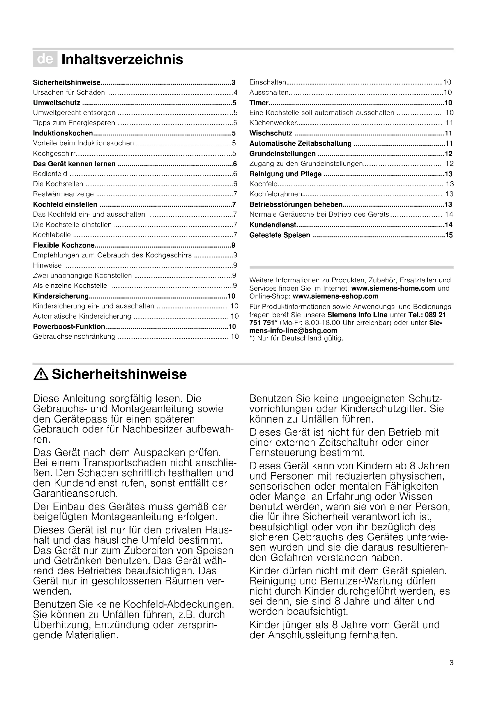 - Getestete Speisen Produktinfo Weitere Informationen zu Produkten, Zubehör, Ersatzteilen und Services finden Sie im Internet: www.siemens-home.com und Online-Shop: www.siemens-eshop.com Für Produktinformationen sowie Anwendungs- und Bedienungs- fragen berät Sie unsere Siemens Info Line unter Tel.: 089 21 751 751* (Mo-Fr: 8.00-18.00 Uhr erreichbar) oder unter Sie- mens-info-line@bshg.com *) Nur für Deutschland gültig. : Sicherheitshinweise Diese Anleitung sorgfältig lesen. Die Gebrauchs- und Montageanleitung sowie den Gerätepass für einen späteren Gebrauch oder für Nachbesitzer aufbewah- ren. Das Gerät nach dem Auspacken prüfen. Bei einem Transportschaden nicht anschlie- ßen. Den Schaden schriftlich festhalten und den Kundendienst rufen, sonst entfällt der Garantieanspruch. Der Einbau des Gerätes muss gemäß der beigefügten Montageanleitung erfolgen. Dieses Gerät ist nur für den privaten Haus- halt und das häusliche Umfeld bestimmt. Das Gerät nur zum Zubereiten von Speisen und Getränken benutzen. Das Gerät wäh- rend des Betriebes beaufsichtigen. Das Gerät nur in geschlossenen Räumen ver- wenden. Benutzen Sie keine Kochfeld-Abdeckungen. Sie können zu Unfällen führen, z.B. durch Überhitzung, Entzündung oder zersprin- gende Materialien. Benutzen Sie keine ungeeigneten Schutz- vorrichtungen oder Kinderschutzgitter. Sie können zu Unfällen führen. Dieses Gerät ist nicht für den Betrieb mit einer externen Zeitschaltuhr oder einer Fernsteuerung bestimmt. Dieses Gerät kann von Kindern ab 8 Jahren und Personen mit reduzierten physischen, sensorischen oder mentalen Fähigkeiten oder Mangel an Erfahrung oder Wissen benutzt werden, wenn sie von einer Person, die für ihre Sicherheit verantwortlich ist, beaufsichtigt oder von ihr bezüglich des sicheren Gebrauchs des Gerätes unterwie- sen wurden und sie die daraus resultieren- den Gefahren verstanden haben. Kinder dürfen nicht mit dem Gerät spielen. Reinigung und Benutzer-Wartung dürfen nicht durch Kinder durchgeführt werden, es sei denn, sie sind 8 Jahre und älter und werden beaufsichtigt. Kinder jünger als 8 Jahre vom Gerät und der Anschlussleitung fernhalten.4 Falls Sie einen Herzschrittmacher oder eine andere elektronische Körperhilfe tragen, seien Sie vorsichtig wenn Sie sich vor einem eingeschalteten Induktionskochfeld befinden. Informieren Sie sich bei Ihrem Arzt oder dem Hersteller des medizinischen Gerätes hinsichtlich Konformität oder einer möglichen Unverträglichkeit. Brandgefahr! p. 15