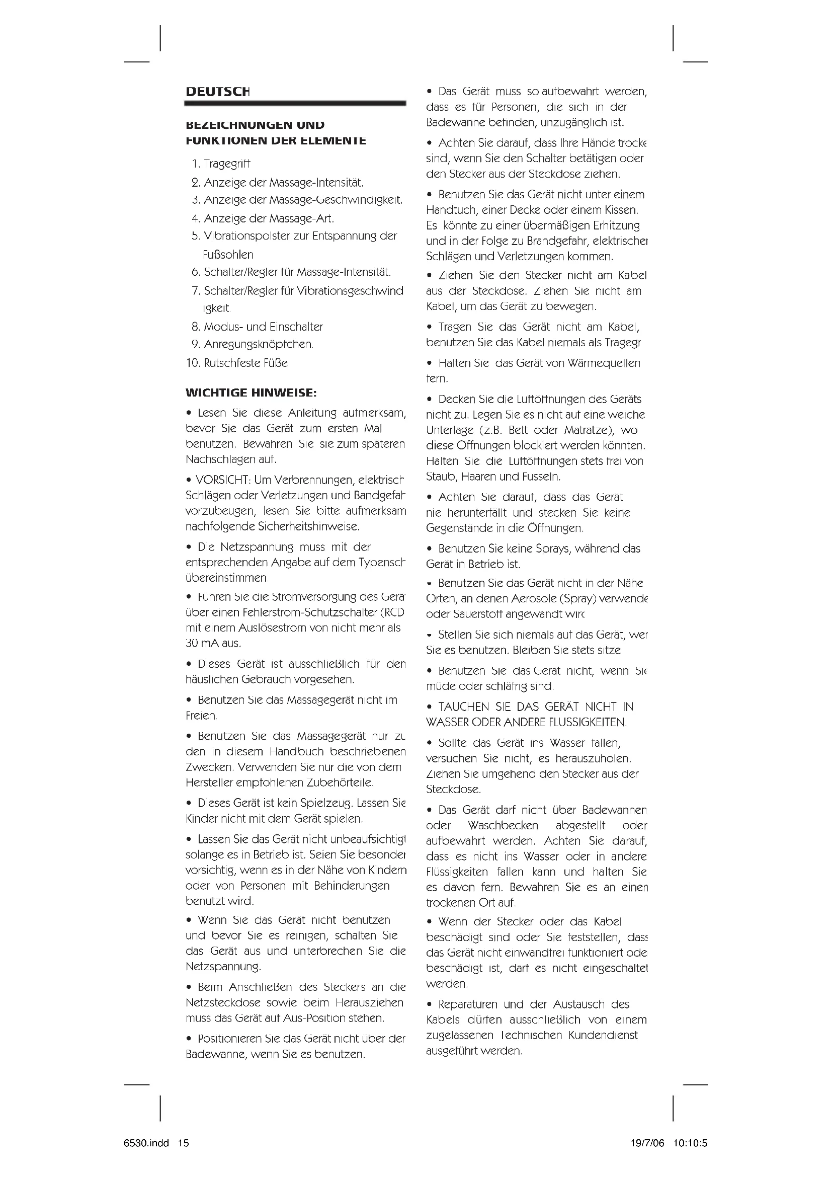 Dreimaliges Betätigen: Das Gerät schaltet aus. Ziehen Sie das Kabel aus der Steckdose. MJ6530.indd 16 19/7/06 10:10:54Zeitschalter zum automatischen Ausschalten: Der Zeitschalter wird beim Einschalten aktiviert und stoppt die Massage automatisch nach 15 Minuten. Der Zeitschalter funktioniert sowohl im Modus [ ] als auch im Modus