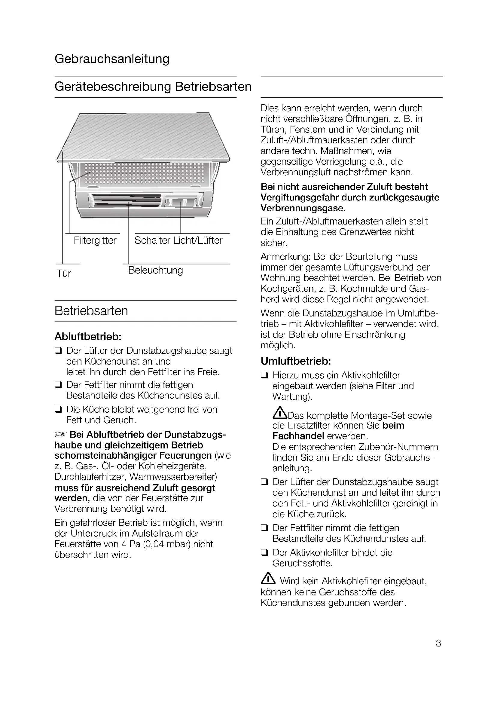 GAS GAZ KAASU GASS ELEKTRO ELECTR. ELETT. EL.Dies kann erreicht werden, wenn durchnicht verschließbare Öffnungen, z. B. inTüren, Fenstern und in Verbindung mitZuluft-/Abluftmauerkasten oder durchandere techn. Maßnahmen, wie gegenseitige Verriegelung o.ä., die Verbrennungsluft nachströmen kann.Bei nicht ausreichender Zuluft bestehtVergiftungsgefahr durch zurückgesaugteVerbrennungsgase.Ein Zuluft-/Abluftmauerkasten allein stelltdie Einhaltung des Grenzwertes nichtsicher.Anmerkung: Bei der Beurteilung mussimmer der gesamte Lüftungsverbund derWohnung beachtet werden. Bei Betrieb vonKochgeräten, z. B. Kochmulde und Gas-herd wird diese Regel nicht angewendet.Wenn die Dunstabzugshaube im Umluftbe-trieb – mit Aktivkohlefilter – verwendet wird,ist der Betrieb ohne Einschränkung möglich. Umluftbetrieb: K Hierzu muss ein Aktivkohlefilter eingebaut werden (siehe Filter und Wartung). Das komplette Montage-Set sowie die Ersatzfilter können Sie beimFachhandel erwerben.Die entsprechenden Zubehör-Nummernfinden Sie am Ende dieser Gebrauchs-anleitung.K Der Lüfter der Dunstabzugshaube saugtden Küchendunst an und leitet ihn durchden Fett- und Aktivkohlefilter gereinigt indie Küche zurück.K Der Fettfilter nimmt die fettigen Bestandteile des Küchendunstes auf.K Der Aktivkohlefilter bindet dieGeruchsstoffe. Wird kein Aktivkohlefilter eingebaut, können keine Geruchsstoffe des Küchendunstes gebunden werden. Betriebsarten Abluftbetrieb: K Der Lüfter der Dunstabzugshaube saugtden Küchendunst an und leitet ihn durch den Fettfilter ins Freie.K Der Fettfilter nimmt die fettigen Bestandteile des Küchendunstes auf.K Die Küche bleibt weitgehend frei vonFett und Geruch. Bei Abluftbetrieb der Dunstabzugs-haube und gleichzeitigem Betriebschornsteinabhängiger Feuerungen (wiez. B. Gas-, Öl- oder Kohleheizgeräte,Durchlauferhitzer, Warmwasserbereiter)muss für ausreichend Zuluft gesorgt werden, die von der Feuerstätte zur Verbrennung benötigt wird.Ein gefahrloser Betrieb ist möglich, wennder Unterdruck im Aufstellraum der Feuerstätte von 4 Pa (0,04 mbar) nichtüberschritten wird. Tür Filtergitter Beleuchtung Schalter Licht/Lüfter