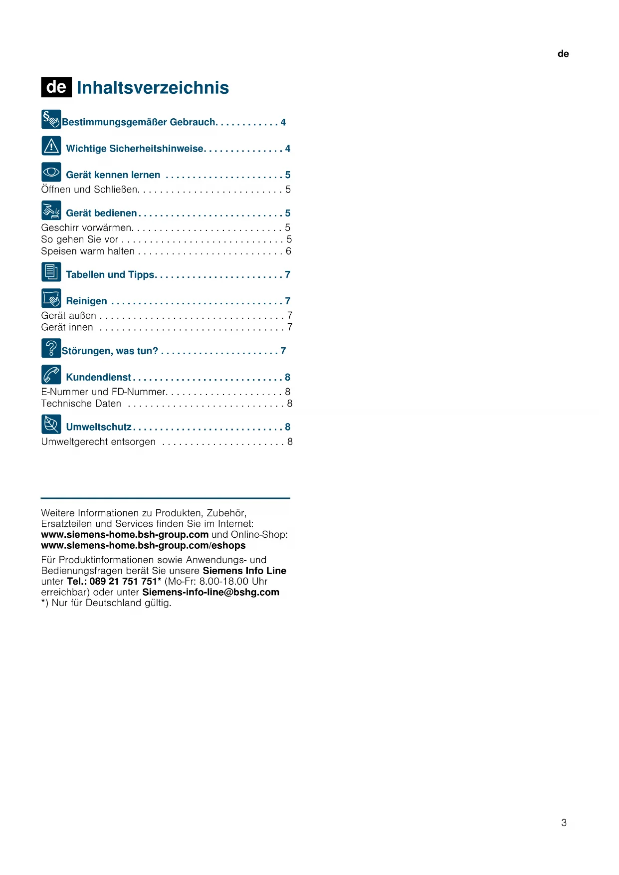 - Gerät kennen lernen . . . . . . . . . . . . . . . . . . . . . . 5 Öffnen und Schließen. . . . . . . . . . . . . . . . . . . . . . . . . . 5 1 Gerät bedienen. . . . . . . . . . . . . . . . . . . . . . . . . . . 5 Geschirr vorwärmen. . . . . . . . . . . . . . . . . . . . . . . . . . . 5 So gehen Sie vor . . . . . . . . . . . . . . . . . . . . . . . . . . . . . 5 Speisen warm halten . . . . . . . . . . . . . . . . . . . . . . . . . . 6 J Tabellen und Tipps. . . . . . . . . . . . . . . . . . . . . . . . 7 D Reinigen . . . . . . . . . . . . . . . . . . . . . . . . . . . . . . . . 7 Gerät außen . . . . . . . . . . . . . . . . . . . . . . . . . . . . . . . . . 7 Gerät innen . . . . . . . . . . . . . . . . . . . . . . . . . . . . . . . . . 7 3 Störungen, was tun? . . . . . . . . . . . . . . . . . . . . . . 7 4 Kundendienst . . . . . . . . . . . . . . . . . . . . . . . . . . . . 8 E-Nummer und FD-Nummer. . . . . . . . . . . . . . . . . . . . . 8 Technische Daten . . . . . . . . . . . . . . . . . . . . . . . . . . . . 8 7 Umweltschutz. . . . . . . . . . . . . . . . . . . . . . . . . . . . 8 Umweltgerecht entsorgen . . . . . . . . . . . . . . . . . . . . . . 8 Produktinfo Weitere Informationen zu Produkten, Zubehör, Ersatzteilen und Services finden Sie im Internet: www.siemens-home.bsh-group.com und Online-Shop: www.siemens-home.bsh-group.com/eshops Für Produktinformationen sowie Anwendungs- und Bedienungsfragen berät Sie unsere Siemens Info Line unter Tel.: 089 21 751 751* (Mo-Fr: 8.00-18.00 Uhr erreichbar) oder unter Siemens-info-line@bshg.com *) Nur für Deutschland gültig.de Bestimmungsgemäßer Gebrauch