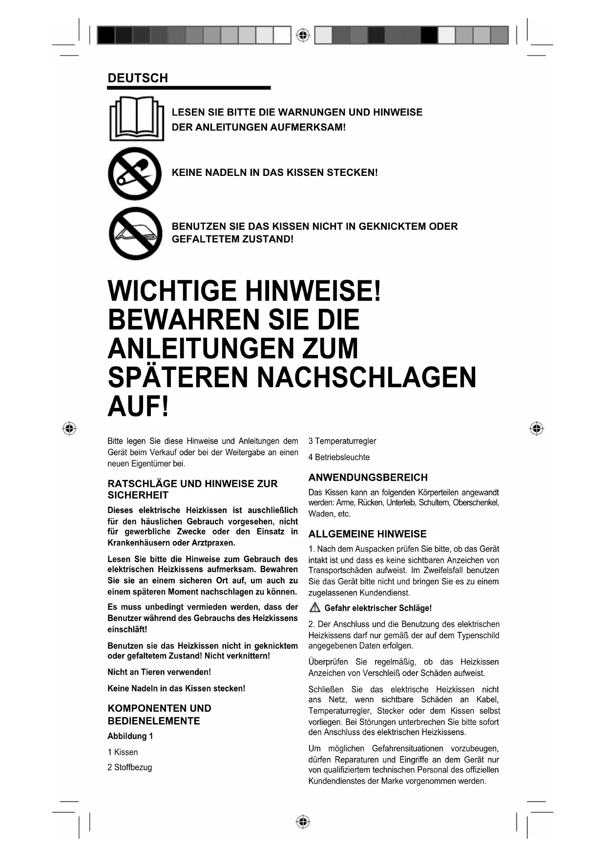 Sie bitte den Stecker aus der Steckdose und machen Sie es dann durch Abschneiden des Netzkabels unbrauchbar. Wir empfehlen, auch alle anderen, potenziell gefährlichen Teile des Geräts auf diese Weise unbrauchbar zu machen, insbesondere solche, die Kinder dazu verleiten könnten, sie als Spielzeug zu benutzen. INBETRIEBNAHME WICHTIG: Dieses Heizkissen ist mit einer Sicherheitsvorrichtung ausgestattet, die die Temperatur automatisch durch Ein- und Ausschalten des Stroms in regelmäßigen Abständen reguliert. Die Temperatur des Heizkissens entspricht dem zulässigen Höchstwert der geltenden CEI-Vorschriften bezüglich der Sicherheit des Benutzers. Das Gerät schafft eine milde Wärme, die keine schädlichen Effekte hat. - Stecken Sie das Heizkissen (1) in den Bezug (2). Vergewissern Sie sich, dass das Anschlusskabel und der Temperaturregler (3) sich außerhalb des Bezugs (2) befinden. Schließen sie den Reißverschluss oder den Klettverschluss. Vor dem Einschalten des Heizkissens vergewissern Sie sich bitte, dass das Bedienelement auf Position 0 steht. Danach stecken Sie den Stecker in die Steckdose. - Stellen Sie mit dem Temperaturregler (3) die gewünschte Temperatur ein. Abbildung 2 Wenn man die Temperatur am Regler (3) einstellt, schaltet sich das Heizkissen automatisch an und die Betriebsleuchte beginnt zu leuchten.Abbildung 3 Wird der Temperaturregler (3) auf die Position „0“ gestellt, schaltet das Heizkissen aus und die Betriebsleuchte (4) erlischt. Achtung! Stellen Sie sicher, dass bei der Benutzung des Heizkissens etwas Luft zwischen diesem und der Haut zirkuliert. Benutzen Sie das Heizkissen nicht ohne Bezug! Automatische Ausschaltung Das elektrische Heizkissen schaltet nach 90 Minuten Dauerbetrieb automatisch aus. Damit soll verhindert werden, dass das Kissen ohne Überwachung in Betrieb ist. Die Betriebsleuchte bleibt eingeschaltet. Um das Heizkissen erneut einzuschalten, stellen Sie den Temperaturregler zunächst auf Position „0“ und danach auf die gewünschte Temperatur. - Nach der Benutzung ziehen Sie bitte das Netzkabel aus der Steckdose. REINIGUNG / PFLEGE Achtung! Bevor Sie das Kissen reinigen, unterbrechen Sie bitte den Netzanschluss! - Der Stoffbezug des Kissens kann in der Waschmaschine gereinigt werden. Beachten Sie dabei bitte die Hinweise auf den Etiketten und die Pflegesymbole des Bezugs. Bevor Sie den Bezug waschen, nehmen Sie unbedingt das Heizkissen heraus! - Das elektrische Heizkissen darf weder in der Waschmaschine, noch mit chemischen Reinigungsmitteln oder in einer Trockenreinigung gereinigt werden. WICHTIG: Waschen Sie niemals das Innenteil des Geräts. Es darf auch keiner Trockenreinigung unterzogen werden. BENUTZEN SIE DAS HEIZKISSEN NICHT, SOLANGE ES FEUCHT IST. - Der Temperaturregler darf unter keinen Umständen mit Wasser in Berührung kommen. Halten Sie das Heizkissen nicht unter fließendes Wasser und tauchen Sie es nicht in Flüssigkeiten! Die Feuchtigkeit verursacht Schäden am Temperaturregler. - Verwenden Sie keine Reinigungs- oder Lösemittel! Dadurch kann das Gerät schwer beschädigt werden. AUFBEWAHRUNG UND