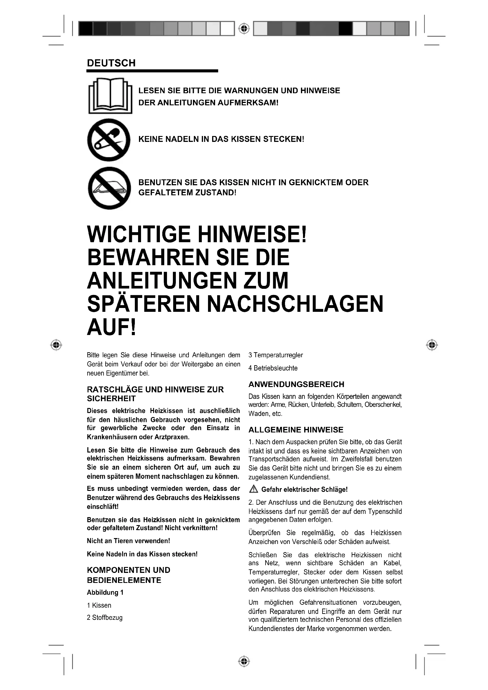Sie bitte den Stecker aus der Steckdose und machen Sie es dann durch Abschneiden des Netzkabels unbrauchbar. Wir empfehlen, auch alle anderen, potenziell gefährlichen Teile des Geräts auf diese Weise unbrauchbar zu machen, insbesondere solche, die Kinder dazu verleiten könnten, sie als Spielzeug zu benutzen. INBETRIEBNAHME WICHTIG: Dieses Heizkissen ist mit einer Sicherheitsvorrichtung ausgestattet, die die Temperatur automatisch durch Ein- und Ausschalten des Stroms in regelmäßigen Abständen reguliert. Die Temperatur des Heizkissens entspricht dem zulässigen Höchstwert der geltenden CEI-Vorschriften bezüglich der Sicherheit des Benutzers. Das Gerät schafft eine milde Wärme, die keine schädlichen Effekte hat. - Stecken Sie das Heizkissen (1) in den Bezug (2). Vergewissern Sie sich, dass das Anschlusskabel und der Temperaturregler (3) sich außerhalb des Bezugs (2) befinden. Schließen sie den Reißverschluss oder den Klettverschluss. Vor dem Einschalten des Heizkissens vergewissern Sie sich bitte, dass das Bedienelement auf Position 0 steht. Danach stecken Sie den Stecker in die Steckdose. - Stellen Sie mit dem Temperaturregler (3) die gewünschte Temperatur ein. Abbildung 2 Wenn man die Temperatur am Regler (3) einstellt, schaltet sich das Heizkissen automatisch an und die Betriebsleuchte beginnt zu leuchten.Abbildung 3 Wird der Temperaturregler (3) auf die Position „0“ gestellt, schaltet das Heizkissen aus und die Betriebsleuchte (4) erlischt. Achtung! Stellen Sie sicher, dass bei der Benutzung des Heizkissens etwas Luft zwischen diesem und der Haut zirkuliert. Benutzen Sie das Heizkissen nicht ohne Bezug! Automatische Ausschaltung Das elektrische Heizkissen schaltet nach 90 Minuten Dauerbetrieb automatisch aus. Damit soll verhindert werden, dass das Kissen ohne Überwachung in Betrieb ist. Die Betriebsleuchte bleibt eingeschaltet. Um das Heizkissen erneut einzuschalten, stellen Sie den Temperaturregler zunächst auf Position „0“ und danach auf die gewünschte Temperatur. - Nach der Benutzung ziehen Sie bitte das Netzkabel aus der Steckdose. REINIGUNG / PFLEGE Achtung! Bevor Sie das Kissen reinigen, unterbrechen Sie bitte den Netzanschluss! - Der Stoffbezug des Kissens kann in der Waschmaschine gereinigt werden. Beachten Sie dabei bitte die Hinweise auf den Etiketten und die Pflegesymbole des Bezugs. Bevor Sie den Bezug waschen, nehmen Sie unbedingt das Heizkissen heraus! - Das elektrische Heizkissen darf weder in der Waschmaschine, noch mit chemischen Reinigungsmitteln oder in einer Trockenreinigung gereinigt werden. WICHTIG: Waschen Sie niemals das Innenteil des Geräts. Es darf auch keiner Trockenreinigung unterzogen werden. BENUTZEN SIE DAS HEIZKISSEN NICHT, SOLANGE ES FEUCHT IST. - Der Temperaturregler darf unter keinen Umständen mit Wasser in Berührung kommen. Halten Sie das Heizkissen nicht unter fließendes Wasser und tauchen Sie es nicht in Flüssigkeiten! Die Feuchtigkeit verursacht Schäden am Temperaturregler. - Verwenden Sie keine Reinigungs- oder Lösemittel! Dadurch kann das Gerät schwer beschädigt werden. AUFBEWAHRUNG UND
