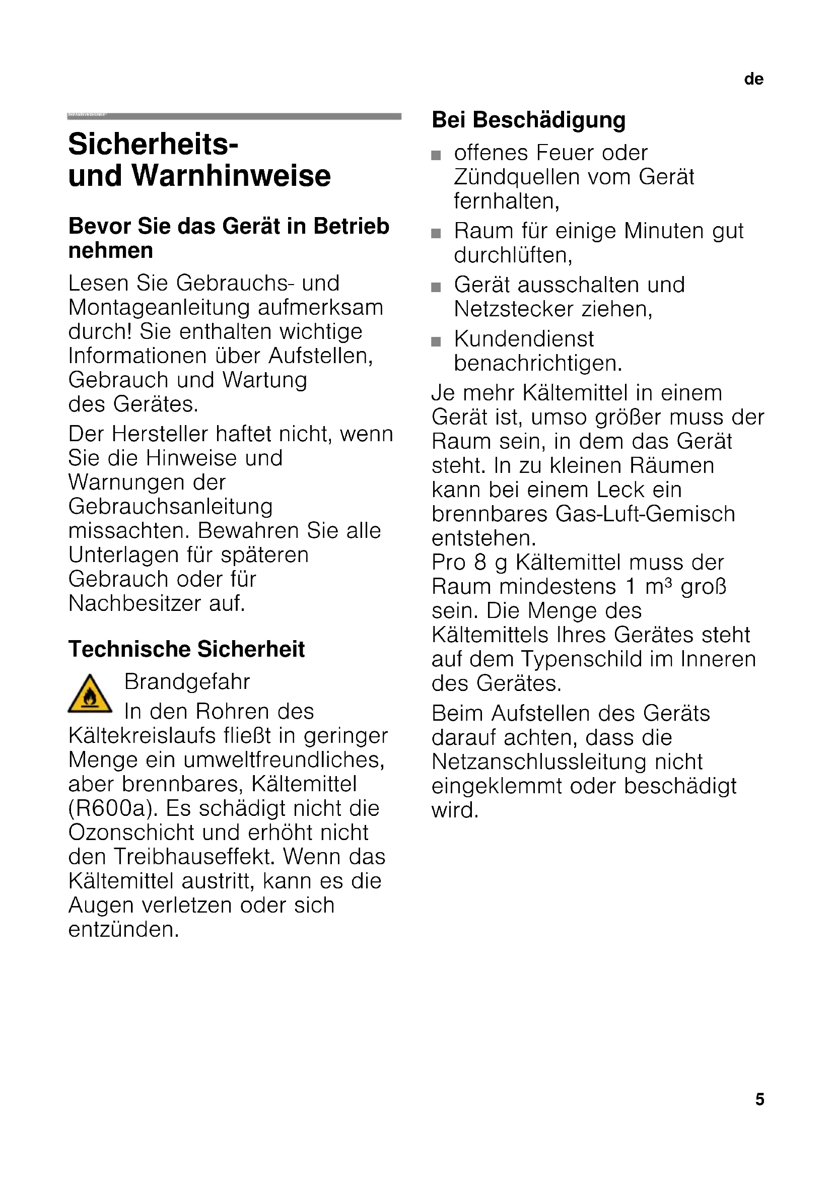 deInhaltsverzeichnis deGebrauchsanleitung Sicherheits- und Warnhinweise Bevor Sie das Gerät in Betrieb nehmen Lesen Sie Gebrauchs- und Montageanleitung aufmerksam durch! Sie enthalten wichtige Informationen über Aufstellen, Gebrauch und Wartung des Gerätes. Der Hersteller haftet nicht, wenn Sie die Hinweise und Warnungen der Gebrauchsanleitung missachten. Bewahren Sie alle Unterlagen für späteren Gebrauch oder für Nachbesitzer auf. Technische Sicherheit Brandgefahr In den Rohren des Kältekreislaufs fließt in geringer Menge ein umweltfreundliches, aber brennbares, Kältemittel (R600a). Es schädigt nicht die Ozonschicht und erhöht nicht den Treibhauseffekt. Wenn das Kältemittel austritt, kann es die Augen verletzen oder sich entzünden. Bei Beschädigung ■ offenes Feuer oder Zündquellen vom Gerät fernhalten, ■ Raum für einige Minuten gut durchlüften, ■ Gerät ausschalten und Netzstecker ziehen, ■ Kundendienst benachrichtigen. Je mehr Kältemittel in einem Gerät ist, umso größer muss der Raum sein, in dem das Gerät steht. In zu kleinen Räumen kann bei einem Leck ein brennbares Gas-Luft-Gemisch entstehen. Pro 8 g Kältemittel muss der Raum mindestens 1 m³ groß sein. Die Menge des Kältemittels Ihres Gerätes steht auf dem Typenschild im Inneren des Gerätes. Beim Aufstellen des Geräts darauf achten, dass die Netzanschlussleitung nicht eingeklemmt oder beschädigt wird.de