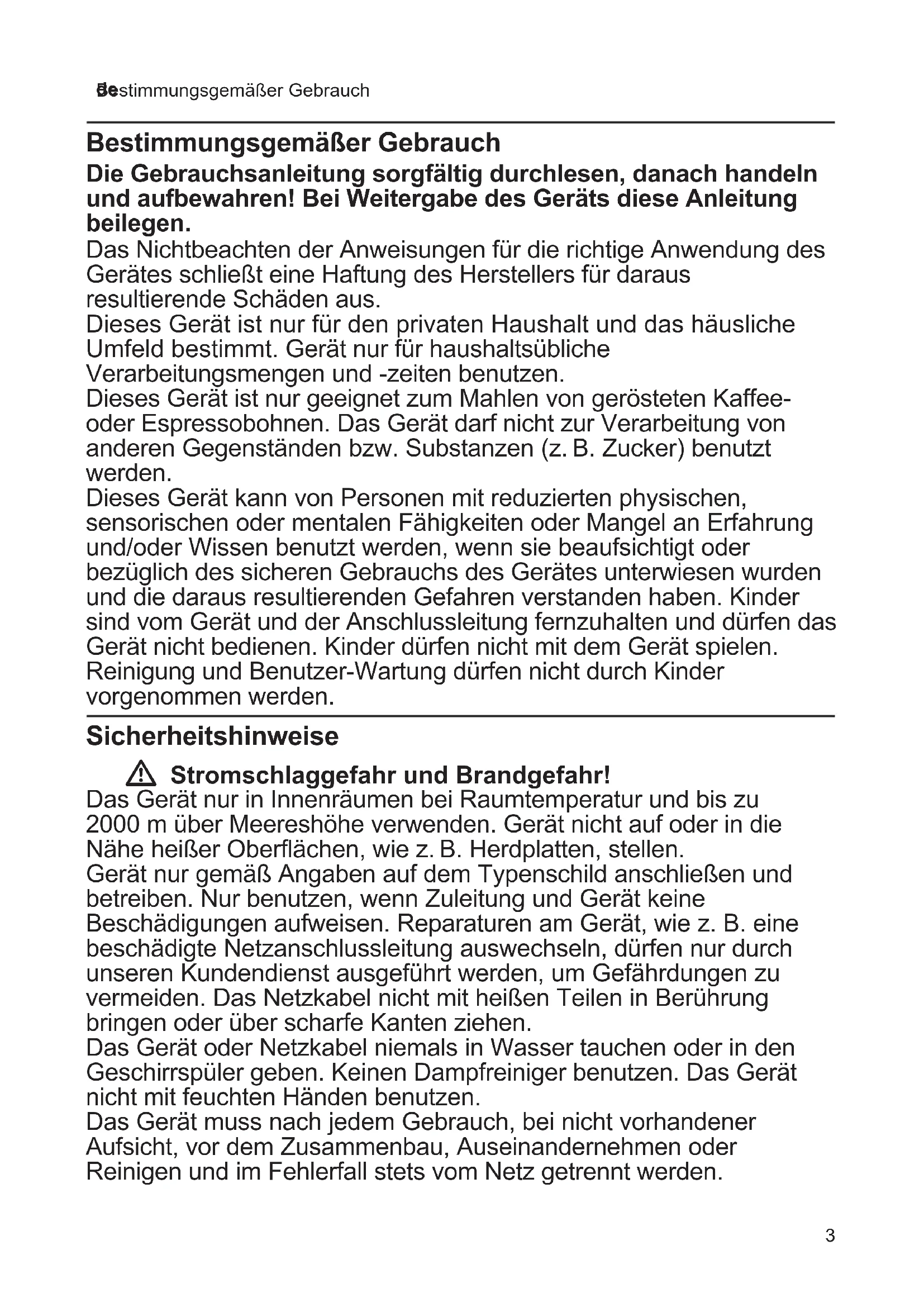 - Bestimmungsgemäßer Gebrauch Bestimmungsgemäßer Gebrauch Die Gebrauchsanleitung sorgfältig durchlesen, danach handeln und aufbewahren! Bei Weitergabe des Geräts diese Anleitung beilegen. Das Nichtbeachten der Anweisungen für die richtige Anwendung des Gerätes schließt eine Haftung des Herstellers für daraus resultierende Schäden aus. Dieses Gerät ist nur für den privaten Haushalt und das häusliche Umfeld bestimmt. Gerät nur für haushaltsübliche Verarbeitungsmengen und -zeiten benutzen. Dieses Gerät ist nur geeignet zum Mahlen von gerösteten Kaffee- oder Espressobohnen. Das Gerät darf nicht zur Verarbeitung von anderen Gegenständen bzw. Substanzen (z. B. Zucker) benutzt werden. Dieses Gerät kann von Personen mit reduzierten physischen, sensorischen oder mentalen Fähigkeiten oder Mangel an Erfahrung und/oder Wissen benutzt werden, wenn sie beaufsichtigt oder bezüglich des sicheren Gebrauchs des Gerätes unterwiesen wurden und die daraus resultierenden Gefahren verstanden haben. Kinder sind vom Gerät und der Anschlussleitung fernzuhalten und dürfen das Gerät nicht bedienen. Kinder dürfen nicht mit dem Gerät spielen. Reinigung und Benutzer-Wartung dürfen nicht durch Kinder vorgenommen werden. Sicherheitshinweise W Stromschlaggefahr und Brandgefahr! Das Gerät nur in Innenräumen bei Raumtemperatur und bis zu 2000 m über Meereshöhe verwenden. Gerät nicht auf oder in die Nähe heißer Oberflächen, wie z. B. Herdplatten, stellen. Gerät nur gemäß Angaben auf dem Typenschild anschließen und betreiben. Nur benutzen, wenn Zuleitung und Gerät keine Beschädigungen aufweisen. Reparaturen am Gerät, wie z. B. eine beschädigte Netzanschlussleitung auswechseln, dürfen nur durch unseren Kundendienst ausgeführt werden, um Gefährdungen zu vermeiden. Das Netzkabel nicht mit heißen Teilen in Berührung bringen oder über scharfe Kanten ziehen. Das Gerät oder Netzkabel niemals in Wasser tauchen oder in den Geschirrspüler geben. Keinen Dampfreiniger benutzen. Das Gerät nicht mit feuchten Händen benutzen. Das Gerät muss nach jedem Gebrauch, bei nicht vorhandener Aufsicht, vor dem Zusammenbau, Auseinandernehmen oder Reinigen und im Fehlerfall stets vom Netz getrennt werden.4 de Sicherheitshinweise W Verletzungsgefahr! Das Gerät während des Betriebs stets beaufsichtigen! Das Gerät niemals länger eingeschaltet lassen, wie für die Verarbeitung der Lebensmittel notwendig. Nach dem unmittelbaren Einsatz des Gerätes den Stillstand des Antriebes abwarten. Das Gerät nicht im Leerlauf betreiben. W Wichtig! Nach dreimaliger Benutzung des Gerätes ohne Unterbrechung ist eine Pause von ca. 60 Minuten erforderlich. Das Gerät nach jeder Verwendung oder nach längerem Nicht- gebrauch unbedingt wie beschrieben reinigen. X „Reinigung und Pflege“ siehe Seite 5 Herzlichen Glückwunsch zum Kauf Ihres neuen Gerätes aus dem Hause Bosch. Weitere Informationen zu unseren Produkten finden Sie auf unserer Internetseite. Inhalt Bestimmungsgemäßer Gebrauch p. 3