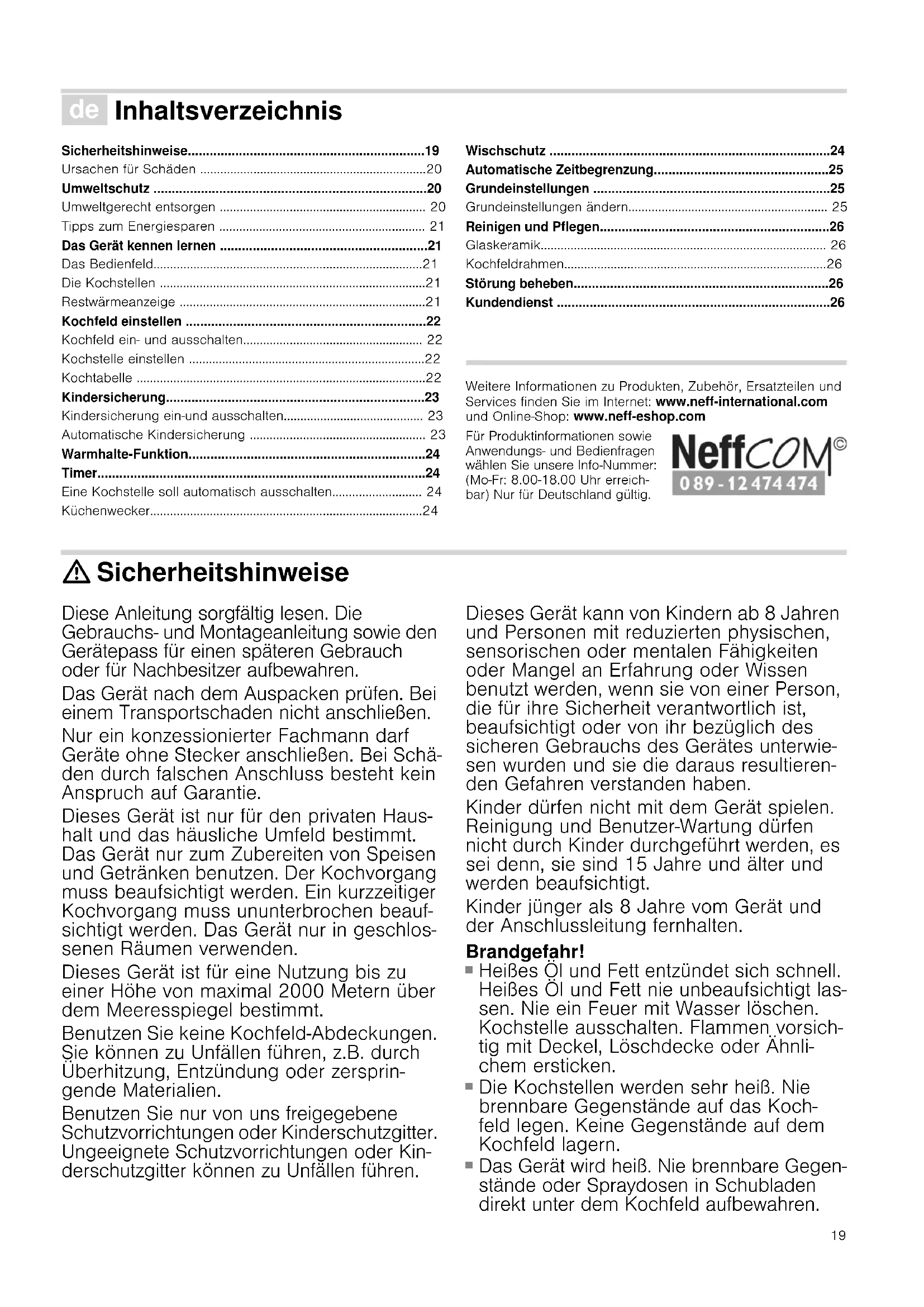 - Kundendienst Produktinfo Weitere Informationen zu Produkten, Zubehör, Ersatzteilen und Services finden Sie im Internet: www.neff-international.com und Online-Shop: www.neff-eshop.com Für Produktinformationen sowie Anwendungs- und Bedienfragen wählen Sie unsere Info-Nummer: (Mo-Fr: 8.00-18.00 Uhr erreich- bar) Nur für Deutschland gültig. : Sicherheitshinweise Diese Anleitung sorgfältig lesen. Die Gebrauchs- und Montageanleitung sowie den Gerätepass für einen späteren Gebrauch oder für Nachbesitzer aufbewahren. Das Gerät nach dem Auspacken prüfen. Bei einem Transportschaden nicht anschließen. Nur ein konzessionierter Fachmann darf Geräte ohne Stecker anschließen. Bei Schä- den durch falschen Anschluss besteht kein Anspruch auf Garantie. Dieses Gerät ist nur für den privaten Haus- halt und das häusliche Umfeld bestimmt. Das Gerät nur zum Zubereiten von Speisen und Getränken benutzen. Der Kochvorgang muss beaufsichtigt werden. Ein kurzzeitiger Kochvorgang muss ununterbrochen beauf- sichtigt werden. Das Gerät nur in geschlos- senen Räumen verwenden. Dieses Gerät ist für eine Nutzung bis zu einer Höhe von maximal 2000 Metern über dem Meeresspiegel bestimmt. Benutzen Sie keine Kochfeld-Abdeckungen. Sie können zu Unfällen führen, z.B. durch Überhitzung, Entzündung oder zersprin- gende Materialien. Benutzen Sie nur von uns freigegebene Schutzvorrichtungen oder Kinderschutzgitter. Ungeeignete Schutzvorrichtungen oder Kin- derschutzgitter können zu Unfällen führen. Dieses Gerät kann von Kindern ab 8 Jahren und Personen mit reduzierten physischen, sensorischen oder mentalen Fähigkeiten oder Mangel an Erfahrung oder Wissen benutzt werden, wenn sie von einer Person, die für ihre Sicherheit verantwortlich ist, beaufsichtigt oder von ihr bezüglich des sicheren Gebrauchs des Gerätes unterwie- sen wurden und sie die daraus resultieren- den Gefahren verstanden haben. Kinder dürfen nicht mit dem Gerät spielen. Reinigung und Benutzer-Wartung dürfen nicht durch Kinder durchgeführt werden, es sei denn, sie sind 15 Jahre und älter und werden beaufsichtigt. Kinder jünger als 8 Jahre vom Gerät und der Anschlussleitung fernhalten. Brandgefahr! p. 26
