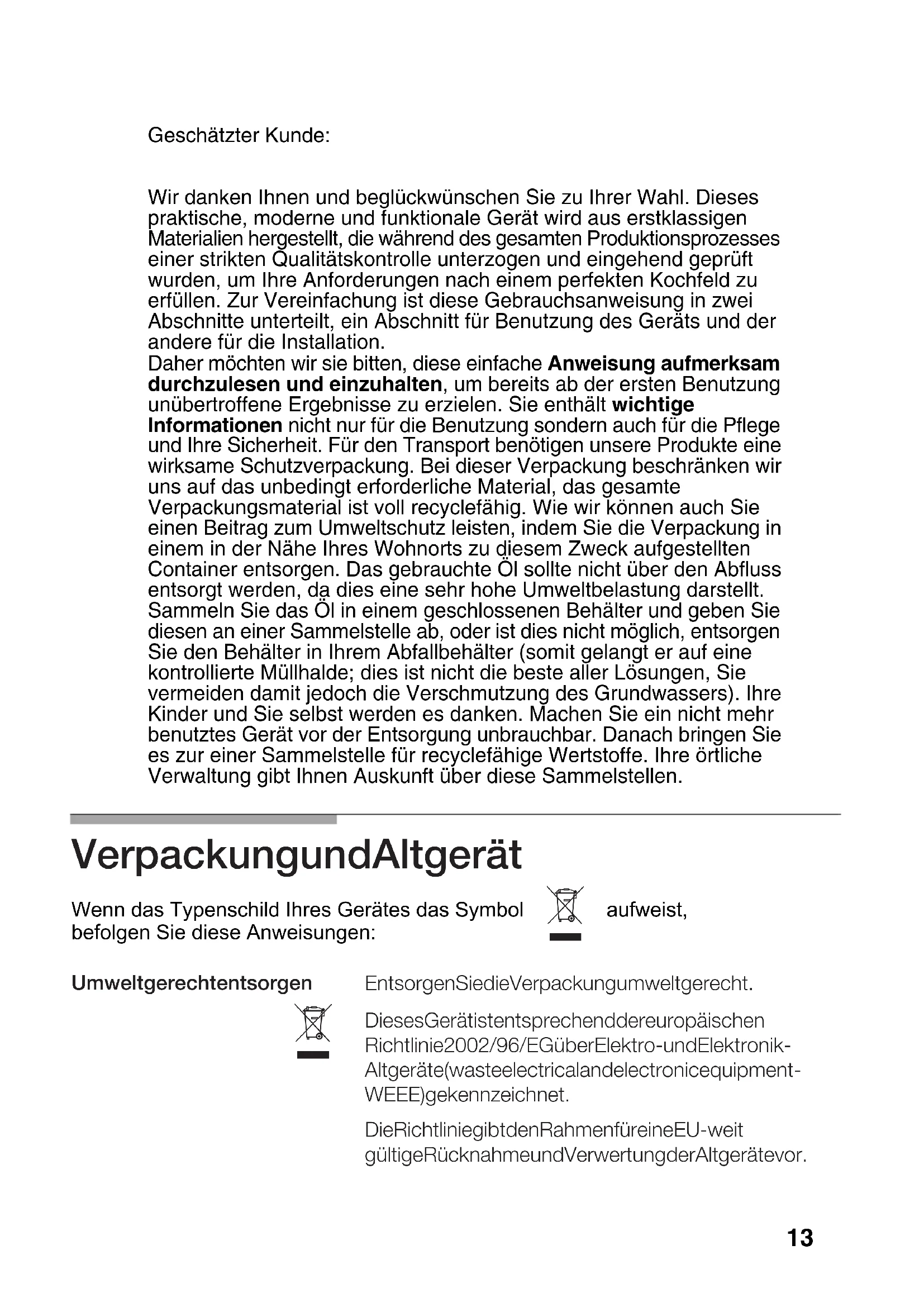 The high temperatures suffered by the cover on the triple-flame burner ring and the stainless steel parts on your hob (plate rings, grease trays, area around burners, etc) may become discoloured over time. This is NORMAL. Clean them after use with a product suitable for stainless steel. After washing the pans support, dry them thoroughly before cooking with them again. The presence of droplets of water or dampness at the beginning of the cooking process may damage the enamel surface. Be careful with the feet on the metal grids when cleaning them; if they are detached, the grid may scratch the glass next time it is used.Troubleshooting ...if none of the electrical system works? -Faulty fuse. -Check the fuse in the main fuse box and replace it if it is faulty -The automatic circuit breaker or mains differential has been triggered. -Check to see if the circuit breaker or a differential has been triggered in the mains supply box ...if the electric ignition system does not work? -There may be food or cleaning product particles between the spark plugs and the burners. -The burners are wet. -Dry the burner covers and spark plugs carefully. -Check that the covers have been put in the proper position. -The covers on the burners are not in the right position. ...if the flame on the burners is not evenly distributed? -The burner components have not been assembled properly. -The gas outlets on the burners are dirty. -Put the components in their correct positions. -Clean the gas outlets on the burners. ...if the gas flow does not seem normal or there is no gas flow at all? -The gas flow has been cut at an intermediate stopcock. -If the gas is supplied from a gas bottle, it may be empty. - Open any intermediate stopcocks. -Replace the gas bottle with a full one. ...if the kitchen smells of gas? -One of the valves has been left open. -Possible leak on the gas bottle coupling. -Check to see if a valve has been left open. -Check that the coupling on the gas bottle is in order. What´s wrong Possible cause Solution -The gap between the spark plug and the burner needs to be cleaned carefully. It is not always necessary to call the Service Centre. In some cases, you may be able to solve the problem yourself. This table contains some useful information. Important information: Only authorised personnel from our Service Centre are qualified to work on the main gas and electric systems. ...if the safety devices on the different burners do not work? -The control knob has not been kept pressed in for long enough. -The outlets on the burners are dirty. -Once ignited, keep the control knob pressed in for a few seconds. -Clean the gas outlets on the burners. 11Conditions of warranty The conditions of warranty are those set out by our company's representatives in the country where you purchased your appliance. The salesperson that sold you the appliance will be only too pleased to inform you as to the details of these conditions. Proof of purchase must be produced when making any kind of claim against the warranty. The manufacturer reserves the right to modify these conditions. Should you need to contact our Service Centre, please quote the following information: E - NR FD These indications appear on your appliance's characteristics plate on the bottom of your appliance. 12Geschätzter Kunde: Wir danken Ihnen und beglückwünschen Sie zu Ihrer Wahl. Dieses praktische, moderne und funktionale Gerät wird aus erstklassigen Materialien hergestellt, die während des gesamten Produktionsprozesses einer strikten Qualitätskontrolle unterzogen und eingehend geprüft wurden, um Ihre Anforderungen nach einem perfekten Kochfeld zu erfüllen. Zur Vereinfachung ist diese Gebrauchsanweisung in zwei Abschnitte unterteilt, ein Abschnitt für Benutzung des Geräts und der andere für die Installation. Daher möchten wir sie bitten, diese einfache Anweisung aufmerksam durchzulesen und einzuhalten, um bereits ab der ersten Benutzung unübertroffene Ergebnisse zu erzielen. Sie enthält wichtige Informationen nicht nur für die Benutzung sondern auch für die Pflege und Ihre Sicherheit. Für den Transport benötigen unsere Produkte eine wirksame Schutzverpackung. Bei dieser Verpackung beschränken wir uns auf das unbedingt erforderliche Material, das gesamte Verpackungsmaterial ist voll recyclefähig. Wie wir können auch Sie einen Beitrag zum Umweltschutz leisten, indem Sie die Verpackung in einem in der Nähe Ihres Wohnorts zu diesem Zweck aufgestellten Container entsorgen. Das gebrauchte Öl sollte nicht über den Abfluss entsorgt werden, da dies eine sehr hohe Umweltbelastung darstellt. Sammeln Sie das Öl in einem geschlossenen Behälter und geben Sie diesen an einer Sammelstelle ab, oder ist dies nicht möglich, entsorgen Sie den Behälter in Ihrem Abfallbehälter (somit gelangt er auf eine kontrollierte Müllhalde; dies ist nicht die beste aller Lösungen, Sie vermeiden damit jedoch die Verschmutzung des Grundwassers). Ihre Kinder und Sie selbst werden es danken. Machen Sie ein nicht mehr benutztes Gerät vor der Entsorgung unbrauchbar. Danach bringen Sie es zur einer Sammelstelle für recyclefähige Wertstoffe. Ihre örtliche Verwaltung gibt Ihnen Auskunft über diese Sammelstellen.
