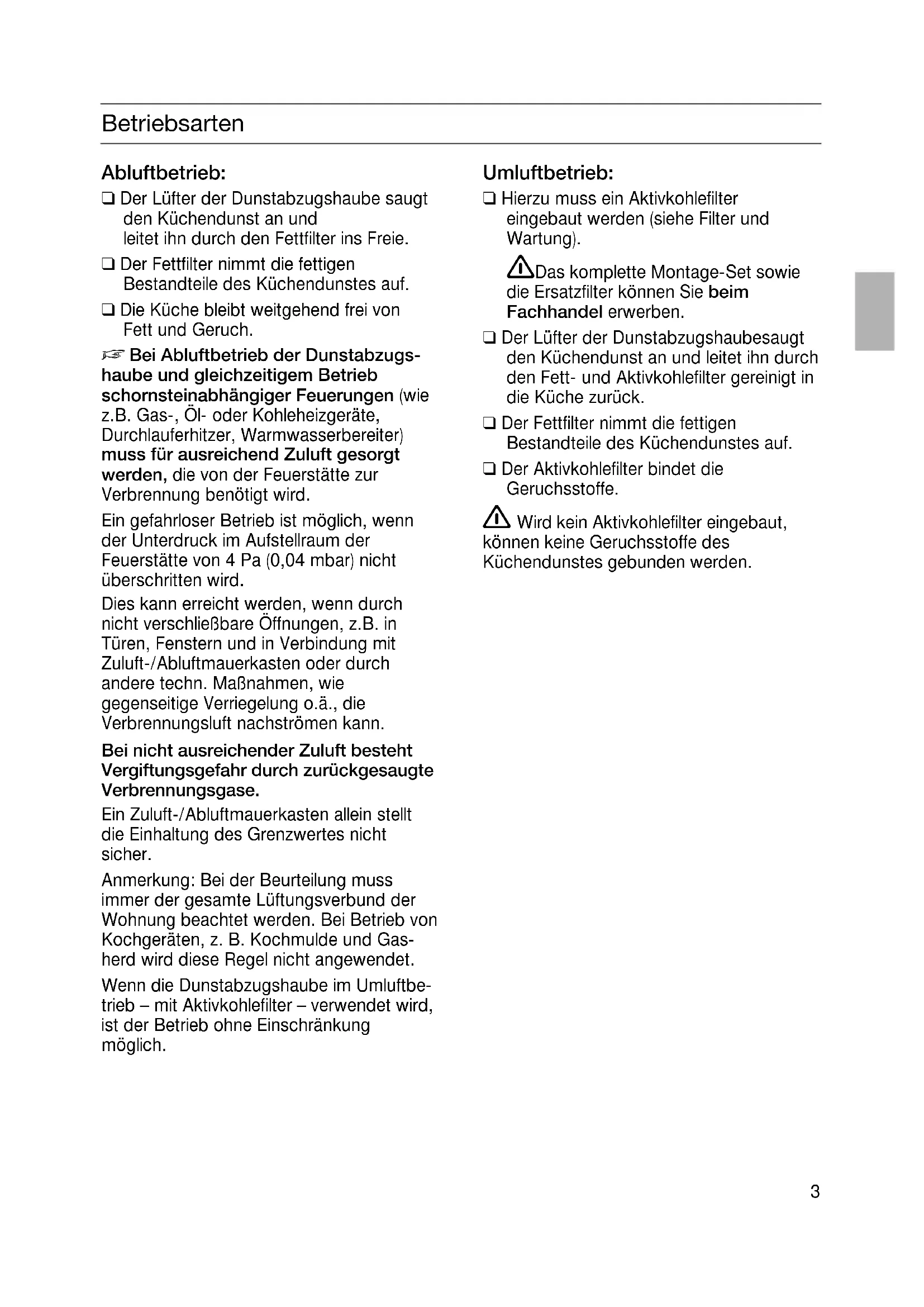 Bei Abluftbetrieb der Dunstabzugs- haube und gleichzeitigem Betrieb schornsteinabhängiger Feuerungen (wie z.B. Gas-, Öl- oder Kohleheizgeräte, Durchlauferhitzer, Warmwasserbereiter) muss für ausreichend Zuluft gesorgt werden, die von der Feuerstätte zur Verbrennung benötigt wird. Ein gefahrloser Betrieb ist möglich, wenn der Unterdruck im Aufstellraum der Feuerstätte von 4 Pa (0,04 mbar) nicht überschritten wird. Dies kann erreicht werden, wenn durch nicht verschließbare Öffnungen, z.B. in Türen, Fenstern und in Verbindung mit Zuluft-/Abluftmauerkasten oder durch andere techn. Maßnahmen, wie gegenseitige Verriegelung o.ä., die Verbrennungsluft nachströmen kann. Bei nicht ausreichender Zuluft besteht Vergiftungsgefahr durch zurückgesaugte Verbrennungsgase. Ein Zuluft-/Abluftmauerkasten allein stellt die Einhaltung des Grenzwertes nicht sicher. Anmerkung: Bei der Beurteilung muss immer der gesamte Lüftungsverbund der Wohnung beachtet werden. Bei Betrieb von Kochgeräten, z. B. Kochmulde und Gas- herd wird diese Regel nicht angewendet. Wenn die Dunstabzugshaube im Umluftbe- trieb – mit Aktivkohlefilter – verwendet wird, ist der Betrieb ohne Einschränkung möglich. Umluftbetrieb: ❑ Hierzu muss ein Aktivkohlefilter eingebaut werden (siehe Filter und Wartung). Das komplette Montage-Set sowie die Ersatzfilter können Sie beim Fachhandel erwerben. ❑ Der Lüfter der Dunstabzugshaubesaugt den Küchendunst an und leitet ihn durch den Fett- und Aktivkohlefilter gereinigt in die Küche zurück. ❑ Der Fettfilter nimmt die fettigen Bestandteile des Küchendunstes auf. ❑ Der Aktivkohlefilter bindet die Geruchsstoffe. Wird kein Aktivkohlefilter eingebaut, können keine Geruchsstoffe des Küchendunstes gebunden werden.4 Vor dem ersten Benutzen Wichtige Hinweise: ❑ Diese Gebrauchsanleitung gilt für mehrere Geräte-Ausführungen. Es ist möglich, dass einzelne Ausstattungsmerkmale beschrieben sind, die nicht auf Ihr Gerät zutreffen. ❑ Diese Dunstabzugshaube entspricht den einschlägigen Sicherheitsbestimmungen. Reparaturen dürfen nur von Fachkräften durchgeführt werden. Durch unsachgemäße Reparaturen können erhebliche Gefahren für den Benutzer entstehen. ❑ Bevor Sie das neue Gerät benutzen, lesen Sie bitte sorgfältig die Gebrauchsanleitung. Sie enthält wichtige Informationen für Ihre Sicherheit sowie zum Gebrauch und zur Pflege des Gerätes. ❑ Bewahren Sie die Gebrauchs- und Montageanleitung ggf. für einen Nachbesitzer gut auf. Gas-Kochmulden / Gas-Herde Betreiben Sie nicht alle Gas- Kochstellen gleichzeitig über längere Zeit (max. 15 Minuten) bei höchster Wärmebelastung, sonst besteht Verbrennungsgefahr bei Berührung der Gehäuseoberflächen bzw. Gefahr der Beschädigung der Dunstabzugshaube. Beim Betrieb der Dunstabzugshaube über einem Gas-Kochfeld muss bei gleich- zeitigem Betreiben von drei oder mehr Gas-Kochstellen die Haube in der Maximalstufe betrieben werden. ❑ Dieses Gerät ist ent- sprechend der europäischen Richtlinie 2002/96/EG über Elektro- und Elektronik-Altgeräte (waste electrical and electronic equipment – WEEE) gekennzeichnet. Die Richtlinie gibt den Rahmen für eine EU-weit gültige Rücknahme und Verwertung der Altgeräte vor.