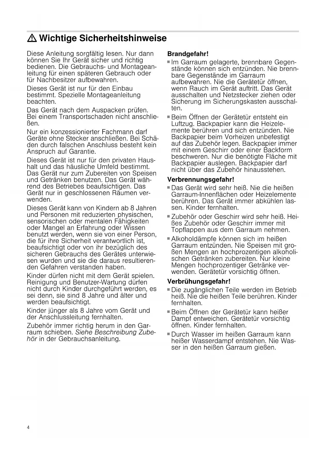 Das Gerät wird sehr heiß. Nie die heißen Garraum-Innenflächen oder Heizelemente berühren. Das Gerät immer abkühlen las- sen. Kinder fernhalten. Verbrennungsgefahr!