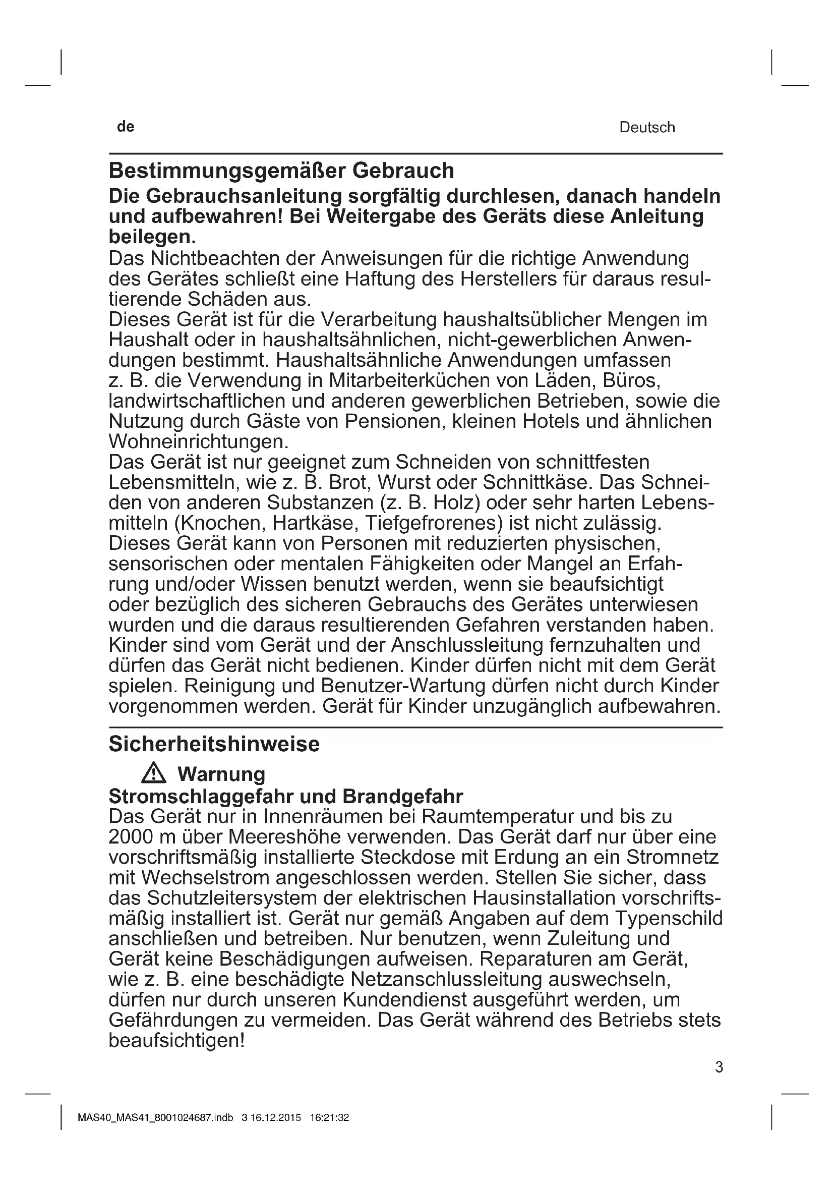 - Deutsch Bestimmungsgemäßer Gebrauch Die Gebrauchsanleitung sorgfältig durchlesen, danach handeln und aufbewahren! Bei Weitergabe des Geräts diese Anleitung beilegen. DasNichtbeachtenderAnweisungenfürdierichtigeAnwendung desGerätesschließteineHaftungdesHerstellersfürdarausresul- tierendeSchädenaus. DiesesGerätistfürdieVerarbeitunghaushaltsüblicherMengenim Haushaltoderinhaushaltsähnlichen,nicht-gewerblichenAnwen- dungenbestimmt.HaushaltsähnlicheAnwendungenumfassen z.B.dieVerwendunginMitarbeiterküchenvonLäden,Büros, landwirtschaftlichenundanderengewerblichenBetrieben,sowiedie NutzungdurchGästevonPensionen,kleinenHotelsundähnlichen Wohneinrichtungen. DasGerätistnurgeeignetzumSchneidenvonschnittfesten Lebensmitteln,wiez.B.Brot,WurstoderSchnittkäse.DasSchnei- denvonanderenSubstanzen(z.B.Holz)odersehrhartenLebens- mitteln(Knochen,Hartkäse,Tiefgefrorenes)istnichtzulässig. DiesesGerätkannvonPersonenmitreduziertenphysischen, sensorischenodermentalenFähigkeitenoderMangelanErfah- rungund/oderWissenbenutztwerden,wennsiebeaufsichtigt oderbezüglichdessicherenGebrauchsdesGerätesunterwiesen wurdenunddiedarausresultierendenGefahrenverstandenhaben. KindersindvomGerätundderAnschlussleitungfernzuhaltenund dürfendasGerätnichtbedienen.KinderdürfennichtmitdemGerät spielen.ReinigungundBenutzer-WartungdürfennichtdurchKinder vorgenommenwerden.GerätfürKinderunzugänglichaufbewahren. Sicherheitshinweise W Warnung Stromschlaggefahr und Brandgefahr DasGerätnurinInnenräumenbeiRaumtemperaturundbiszu 2000müberMeereshöheverwenden.DasGerätdarfnurübereine vorschriftsmäßiginstallierteSteckdosemitErdunganeinStromnetz mitWechselstromangeschlossenwerden.StellenSiesicher,dass dasSchutzleitersystemderelektrischenHausinstallationvorschrifts- mäßiginstalliertist.GerätnurgemäßAngabenaufdemTypenschild anschließenundbetreiben.Nurbenutzen,wennZuleitungund GerätkeineBeschädigungenaufweisen.ReparaturenamGerät, wiez.B.einebeschädigteNetzanschlussleitungauswechseln, dürfennurdurchunserenKundendienstausgeführtwerden,um Gefährdungenzuvermeiden.DasGerätwährenddesBetriebsstets beaufsichtigen! MAS40_MAS41_8001024687.indb 3 16.12.2015 16:21:324 de Deutsch Inhalt Herzlichen Glückwunsch zum Kauf Ihres neuen Gerätes aus dem Hause Bosch. Weitere Informationen zu unseren Produkten nden Sie auf unserer Internetseite. DasNetzkabelnichtmitheißenTeileninBerührungbringenoder überscharfeKantenziehen.DasGerätniemalsinWassertauchen oderindenGeschirrspülergeben.DasGerätnichtnebeneinem mitWassergefülltenSpülbeckenbenutzen!DasGerätnichtmit feuchtenHändenbenutzenundnichtimLeerlaufbetreiben.Das GerätmussnachjedemGebrauch,beinichtvorhandenerAufsicht, vordemZusammenbau,AuseinandernehmenoderReinigenundim FehlerfallstetsvomNetzgetrenntwerden.VordemAuswechseln vonZubehöroderZusatzteilen,dieimBetriebbewegtwerden,muss dasGerätausgeschaltetundvomNetzgetrenntwerden. W Warnung Verletzungsgefahr DasMesseristsehrscharf.HändenieindieNähedesMessers bringen.NachdemAusschaltenläuftderAntriebkurzeZeitnach. StillstanddesMessersabwarten!NachderArbeitSchnittbreite auf0stellen.DiesesGerätmussmitSchlittenundRestehalterin Gebrauchslagebenutztwerden,esseidenn,dieGrößeundForm desSchneidguteslassenderenGebrauchnichtzu. VordemReinigenNetzsteckerziehenundMesserabnehmen. MessernichtanderSchnittäche,sondernnuranderMesserhalte- runganfassen.BeiStromausfallbleibtdasGeräteingeschaltetund läuftdanachwiederan. W Achtung Motorkannüberhitzen!Gerätnachmax.5Minuten ununterbrochenemBetriebabkühlenlassen. W Warnung Erstickungsgefahr KindernichtmitdemVerpackungsmaterialspielenlassen. BestimmungsgemäßerGebrauch p. 3