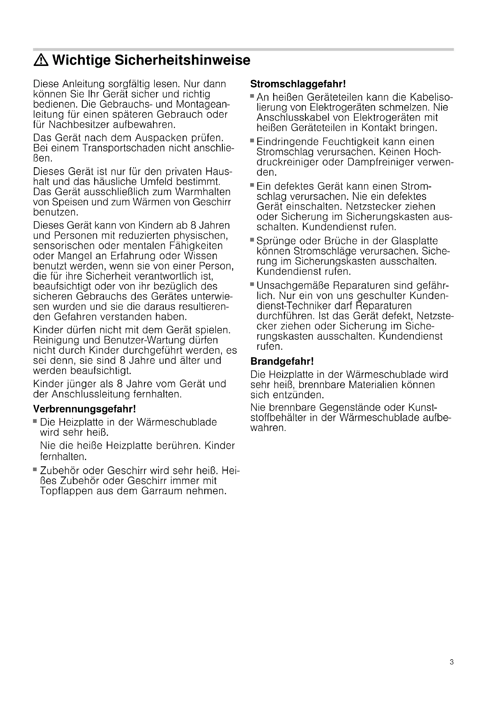 - Umweltschonende Entsorgung Produktinfo Weitere Informationen zu Produkten, Zubehör, Ersatzteilen und Services finden Sie im Internet: www.neff-international.com und Online-Shop: www.neff-eshop.com Für Produktinformationen sowie Anwendungs- und Bedienfragen wählen Sie unsere Info-Num- mer: (Mo-Fr: 8.00-18.00Uhr erreichbar) 0,14 EUR/Min aus dem Festnetz der T-Com, Mobil ggf. abweichend. Nur für Deutschland gültig.3 : Wichtige Sicherheitshinweise Diese Anleitung sorgfältig lesen. Nur dann können Sie Ihr Gerät sicher und richtig bedienen. Die Gebrauchs- und Montagean- leitung für einen späteren Gebrauch oder für Nachbesitzer aufbewahren. Das Gerät nach dem Auspacken prüfen. Bei einem Transportschaden nicht anschlie- ßen. Dieses Gerät ist nur für den privaten Haus- halt und das häusliche Umfeld bestimmt. Das Gerät ausschließlich zum Warmhalten von Speisen und zum Wärmen von Geschirr benutzen. Dieses Gerät kann von Kindern ab 8 Jahren und Personen mit reduzierten physischen, sensorischen oder mentalen Fähigkeiten oder Mangel an Erfahrung oder Wissen benutzt werden, wenn sie von einer Person, die für ihre Sicherheit verantwortlich ist, beaufsichtigt oder von ihr bezüglich des sicheren Gebrauchs des Gerätes unterwie- sen wurden und sie die daraus resultieren- den Gefahren verstanden haben. Kinder dürfen nicht mit dem Gerät spielen. Reinigung und Benutzer-Wartung dürfen nicht durch Kinder durchgeführt werden, es sei denn, sie sind 8 Jahre und älter und werden beaufsichtigt. Kinder jünger als 8 Jahre vom Gerät und der Anschlussleitung fernhalten. Verbrennungsgefahr! p. 7