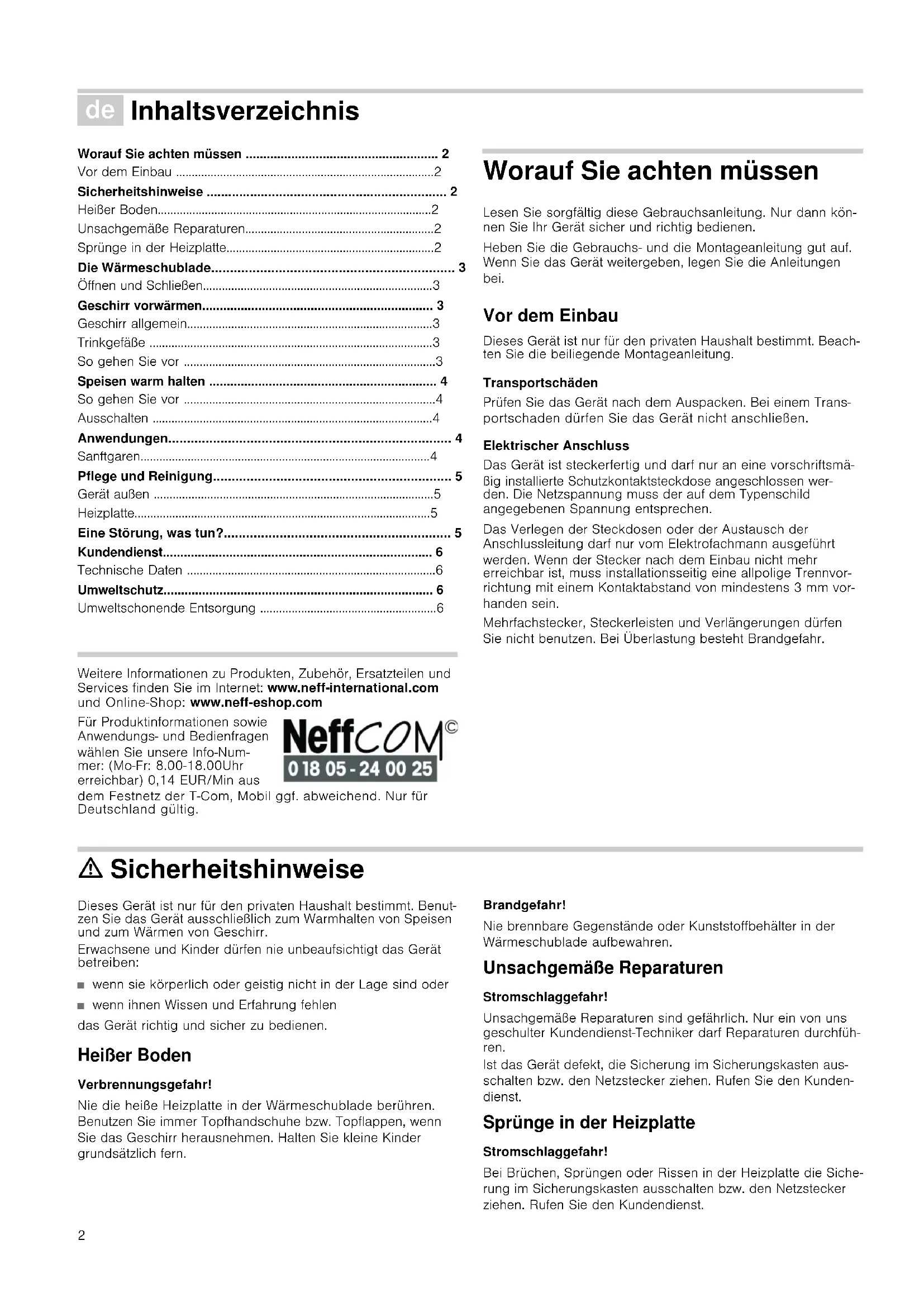 - Umweltschonende Entsorgung Produktinfo Weitere Informationen zu Produkten, Zubehör, Ersatzteilen und Services finden Sie im Internet: www.neff-international.com und Online-Shop: www.neff-eshop.com Für Produktinformationen sowie Anwendungs- und Bedienfragen wählen Sie unsere Info-Num- mer: (Mo-Fr: 8.00-18.00Uhr erreichbar) 0,14 EUR/Min aus dem Festnetz der T-Com, Mobil ggf. abweichend. Nur für Deutschland gültig. Worauf Sie achten müssen Lesen Sie sorgfältig diese Gebrauchsanleitung. Nur dann kön- nen Sie Ihr Gerät sicher und richtig bedienen. Heben Sie die Gebrauchs- und die Montageanleitung gut auf. Wenn Sie das Gerät weitergeben, legen Sie die Anleitungen bei. Vor dem Einbau Dieses Gerät ist nur für den privaten Haushalt bestimmt. Beach- ten Sie die beiliegende Montageanleitung. Transportschäden Prüfen Sie das Gerät nach dem Auspacken. Bei einem Trans- portschaden dürfen Sie das Gerät nicht anschließen. Elektrischer Anschluss Das Gerät ist steckerfertig und darf nur an eine vorschriftsmä- ßig installierte Schutzkontaktsteckdose angeschlossen wer- den. Die Netzspannung muss der auf dem Typenschild angegebenen Spannung entsprechen. Das Verlegen der Steckdosen oder der Austausch der Anschlussleitung darf nur vom Elektrofachmann ausgeführt werden. Wenn der Stecker nach dem Einbau nicht mehr erreichbar ist, muss installationsseitig eine allpolige Trennvor- richtung mit einem Kontaktabstand von mindestens 3 mm vor- handen sein. Mehrfachstecker, Steckerleisten und Verlängerungen dürfen Sie nicht benutzen. Bei Überlastung besteht Brandgefahr. ã=Sicherheitshinweise Dieses Gerät ist nur für den privaten Haushalt bestimmt. Benut- zen Sie das Gerät ausschließlich zum Warmhalten von Speisen und zum Wärmen von Geschirr. Erwachsene und Kinder dürfen nie unbeaufsichtigt das Gerät betreiben: ■ wenn sie körperlich oder geistig nicht in der Lage sind oder ■ wenn ihnen Wissen und Erfahrung fehlen das Gerät richtig und sicher zu bedienen. Heißer Boden Verbrennungsgefahr! Nie die heiße Heizplatte in der Wärmeschublade berühren. Benutzen Sie immer Topfhandschuhe bzw. Topflappen, wenn Sie das Geschirr herausnehmen. Halten Sie kleine Kinder grundsätzlich fern. Brandgefahr! Nie brennbare Gegenstände oder Kunststoffbehälter in der Wärmeschublade aufbewahren. Unsachgemäße Reparaturen Stromschlaggefahr! Unsachgemäße Reparaturen sind gefährlich. Nur ein von uns geschulter Kundendienst-Techniker darf Reparaturen durchfüh- ren. Ist das Gerät defekt, die Sicherung im Sicherungskasten aus- schalten bzw. den Netzstecker ziehen. Rufen Sie den Kunden- dienst. Sprünge in der Heizplatte Stromschlaggefahr! Bei Brüchen, Sprüngen oder Rissen in der Heizplatte die Siche- rung im Sicherungskasten ausschalten bzw. den Netzstecker ziehen. Rufen Sie den Kundendienst.3 Die Wärmeschublade In der Wärmeschublade können Sie Geschirr vorwärmen oder Speisen warm halten. Das Gerät heizt nur, wenn die Schublade richtig geschlossen ist. Öffnen und Schließen Bei Geräten ohne Griff: Drücken Sie auf die Mitte der Schublade, um sie zu öffnen oder zu schließen. Beim Öffnen springt die Schublade leicht heraus. Sie kann danach problemlos herausgezogen werden. Geschirr vorwärmen Im vorgewärmten Geschirr kühlen Speisen nicht so schnell ab. Getränke bleiben länger warm. Geschirr allgemein Die Wärmeschublade dürfen Sie mit maximal 25 kg belasten. Sie können z.B. Menügeschirr für 6 bzw. 12 Personen vorwär- men. Geschirr einräumen Verteilen Sie das Geschirr möglichst auf der ganzen Fläche. Hohe Tellerstapel werden langsamer durchwärmt als einzelne Geschirrteile, wie z.B. 2 Schüsseln. Trinkgefäße Erwärmen Sie Trinkgefäße wie z.B. Espressotassen immer mit Stufe 2. ã=Verbrennungsgefahr! Bei Stufe 3 oder 4 werden die Trinkgefäße sehr heiß. So gehen Sie vor p. 6
