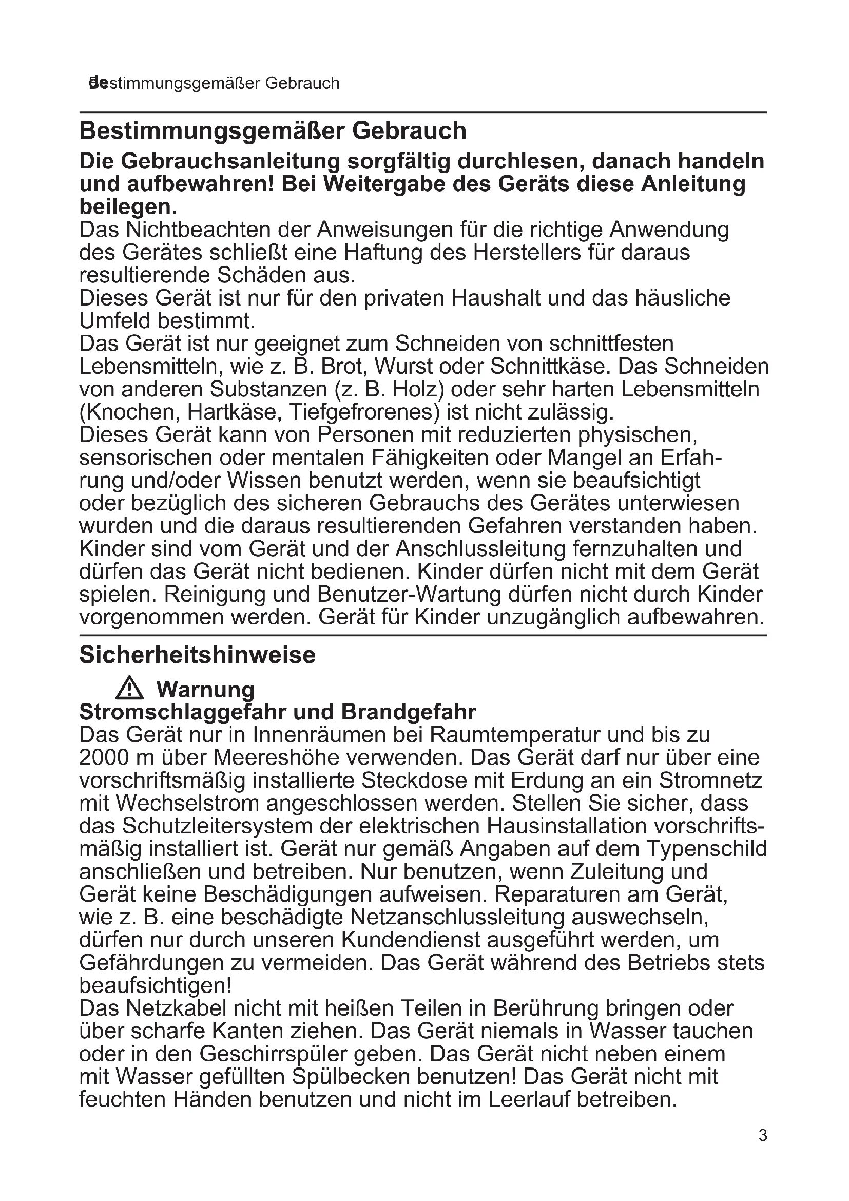 - Bestimmungsgemäßer Gebrauch Bestimmungsgemäßer Gebrauch Die Gebrauchsanleitung sorgfältig durchlesen, danach handeln und aufbewahren! Bei Weitergabe des Geräts diese Anleitung beilegen. Das Nichtbeachten der Anweisungen für die richtige Anwendung des Gerätes schließt eine Haftung des Herstellers für daraus resultierende Schäden aus. Dieses Gerät ist nur für den privaten Haushalt und das häusliche Umfeld bestimmt. Das Gerät ist nur geeignet zum Schneiden von schnittfesten Lebensmitteln, wie z. B. Brot, Wurst oder Schnittkäse. Das Schneiden von anderen Substanzen (z. B. Holz) oder sehr harten Lebensmitteln (Knochen, Hartkäse, Tiefgefrorenes) ist nicht zulässig. Dieses Gerät kann von Personen mit reduzierten physischen, sensorischen oder mentalen Fähigkeiten oder Mangel an Erfah- rung und/oder Wissen benutzt werden, wenn sie beaufsichtigt oder bezüglich des sicheren Gebrauchs des Gerätes unterwiesen wurden und die daraus resultierenden Gefahren verstanden haben. Kinder sind vom Gerät und der Anschlussleitung fernzuhalten und dürfen das Gerät nicht bedienen. Kinder dürfen nicht mit dem Gerät spielen. Reinigung und Benutzer-Wartung dürfen nicht durch Kinder vorgenommen werden. Gerät für Kinder unzugänglich aufbewahren. Sicherheitshinweise W Warnung Stromschlaggefahr und Brandgefahr Das Gerät nur in Innenräumen bei Raumtemperatur und bis zu 2000 m über Meereshöhe verwenden. Das Gerät darf nur über eine vorschriftsmäßig installierte Steckdose mit Erdung an ein Stromnetz mit Wechselstrom angeschlossen werden. Stellen Sie sicher, dass das Schutzleitersystem der elektrischen Hausinstallation vorschrifts- mäßig installiert ist. Gerät nur gemäß Angaben auf dem Typenschild anschließen und betreiben. Nur benutzen, wenn Zuleitung und Gerät keine Beschädigungen aufweisen. Reparaturen am Gerät, wie z. B. eine beschädigte Netzanschlussleitung auswechseln, dürfen nur durch unseren Kundendienst ausgeführt werden, um Gefährdungen zu vermeiden. Das Gerät während des Betriebs stets beaufsichtigen! Das Netzkabel nicht mit heißen Teilen in Berührung bringen oder über scharfe Kanten ziehen. Das Gerät niemals in Wasser tauchen oder in den Geschirrspüler geben. Das Gerät nicht neben einem mit Wasser gefüllten Spülbecken benutzen! Das Gerät nicht mit feuchten Händen benutzen und nicht im Leerlauf betreiben.4 de Sicherheitshinweise Inhalt Herzlichen Glückwunsch zum Kauf Ihres neuen Gerätes aus dem Hause Siemens. Weitere Informationen zu unseren Produkten nden Sie auf unserer Internetseite. Das Gerät muss nach jedem Gebrauch, bei nicht vorhandener Aufsicht, vor dem Zusammenbau, Auseinandernehmen oder Reinigen und im Fehlerfall stets vom Netz getrennt werden. Vor dem Auswechseln von Zubehör oder Zusatzteilen, die im Betrieb bewegt werden, muss das Gerät ausgeschaltet und vom Netz getrennt werden. W Warnung Verletzungsgefahr Das Messer ist sehr scharf. Hände nie in die Nähe des Messers bringen. Nach dem Ausschalten läuft der Antrieb kurze Zeit nach. Stillstand des Messers abwarten! Nach der Arbeit Schnittbreite auf 0 stellen. Dieses Gerät muss mit Schlitten und Restehalter in Gebrauchslage benutzt werden, es sei denn, die Größe und Form des Schneidgutes lassen deren Gebrauch nicht zu. Vor dem Reinigen Netzstecker ziehen und Messer abnehmen. Messer nicht an der Schnittäche, sondern nur an der Messer- halterung anfassen. Bei Stromausfall bleibt das Gerät eingeschaltet und läuft danach wieder an. W Achtung Motor kann überhitzen! Gerät nach max. 10 Minuten ununter- brochenem Betrieb abkühlen lassen. W Warnung Erstickungsgefahr Kinder nicht mit dem Verpackungsmaterial spielen lassen. Bestimmungsgemäßer Gebrauch p. 3