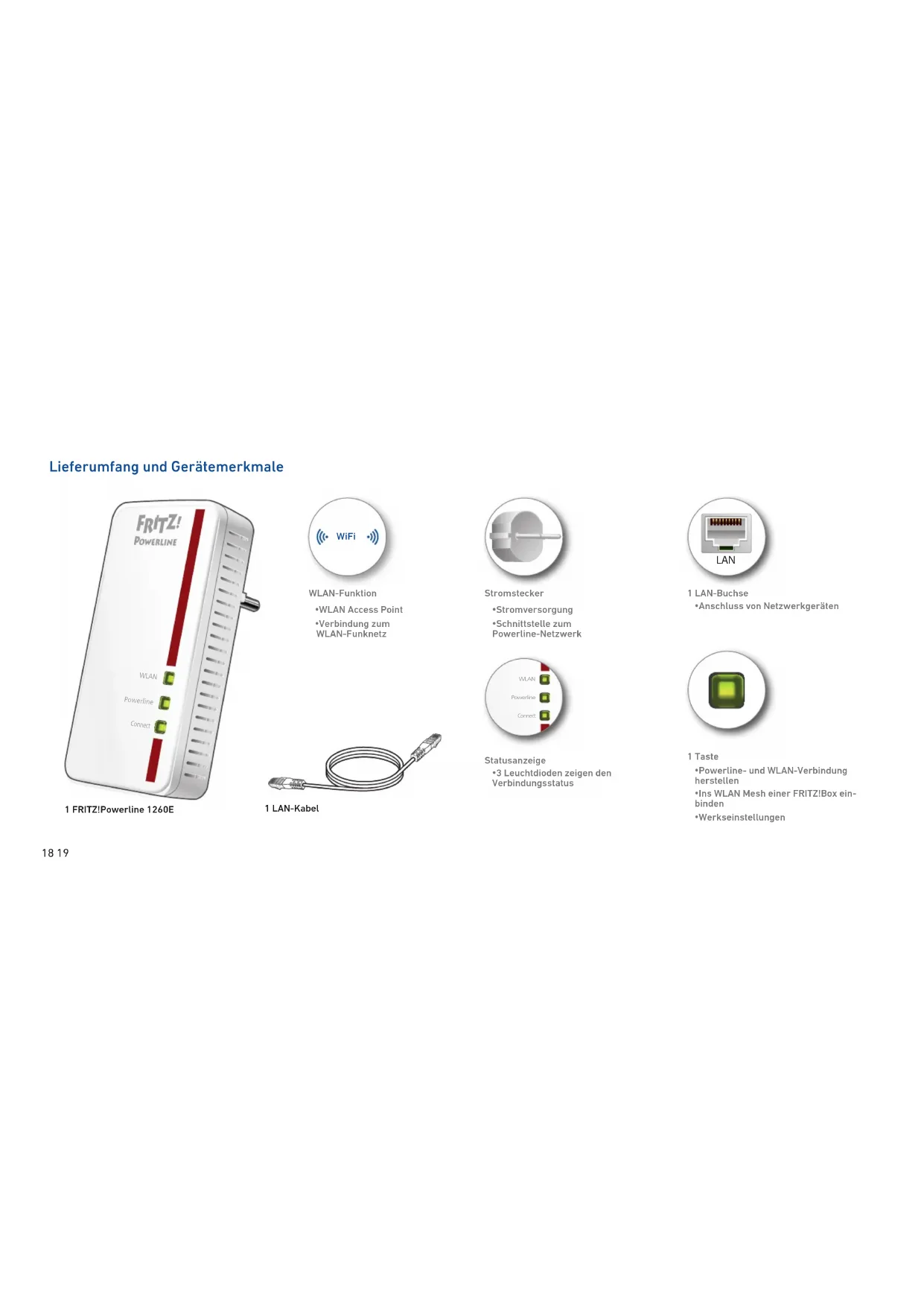 WPS Info WiFiWiFi 26 27Datenrate optimieren Ein Powerline-Netzwerk wird durch viele Faktoren beeinfl usst. Mit folgenden Schritten können Sie zu einer guten Datenrate in Ihrem Powerline-Netzwerk beitragen: Stecken Sie Powerline-Geräte direkt in Wandsteckdosen und vermeiden Sie den Einsatz von Mehrfachsteckdosen. Wenn sich der Einsatz einer Mehrfachsteckdose nicht vermeiden lässt: – Verwenden Sie eine Mehrfachsteckdose ohne Überspannungsschutz. – Schließen Sie möglichst wenige Geräte an der Mehrfachsteckdose an. – Stecken Sie Ihr Powerline-Gerät in den vorderen Steckplatz direkt am Kabel. Wenn sich der Einsatz einer Mehrfachsteckdose mit Überspannungsschutz nicht vermeiden lässt, sollte sich der Überspannungsschutz hinter dem Powerline-Gerät befi nden. Die Datenrate im Powerline-Netzwerk sinkt bei: – einer Verbindung über mehrere Phasen – einer Verbindung über eine Verteilerdose, einen FI-Schutzschalter, einen Dimmer oder Vorschaltgeräte – Einsatz einer Bohrmaschine oder eines Staubsaugers Versuchen Sie, diese Einfl üsse zu minimieren. Optimieren Sie die Qualität Ihres Powerline-Netzwerks mit dem Programm AVM FRITZ!Powerline, das Sie unter avm.de/powerline herunterladen können. Höhe x Breite x Tiefe (in mm): 132,3x 67x 69,3 / 32,5 (mit/ohne Stecker) 230V, 50Hz A/C 0°C bis +40°C Durchschnittliche Leistungsaufnahme: ca. 6,7 W Gewicht: 186g erweitert Ihr Heimnetz über die Strom- leitung in Ihrem Haushalt (Powerline) Powerline-Übertragung bis zu 1200MBit/s (brutto) durch 2 x 2 MIMO- Technik Powerline-Verbindung per Tasten- druck; sicher verschlüsselt mit AES- 128-Bit WLAN AC bis 866 MBit/s im 5-GHz- Band, verbindet Computer, Tablet, Smartphone, Drucker und andere Netzwerkgeräte WLAN N bis 400 MBit/s im 2,4-GHz- Band WLAN-Sicherheit mit WPA2, einfache Einrichtung mit WPS per Tastendruck WLAN-Reichweitenverlängerung (Re- peaterfunktion) einstellbar 1 x Gigabit Ethernet (1000MBit/s) für den Anschluss von TV, Blue-ray, HiFi, Spielekonsole Standardisiert nach HomePlug AV2, kompatibel mit IEEEP1901 Funktioniert mit anderen marktüblichen Powerline-Adaptern eigene Benutzeroberfl äche: http://fritz.powerline Funkfrequenzen und Sendeleistung WLAN 2,4 GHz Bereich: 2,4 GHz – 2,483GHz, maximal 100 mW WLAN 5 GHz Bereich: 5,15 GHz – 5,35GHz, maximal 200 mW sowie 5,47GHz – 5,725GHz, maximal 1000 mW Im 5-GHz-Band für WLAN ist der Be- reich von 5,15 GHz bis 5,35 GHz nur für den Betrieb in geschlossenen Räumen bestimmt. Diese Beschränkung oder Anforderung gilt in den EU-Mitglieds- staaten AT, BE, BG, CY, CZ, DE, DK, EE, EL, ES, FI, FR, HR, HU, IE, IT, LT, LU, LV, MT, NL, PL, PT, RO, SE, SI, SK, UK. Technische Daten 2928Rechtliches Rechtliche Hinweise und geltende Lizenz- bestimmungen fi nden Sie in der Benutzer- oberfl äche unter Hilfe / Rechtliche Hinweise. Diagnose und Wartung Der FRITZ!Powerline 1260E übermittelt Diagnosedaten an AVM, die uns bei der Weiterentwicklung des Produkts unter- stützen. Sie profi tieren damit direkt von Optimierungen und FRITZ!OS-Updates. Nähere Informationen fi nden Sie in der Hilfe der Benutzeroberfl äche unter http://fritz.powerline. Entsorgung FRITZ!Powerline 1260E und Kabel dürfen gemäß europäischen Vorgaben und deutschem Elektro- und Elektronikgesetz (ElektroG) nicht über den Hausmüll ent- sorgt werden. Bitte bringen Sie sie nach der Verwendung zu den Sammelstellen der Kommune. CE-Erklärung Hiermit erklärt AVM, dass sich das Gerät in Übereinstimmung mit den grundle- genden Anforderungen und den anderen relevanten Vorschriften der Richtlini- en 2014/53/EU, 2009/125/EG sowie 2011/65/EU befi ndet. Die Langfassung der CE-Konformitätser- klärung fi nden Sie in englischer Sprache unter http://en.avm.de/ce. Herstellergarantie Wir bieten Ihnen als Hersteller dieses Originalprodukts 5 Jahre Garantie auf die Hard- ware. Die Garantiezeit beginnt mit dem Kaufdatum durch den Erst-Endabnehmer. Sie kön- nen die Einhaltung der Garantiezeit durch Vorlage der Originalrechnung oder vergleich- barer Unterlagen nachweisen. Ihre Gewährleistungsrechte aus dem Kaufvertrag sowie gesetzliche Rechte werden durch diese Garantie nicht eingeschränkt. Wir beheben innerhalb der Garantiezeit auftretende Mängel des Produkts, die nach- weislich auf Material- oder Fertigungsfehler zurückzuführen sind. Leider müssen wir Mängel ausschließen, die infolge nicht vorschriftsmäßiger Installation, unsachgemäßer Handhabung, Nichtbeachtung des Handbuchs, normalen Verschleißes oder Defekten in der Systemumgebung (Hard- oder Software Dritter) auftreten. Wir können zwischen Nachbesserung und Ersatzlieferung wählen. Andere Ansprüche als das in diesen Garan- tiebedingungen genannte Recht auf Behebung von Produktmängeln werden durch diese Garantie nicht begründet. Wir garantieren Ihnen, dass die Software den allgemeinen Spezifi kationen entspricht, nicht aber, dass die Software Ihren individuellen Bedürfnissen entspricht. Versandkosten werden Ihnen nicht erstattet. Ausgetauschte Produkte gehen wieder in unser Eigentum über. Garantieleistungen bewirken weder eine Verlängerung noch einen Neubeginn der Garantiezeit. Sollten wir einen Garantieanspruch ablehnen, so verjährt dieser spätestens sechs Monate nach unserer Ablehnung. Für diese Garantie gilt deutsches Recht unter Ausschluss des Übereinkommens der Ver- einten Nationen über Verträge über den internationalen Warenkauf (CISG). 3130Embalaje y características del dispositivo 1 puerto de conexión LAN