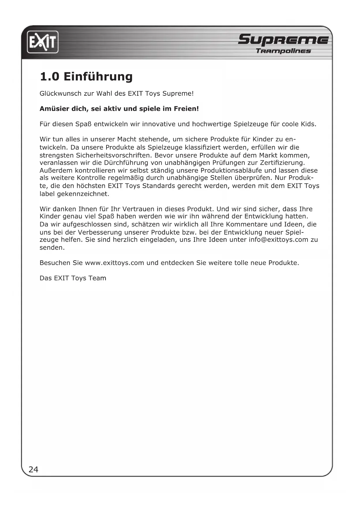 Wir danken Ihnen für Ihr Vertrauen in diesen Produkt. Und wir sind sicher, dass ihre Kinder genau viel Spaß haben werden wie wir ihn während der Entwicklung hatten. Da wir aufgeschlossen sind, schätzen wir wirklich all ihre Kommentare und Ideen, die uns bei der Verbesserung unserer Produkte bzw. bei der Entwicklung neuer Spiel-zeuge halten. Sie sind herzlich eingeladen, uns ihre Ideen unter info@exittoys.com zu senden.