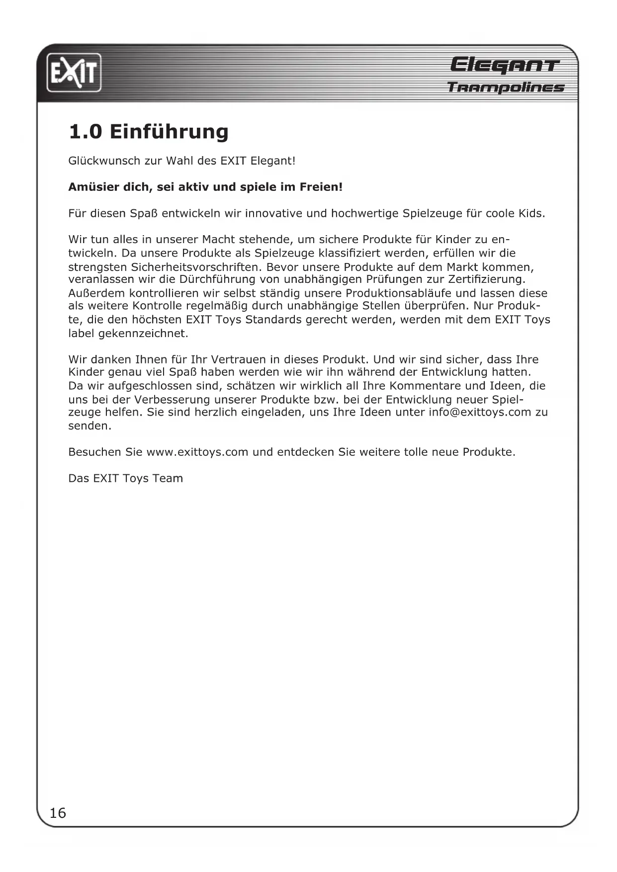 Wir danken Ohnen für Ihr Vertrauen in diesen Produkt. Und wir sind sicher, dass ihre Kinder bereits viel Spaß haben werden wie wir ihn während der Entwicklung hatten. Da wir aufgeschlossen sind, schätzen wir wirklich all ihre Kommentare und Ideen, die uns bei der Verbesserung unserer Produkte bzw. bei der Entwicklung neuer Spiel-zeuge halten. Sie sind herzlich eingeladen, uns ihre Ideen unter info@exittoys.com zu halten.